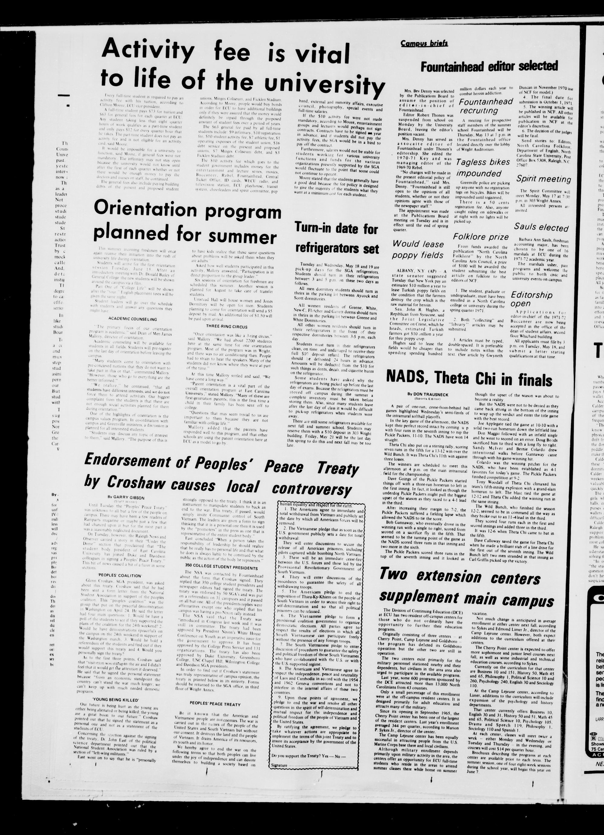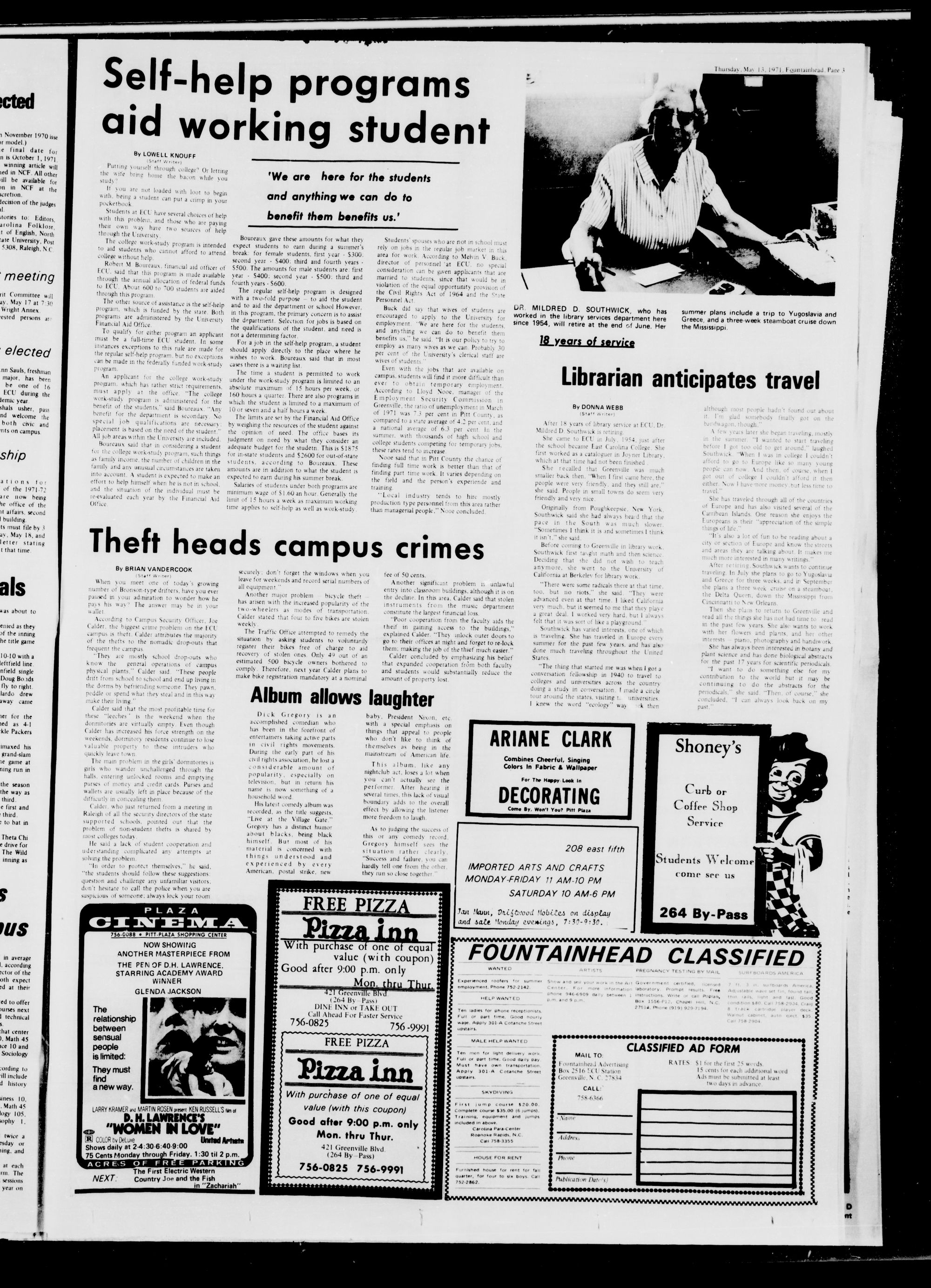 East Carolina's student-run campus newspaper was first published in 1923 as the East Carolina Teachers College News (1923-1925). It has been re-named as The Teco Echo (1925, 1926-1952), East Carolinian (1952-1969), Fountainhead (1969-1979), and The East Carolinian (1969, 1979-present). It includes local, state, national, and international stories with a focus on campus events.