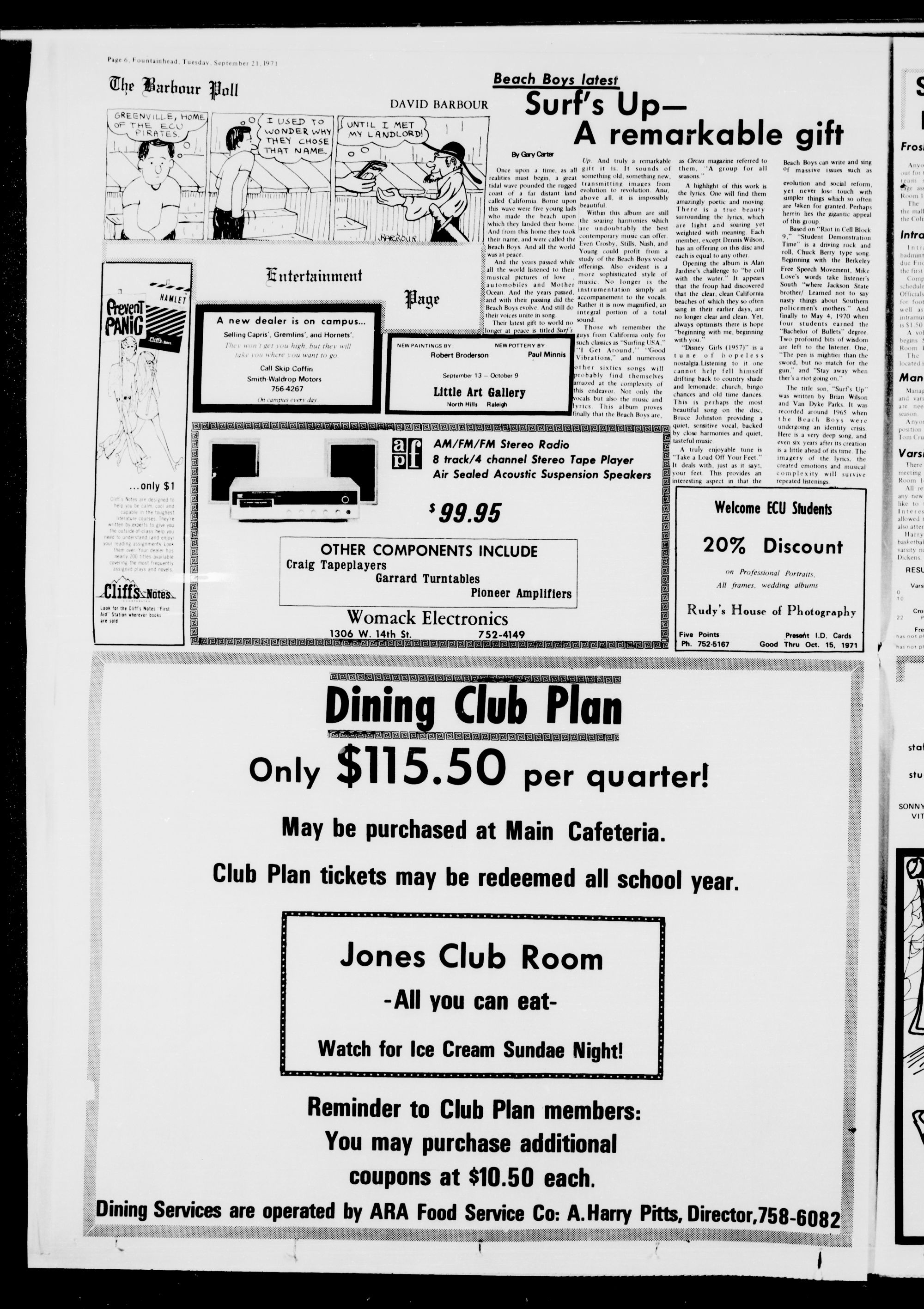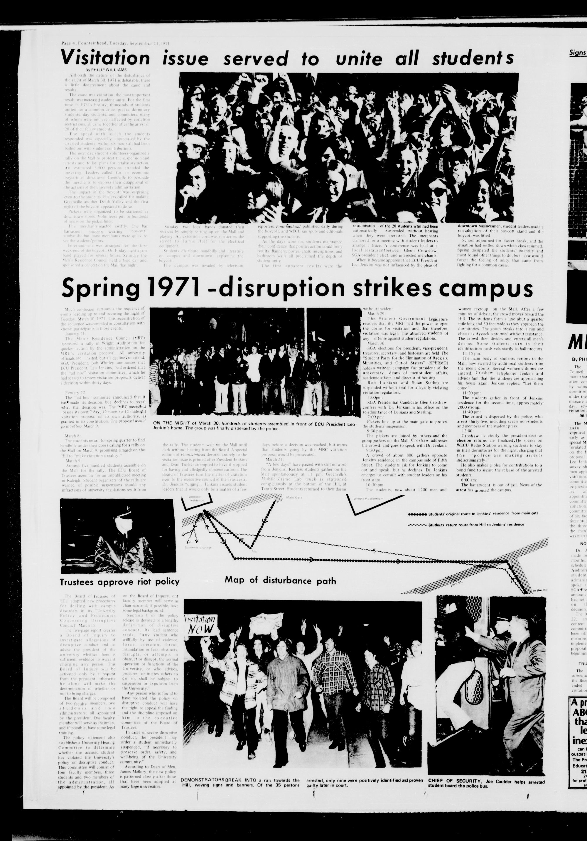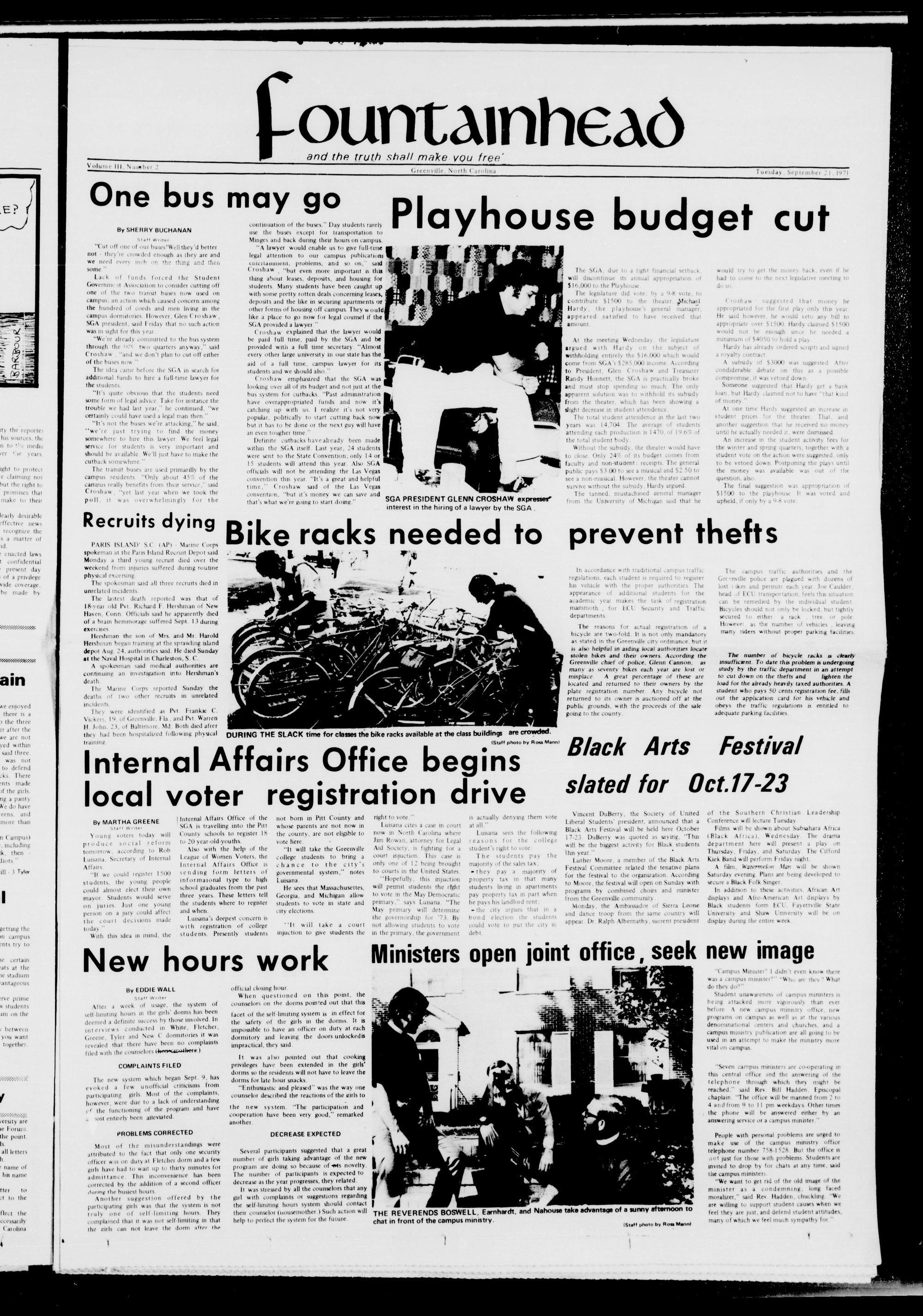 East Carolina's student-run campus newspaper was first published in 1923 as the East Carolina Teachers College News (1923-1925). It has been re-named as The Teco Echo (1925, 1926-1952), East Carolinian (1952-1969), Fountainhead (1969-1979), and The East Carolinian (1969, 1979-present). It includes local, state, national, and international stories with a focus on campus events.