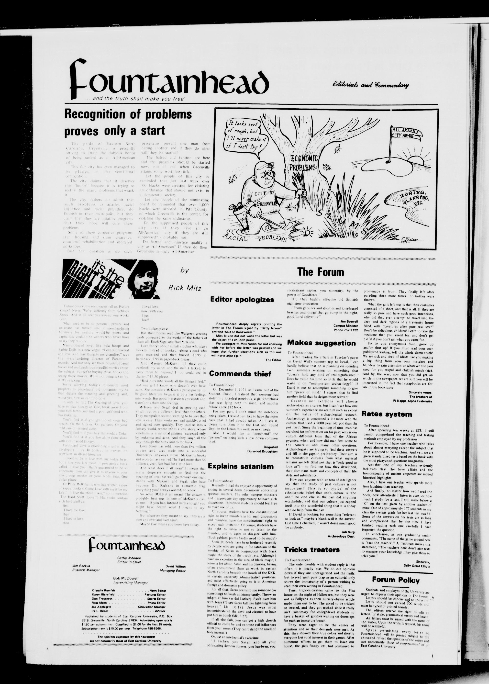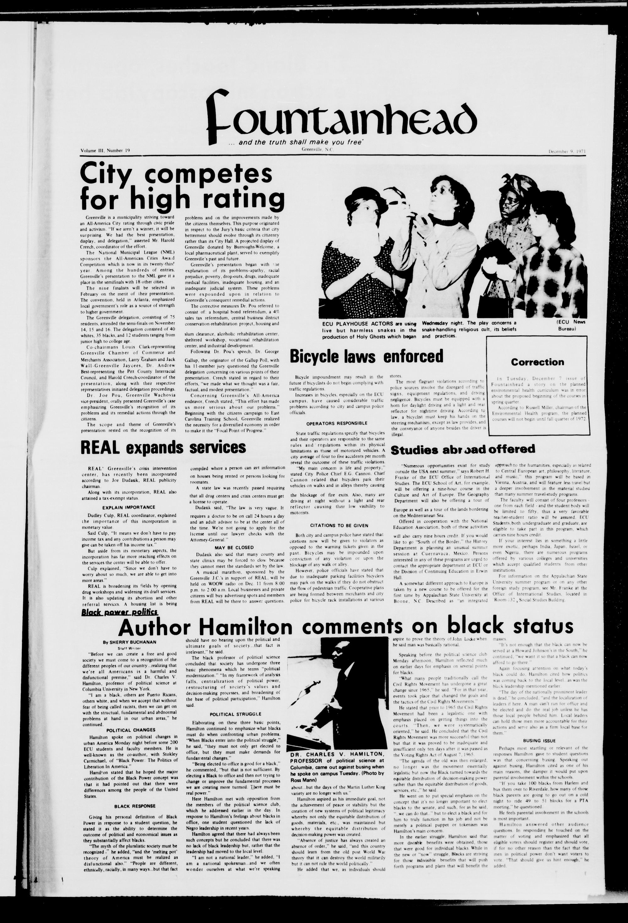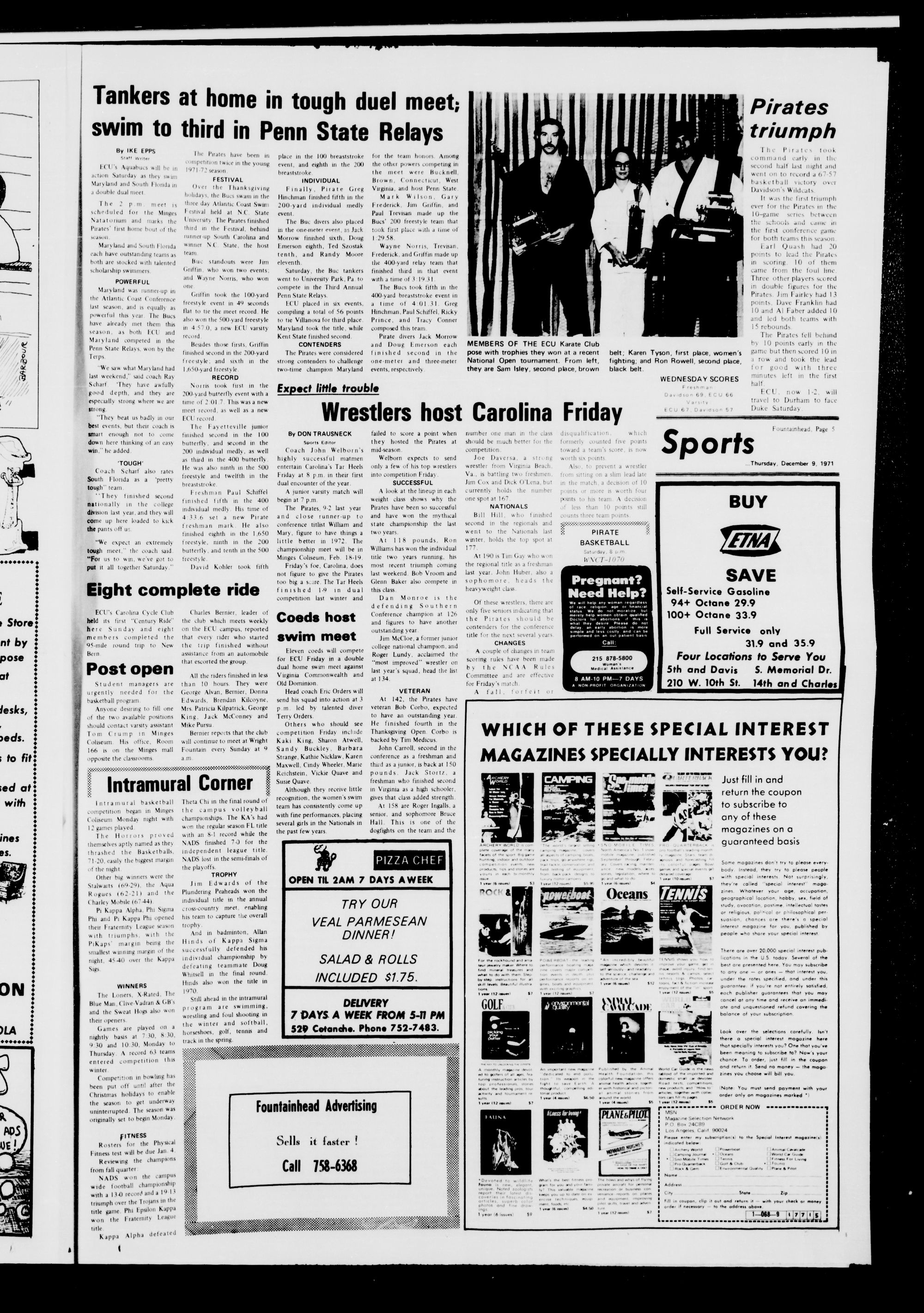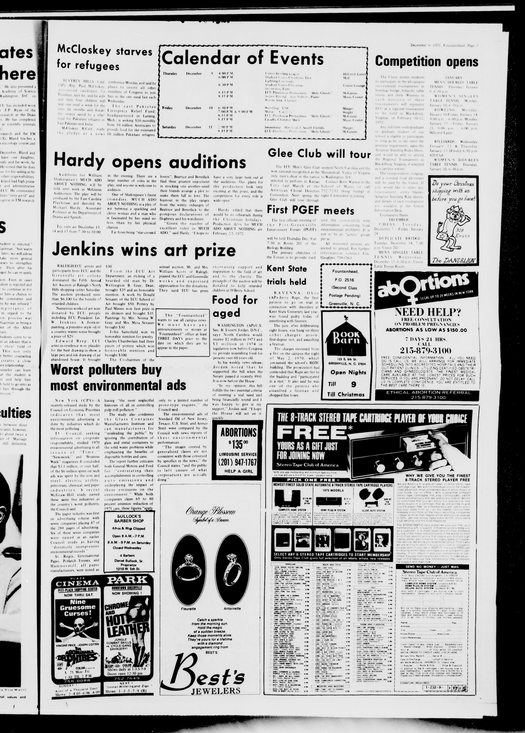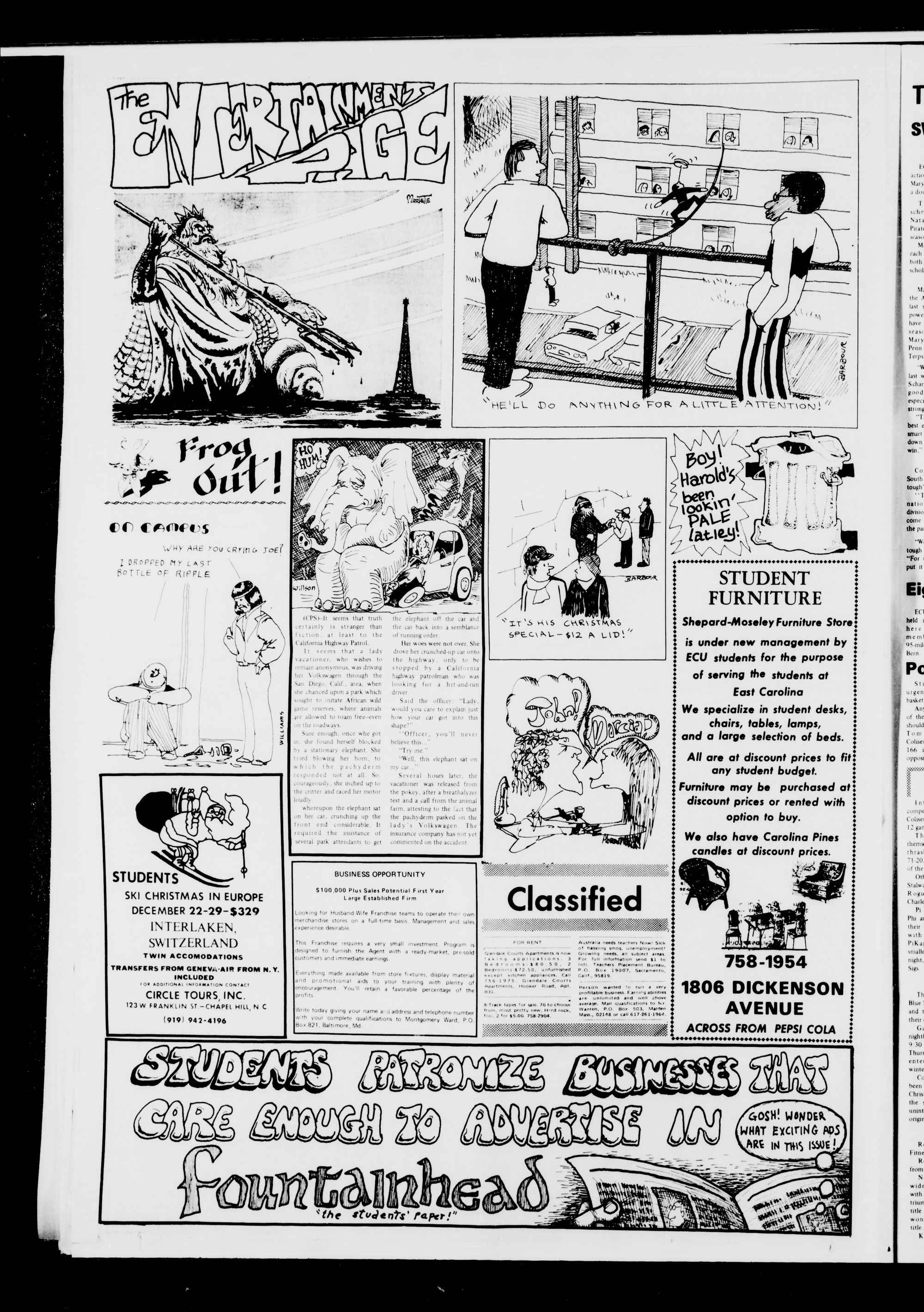East Carolina's student-run campus newspaper was first published in 1923 as the East Carolina Teachers College News (1923-1925). It has been re-named as The Teco Echo (1925, 1926-1952), East Carolinian (1952-1969), Fountainhead (1969-1979), and The East Carolinian (1969, 1979-present). It includes local, state, national, and international stories with a focus on campus events.