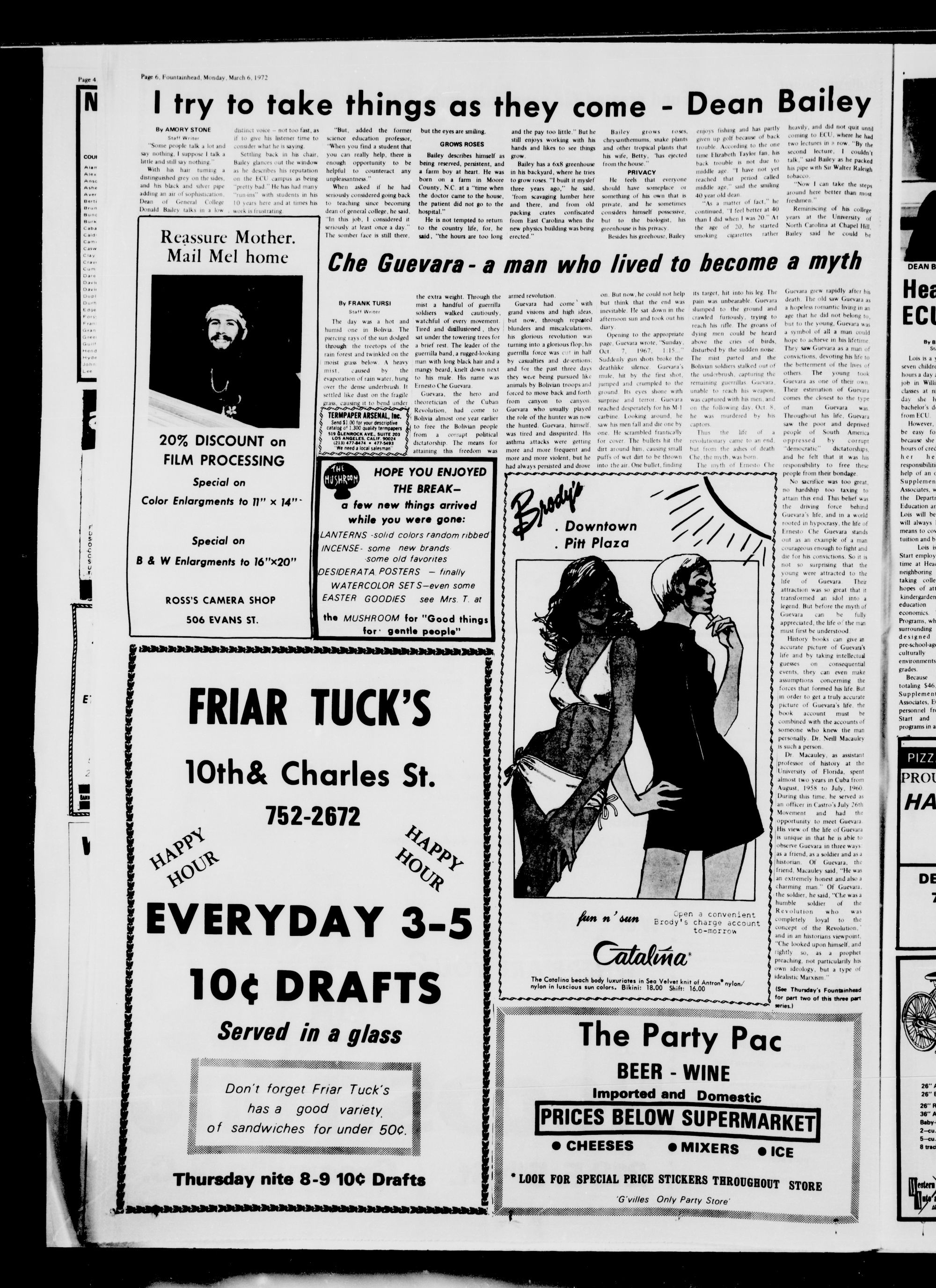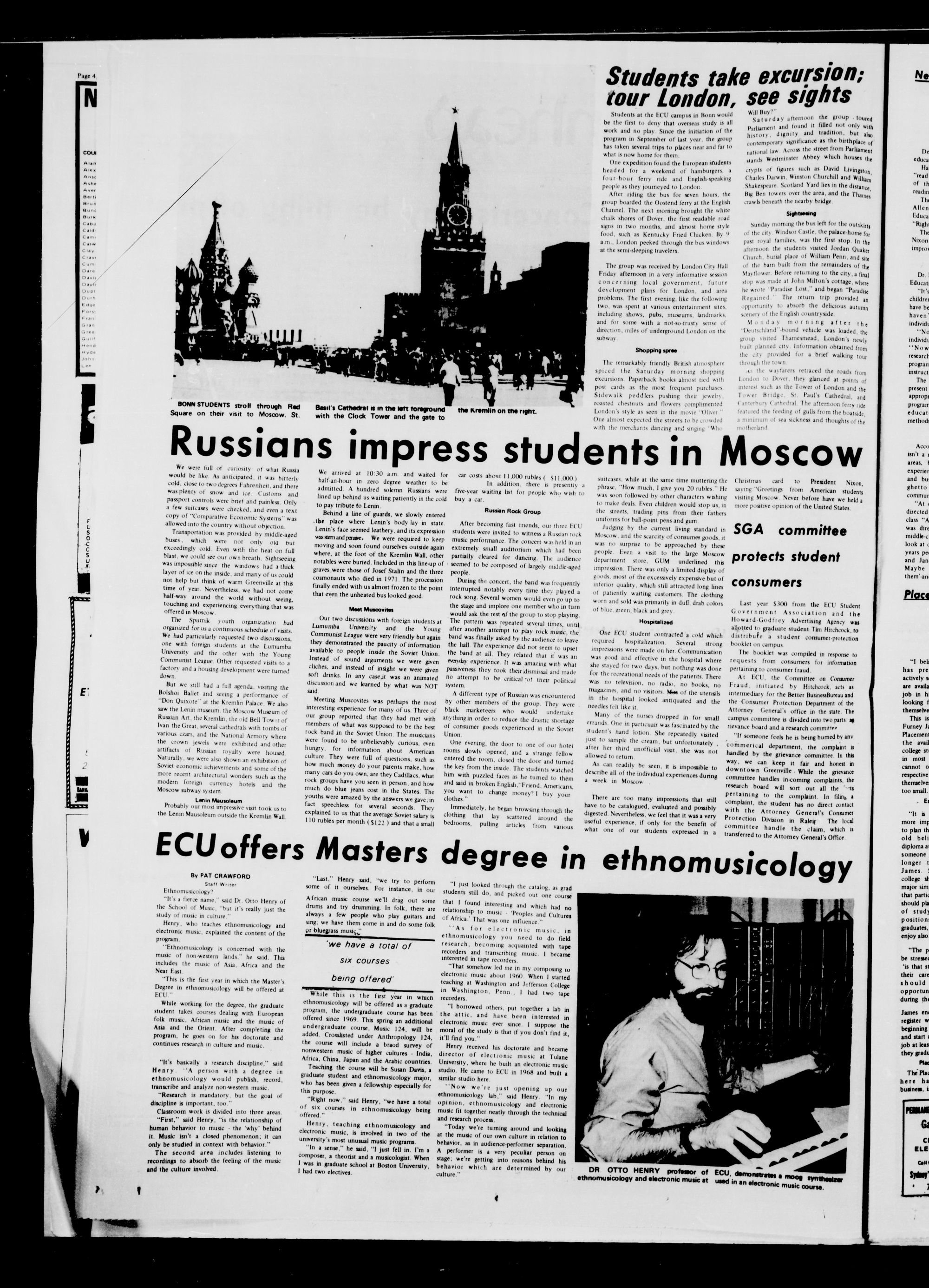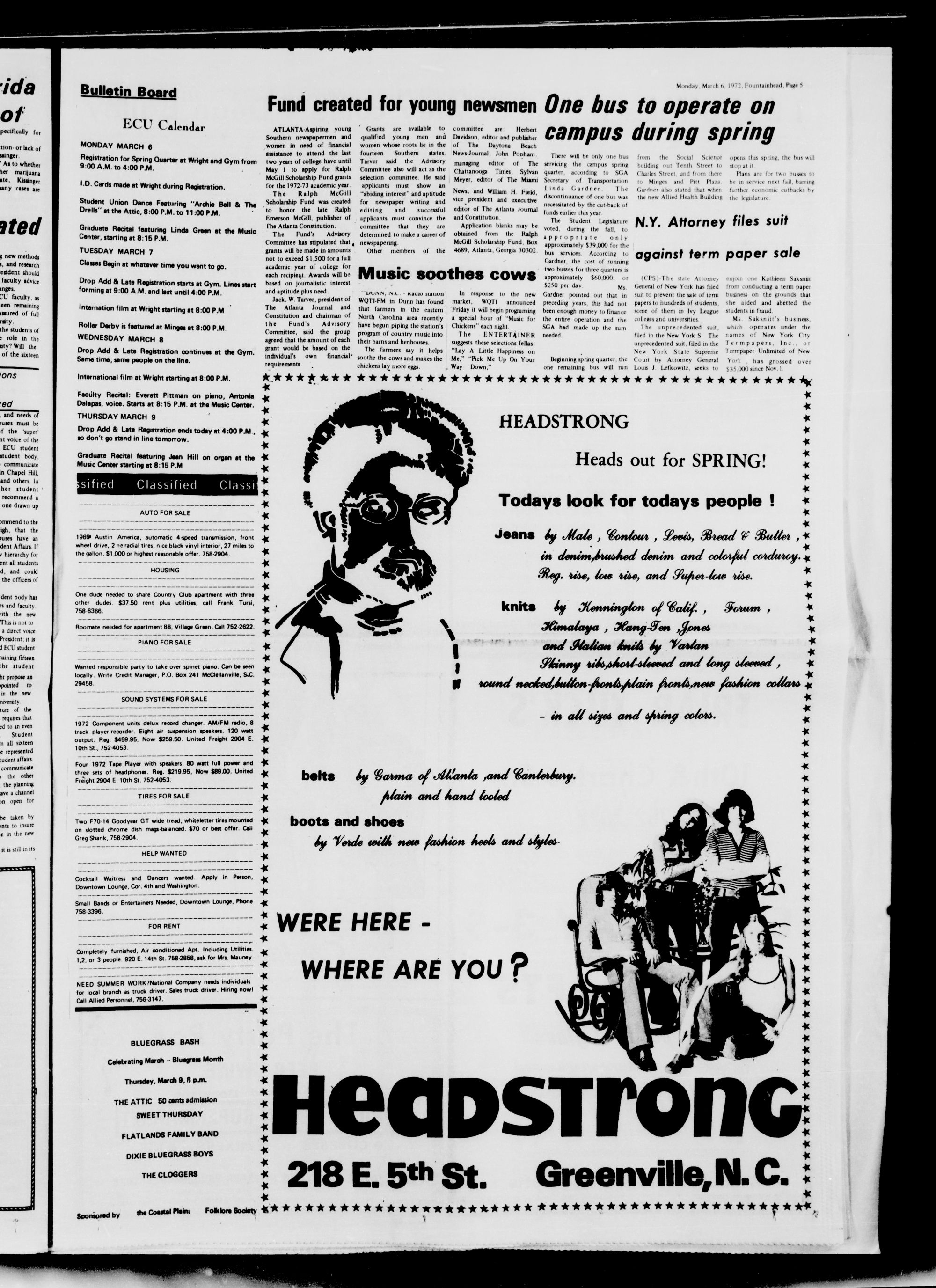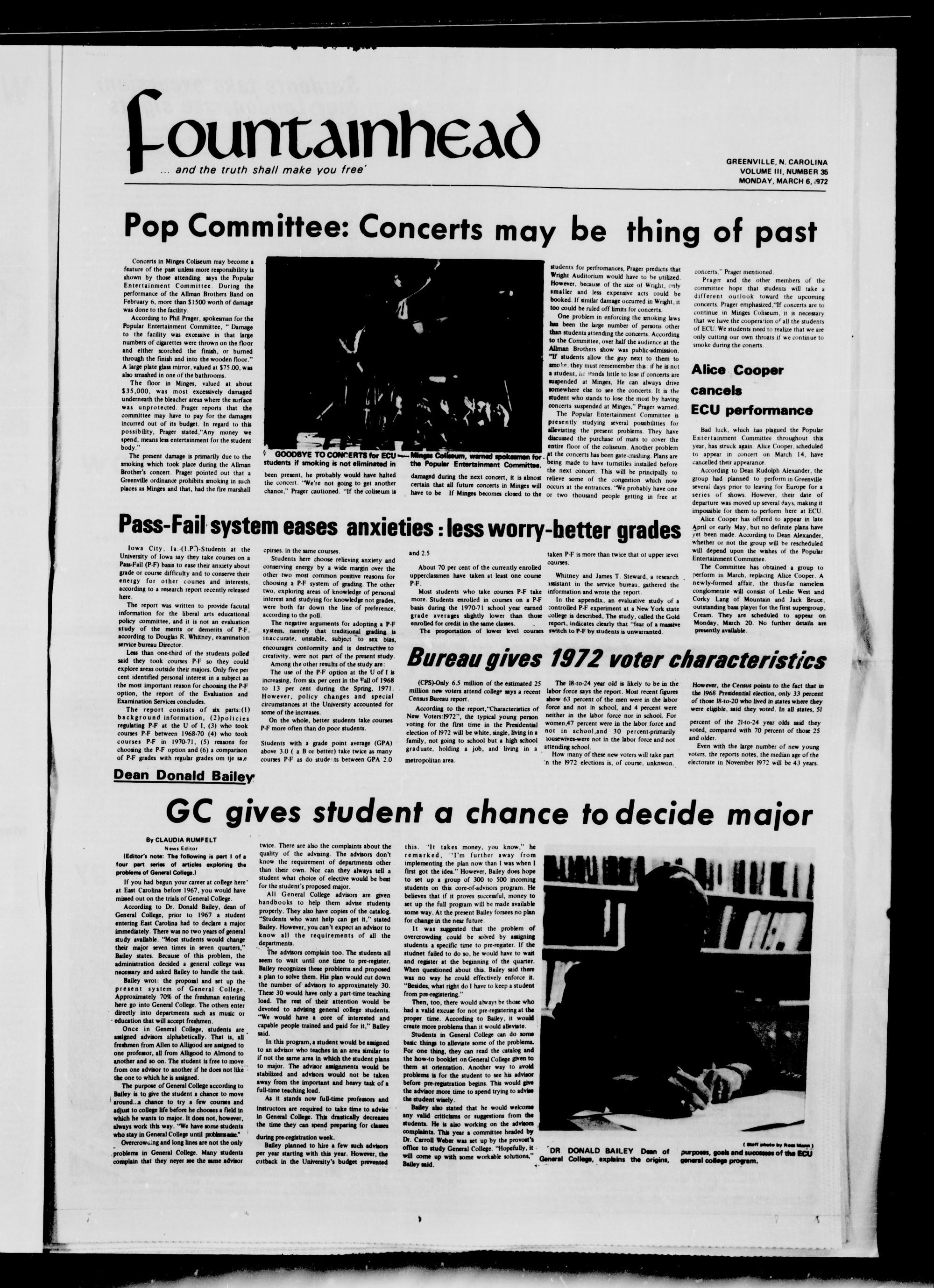 East Carolina's student-run campus newspaper was first published in 1923 as the East Carolina Teachers College News (1923-1925). It has been re-named as The Teco Echo (1925, 1926-1952), East Carolinian (1952-1969), Fountainhead (1969-1979), and The East Carolinian (1969, 1979-present). It includes local, state, national, and international stories with a focus on campus events.