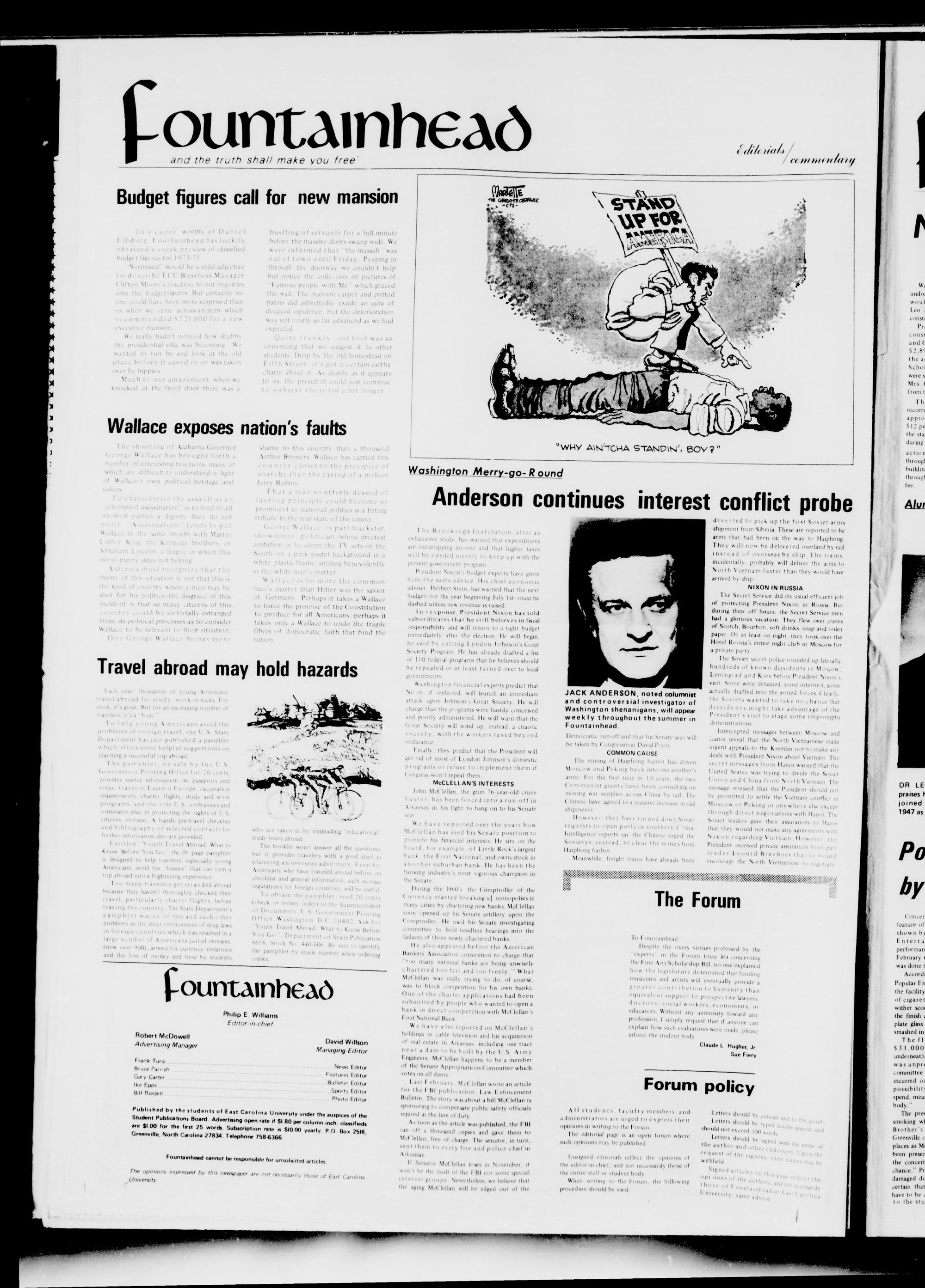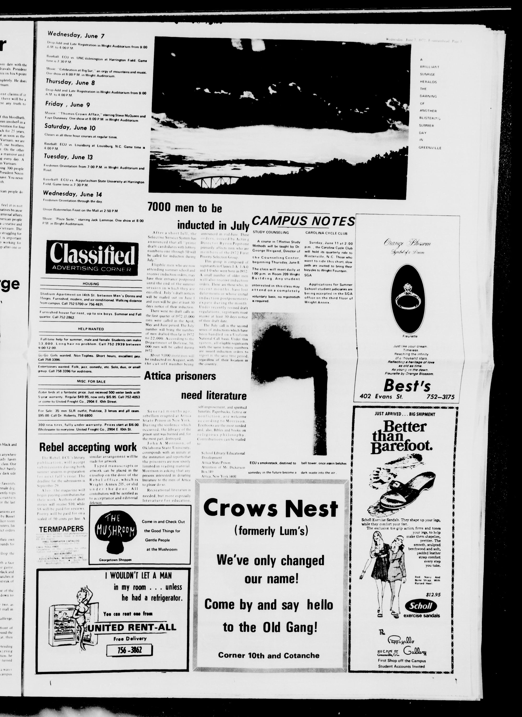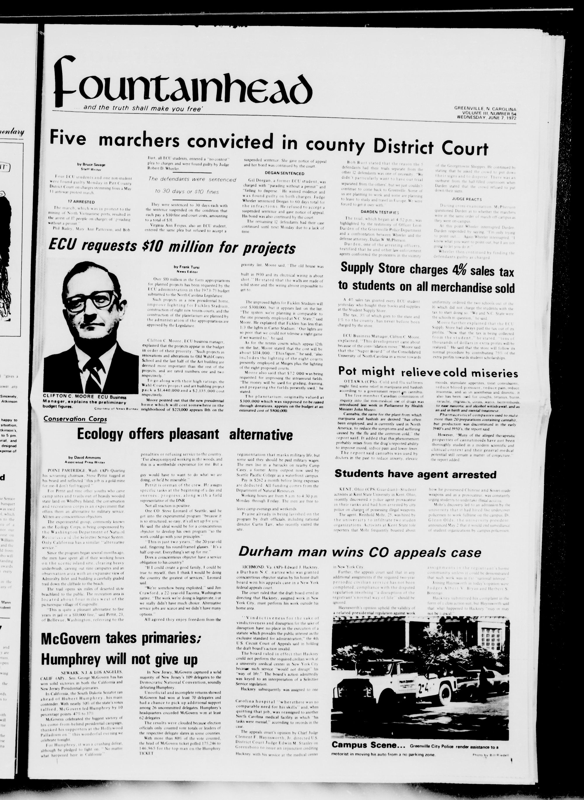 East Carolina's student-run campus newspaper was first published in 1923 as the East Carolina Teachers College News (1923-1925). It has been re-named as The Teco Echo (1925, 1926-1952), East Carolinian (1952-1969), Fountainhead (1969-1979), and The East Carolinian (1969, 1979-present). It includes local, state, national, and international stories with a focus on campus events.