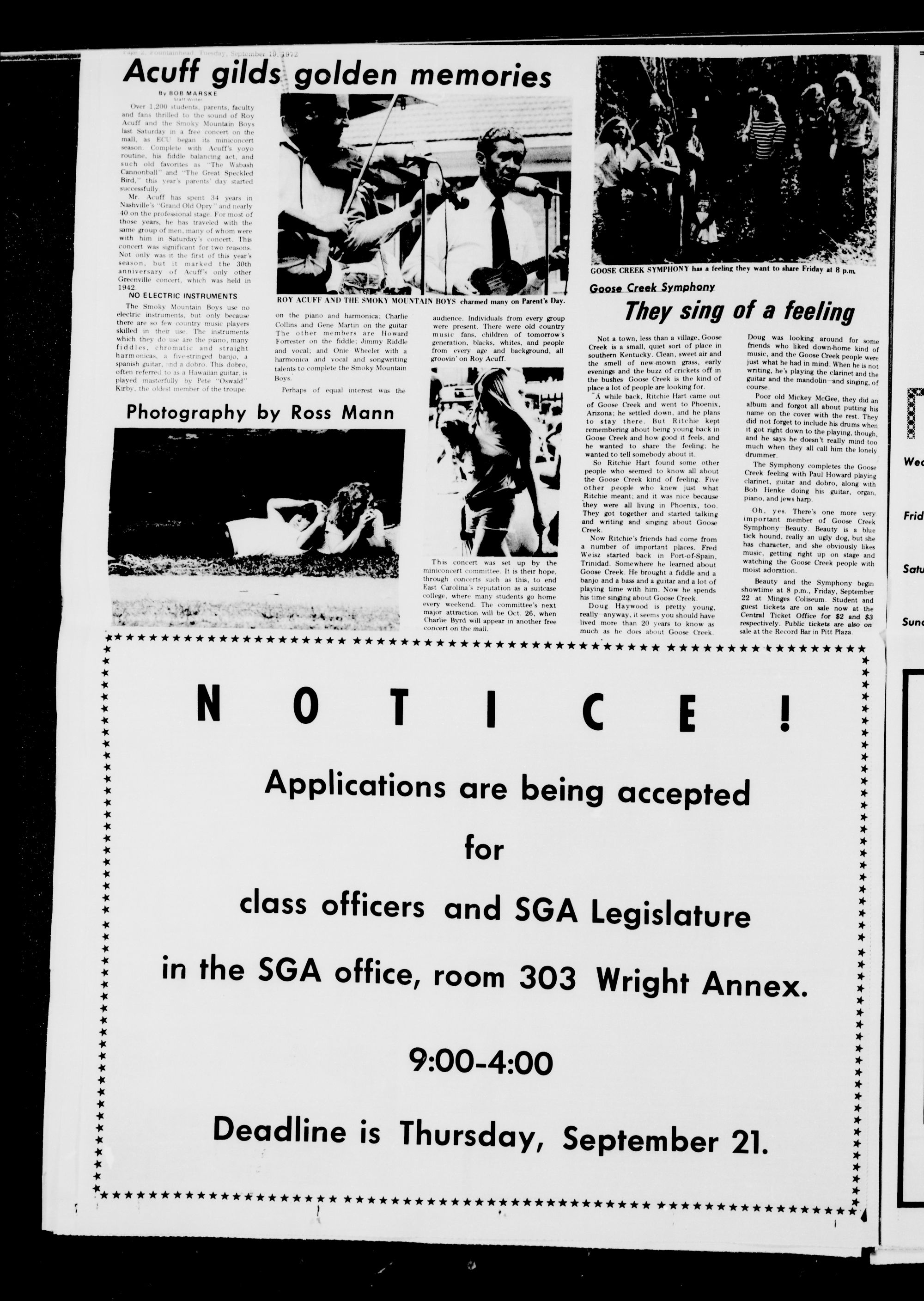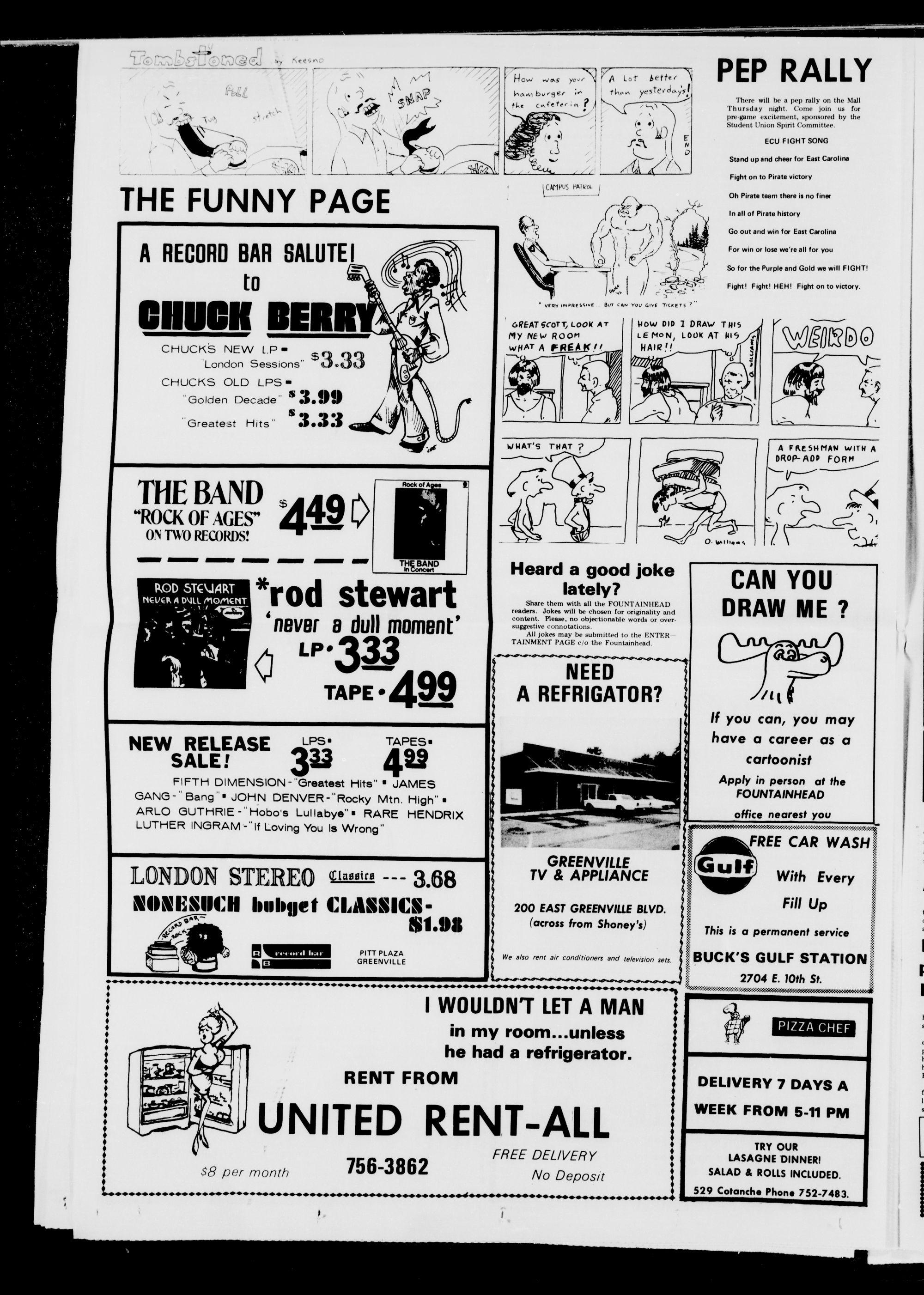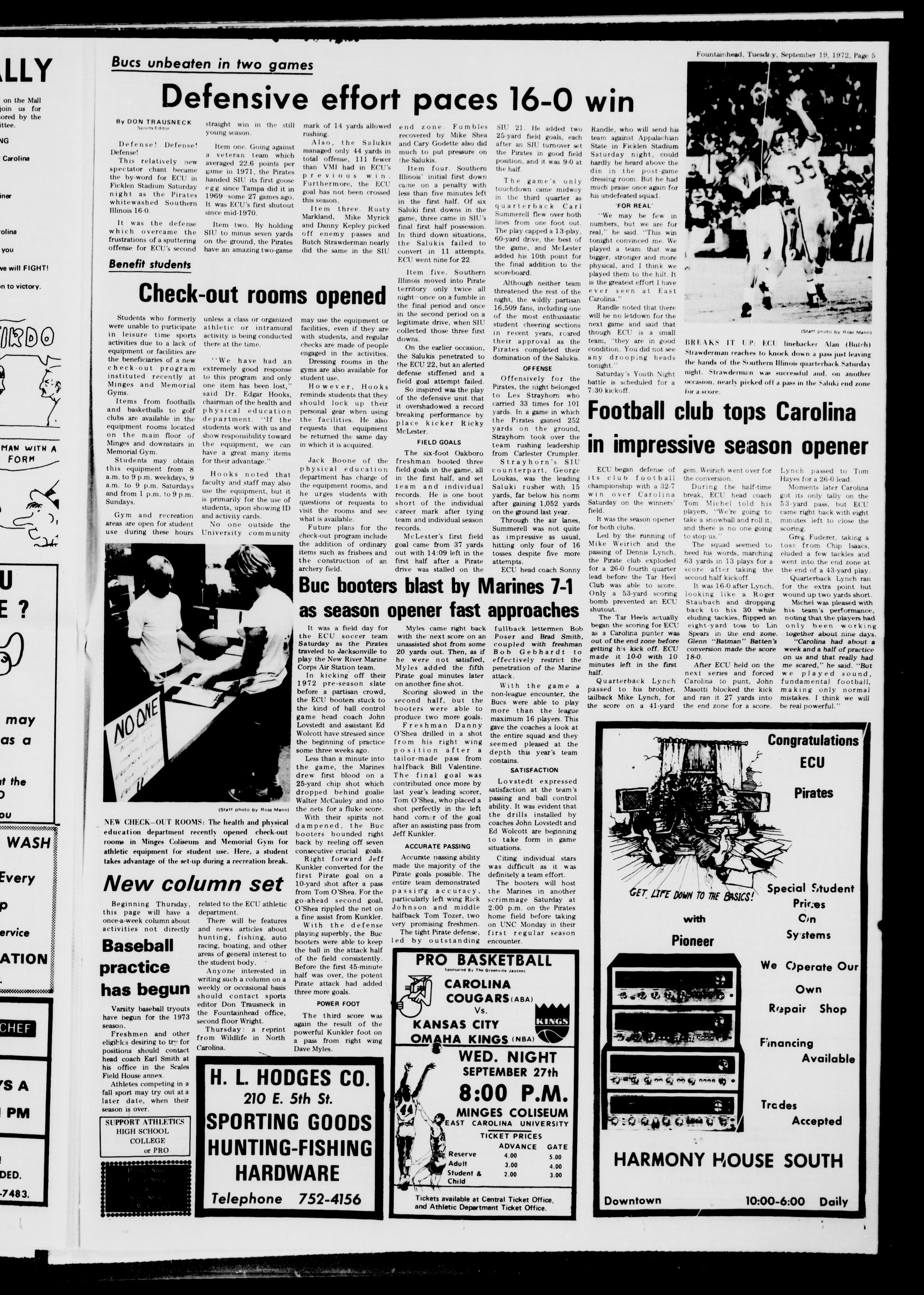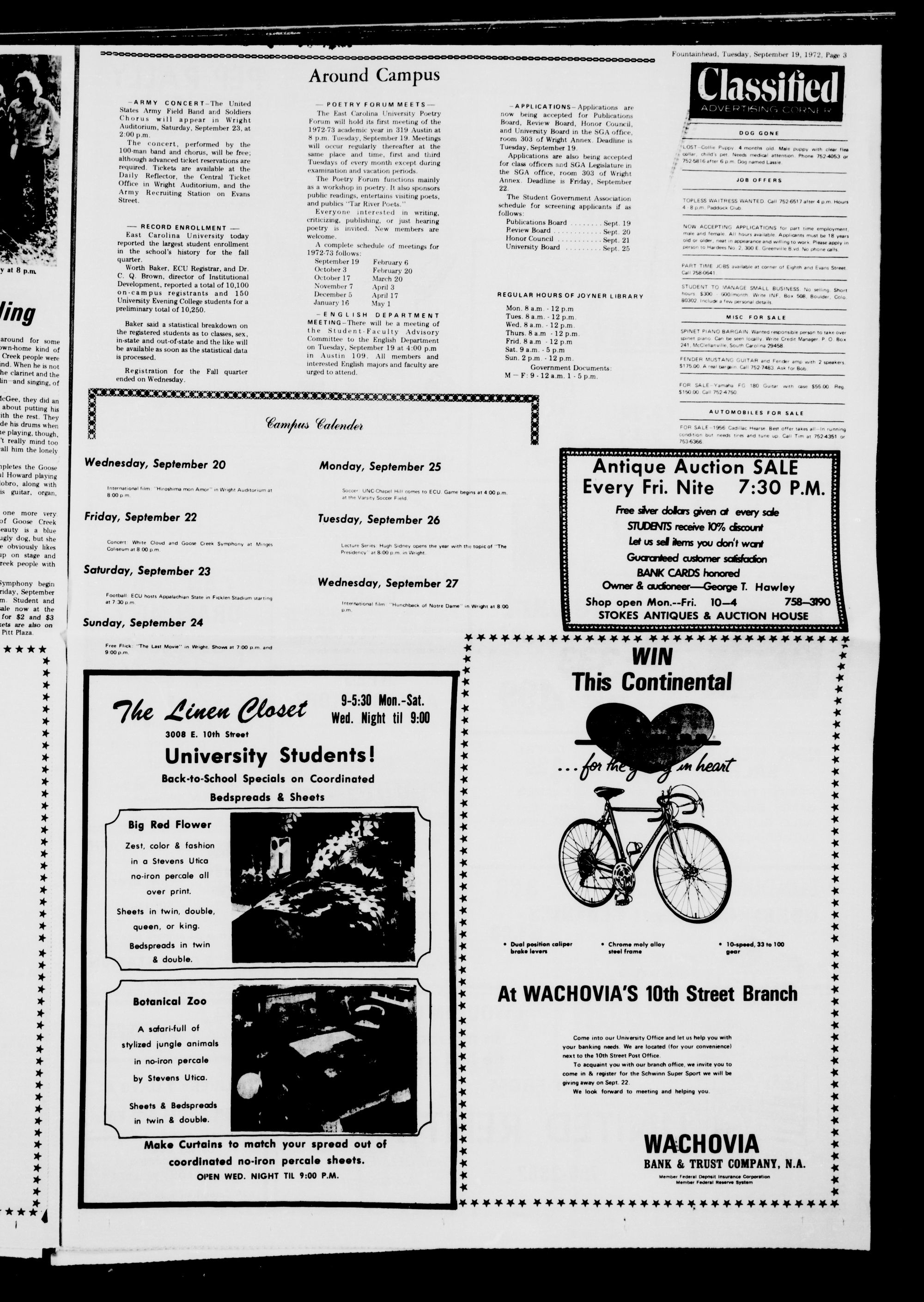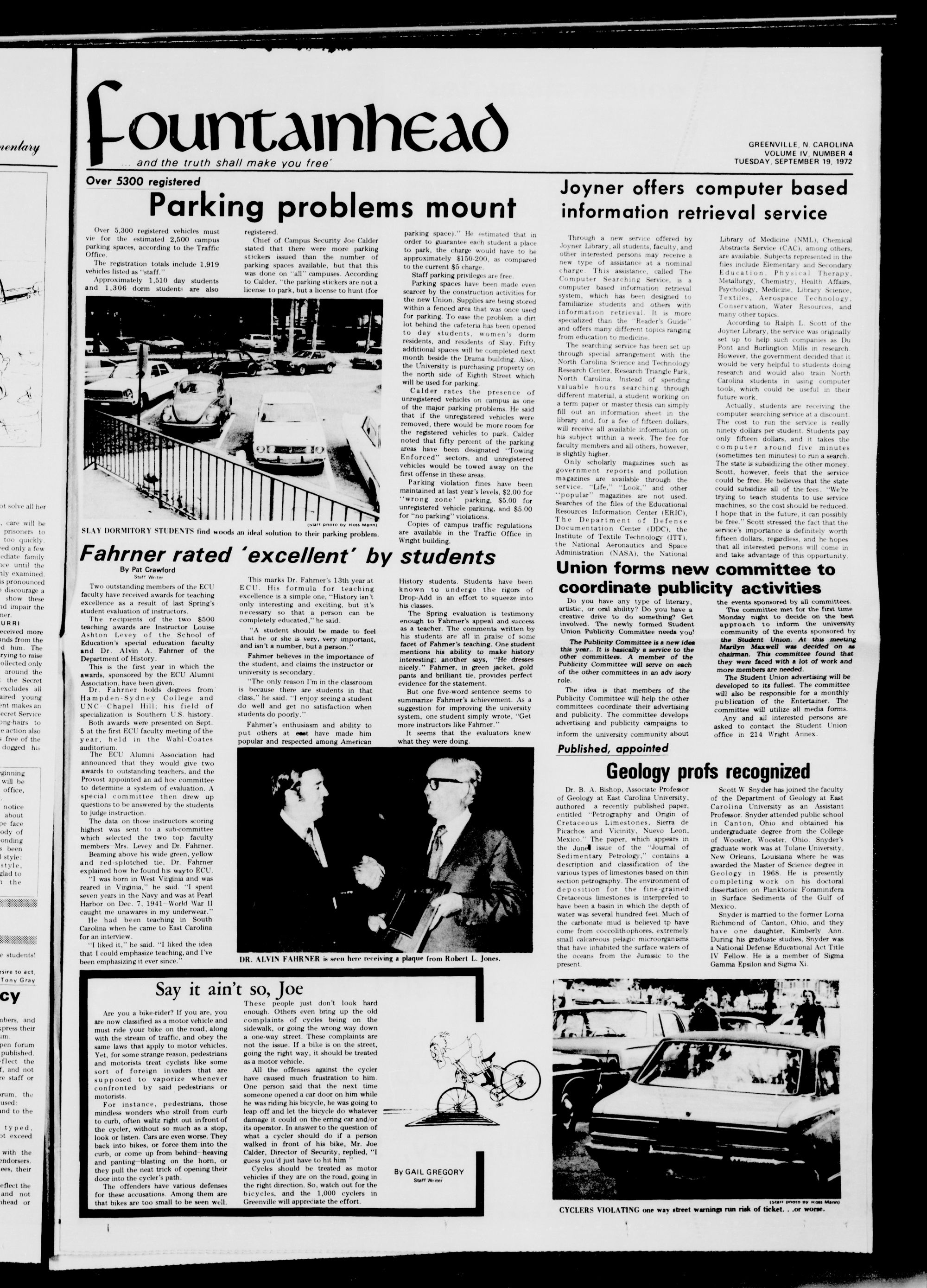 East Carolina's student-run campus newspaper was first published in 1923 as the East Carolina Teachers College News (1923-1925). It has been re-named as The Teco Echo (1925, 1926-1952), East Carolinian (1952-1969), Fountainhead (1969-1979), and The East Carolinian (1969, 1979-present). It includes local, state, national, and international stories with a focus on campus events.