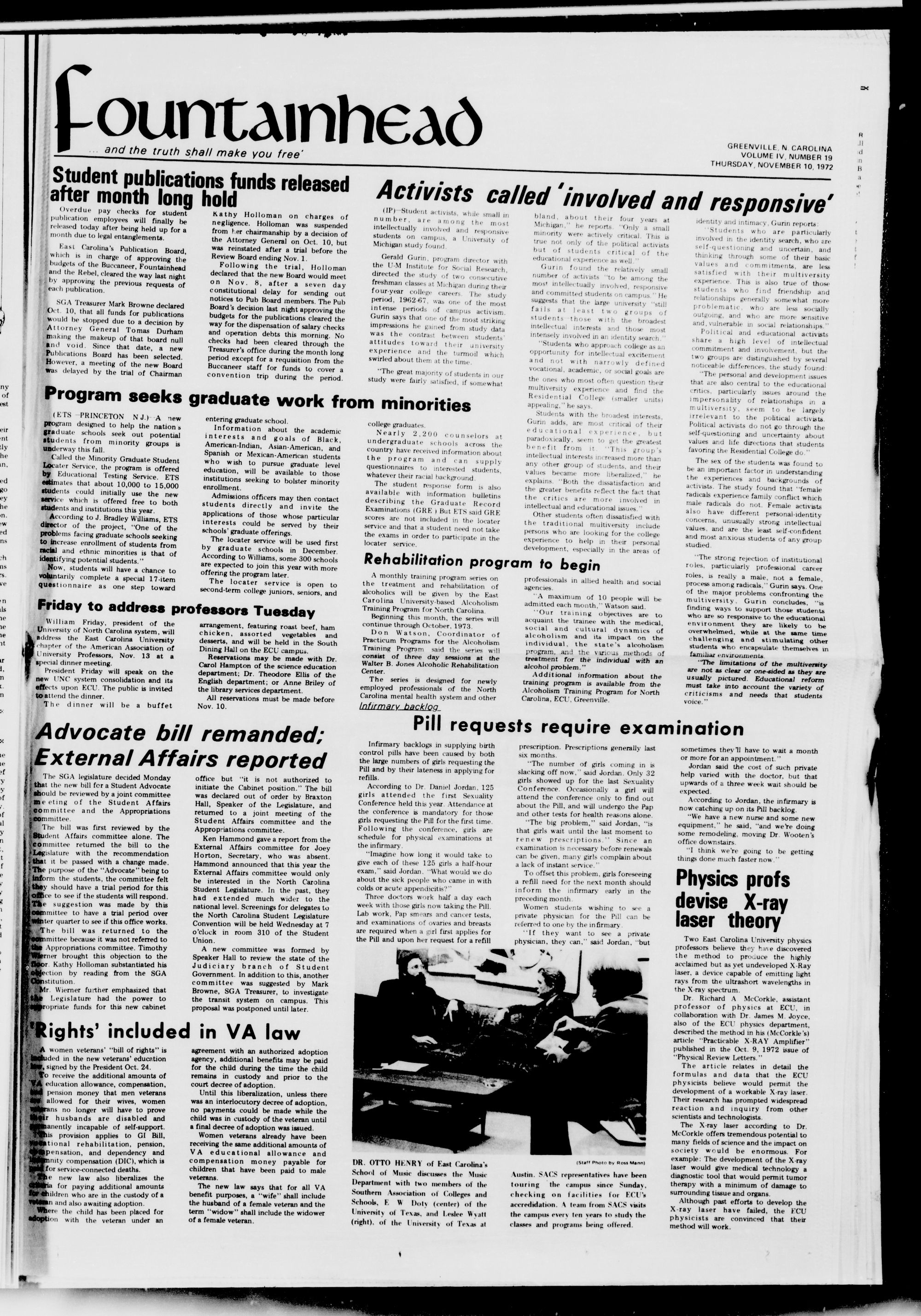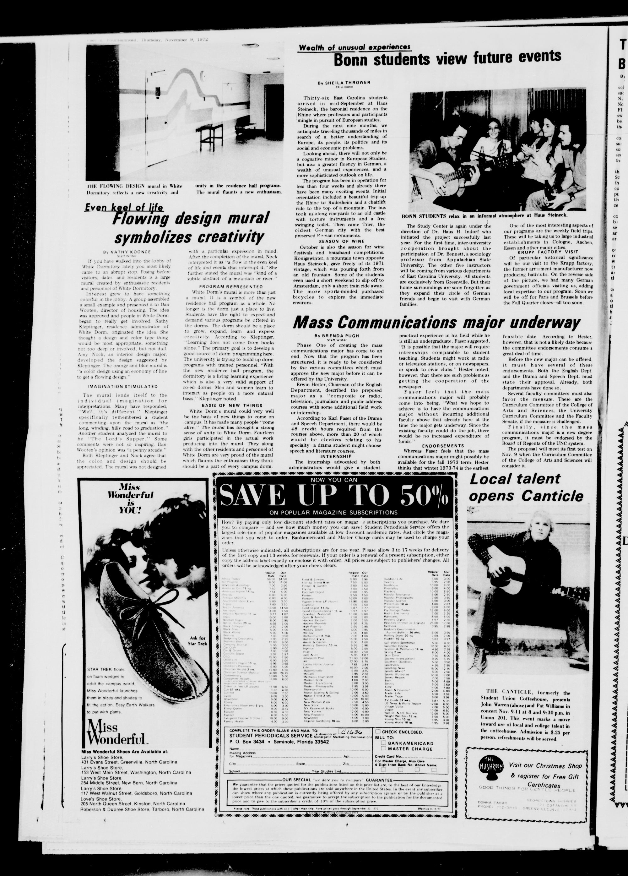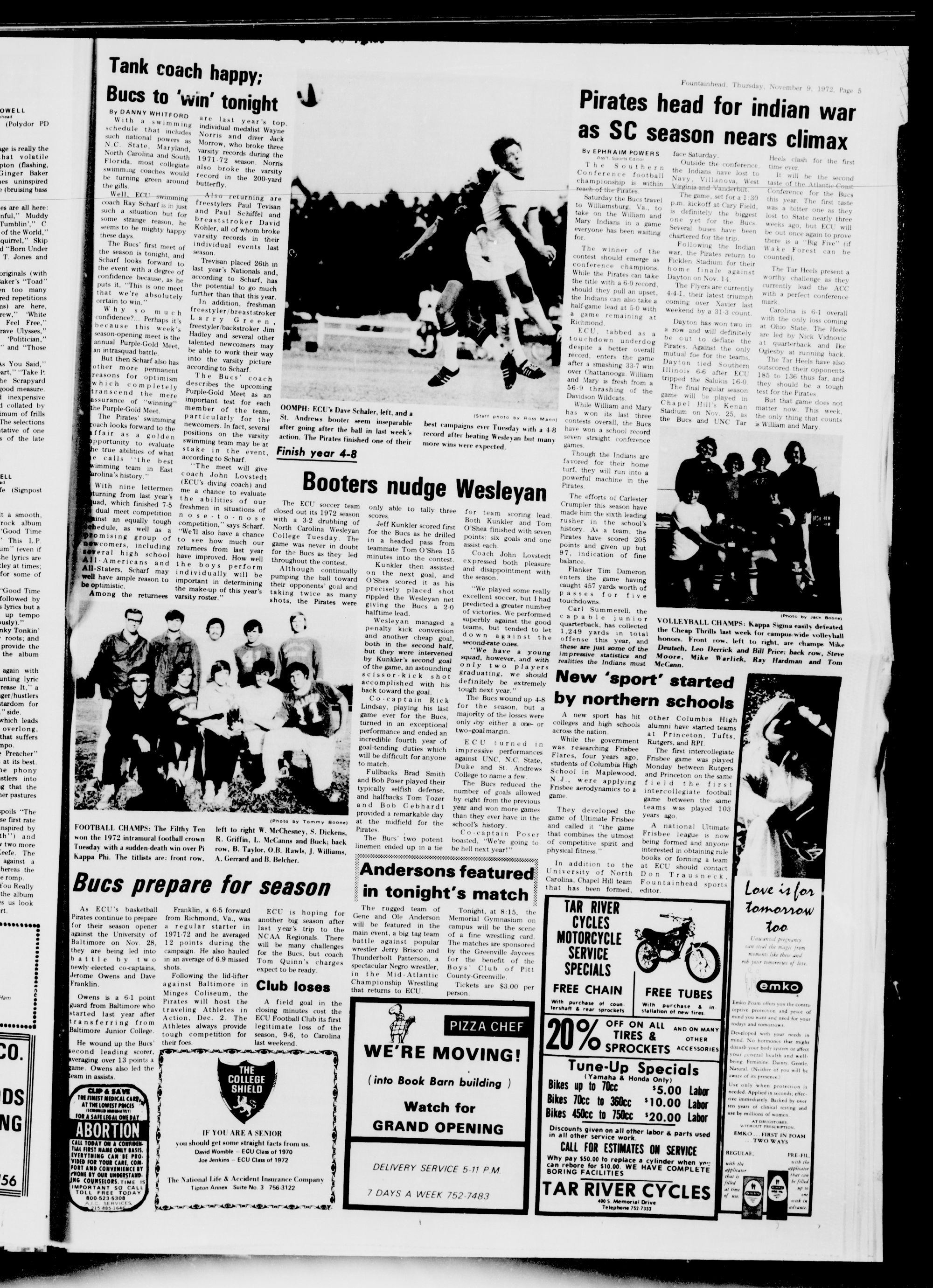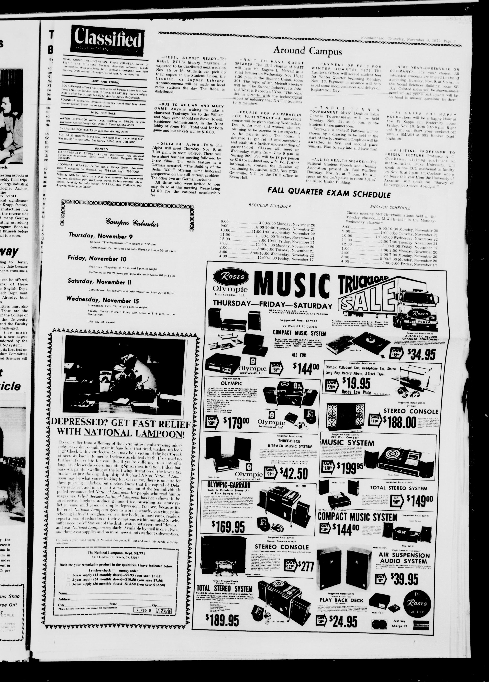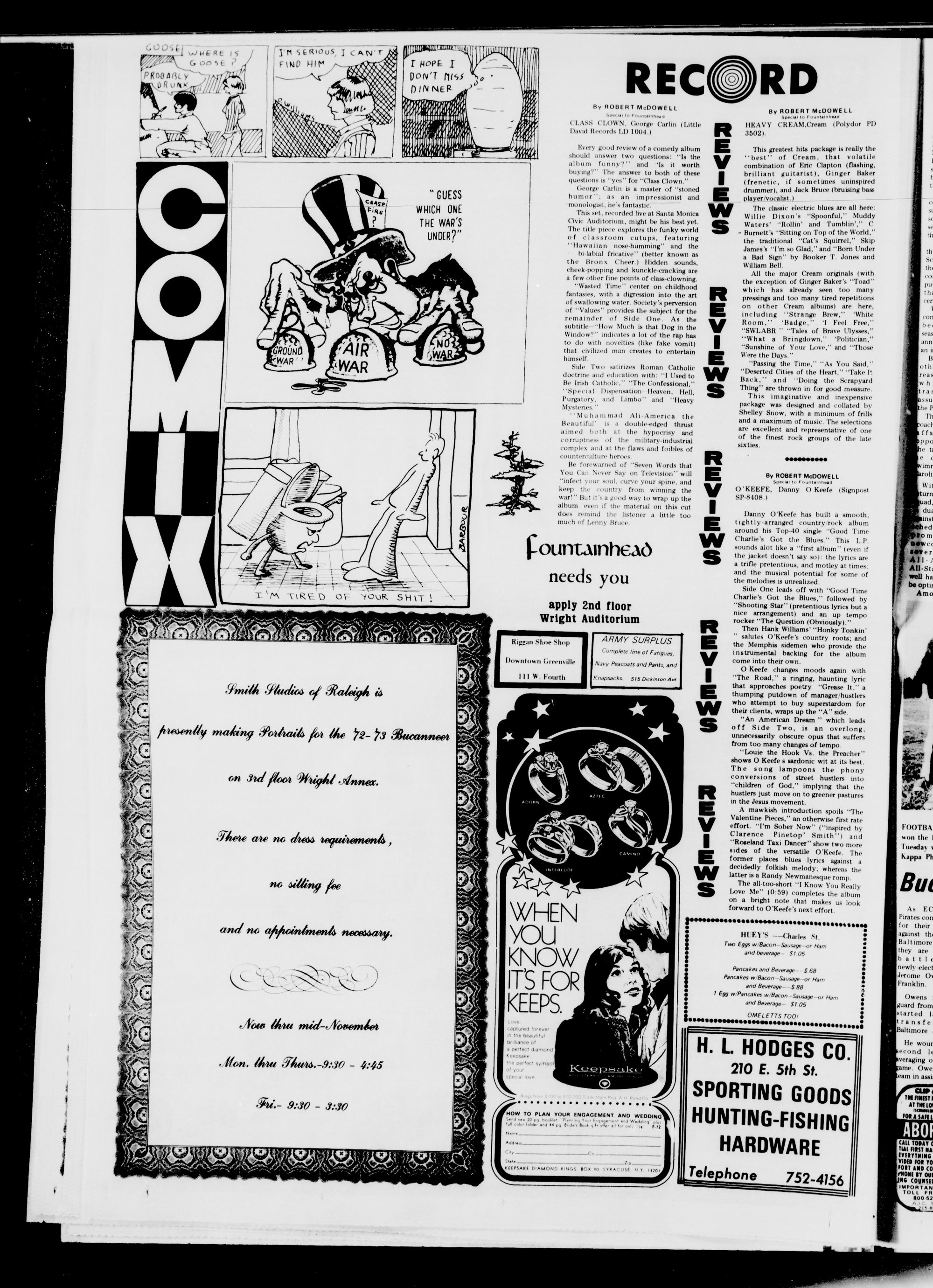 East Carolina's student-run campus newspaper was first published in 1923 as the East Carolina Teachers College News (1923-1925). It has been re-named as The Teco Echo (1925, 1926-1952), East Carolinian (1952-1969), Fountainhead (1969-1979), and The East Carolinian (1969, 1979-present). It includes local, state, national, and international stories with a focus on campus events.