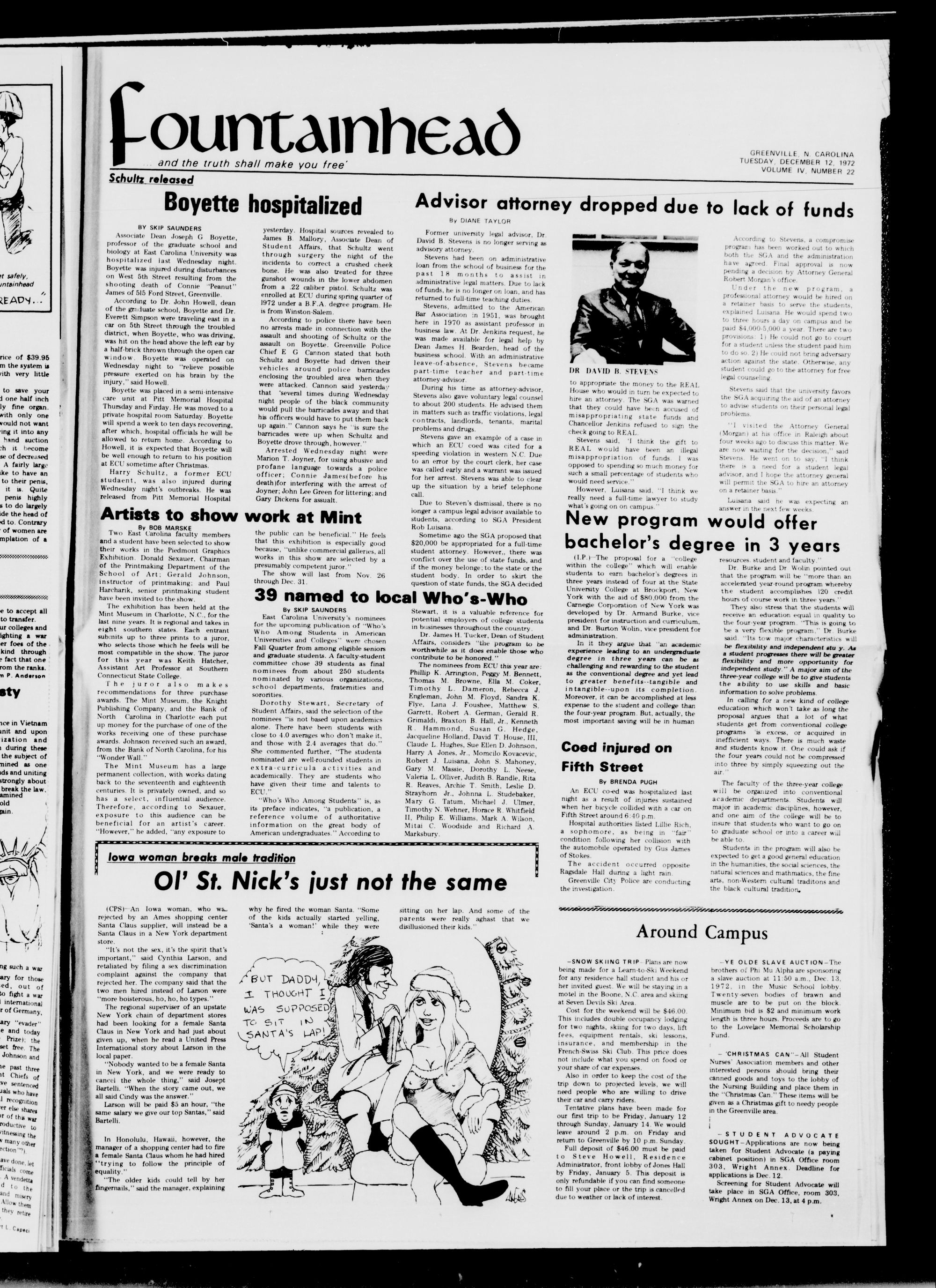 East Carolina's student-run campus newspaper was first published in 1923 as the East Carolina Teachers College News (1923-1925). It has been re-named as The Teco Echo (1925, 1926-1952), East Carolinian (1952-1969), Fountainhead (1969-1979), and The East Carolinian (1969, 1979-present). It includes local, state, national, and international stories with a focus on campus events.