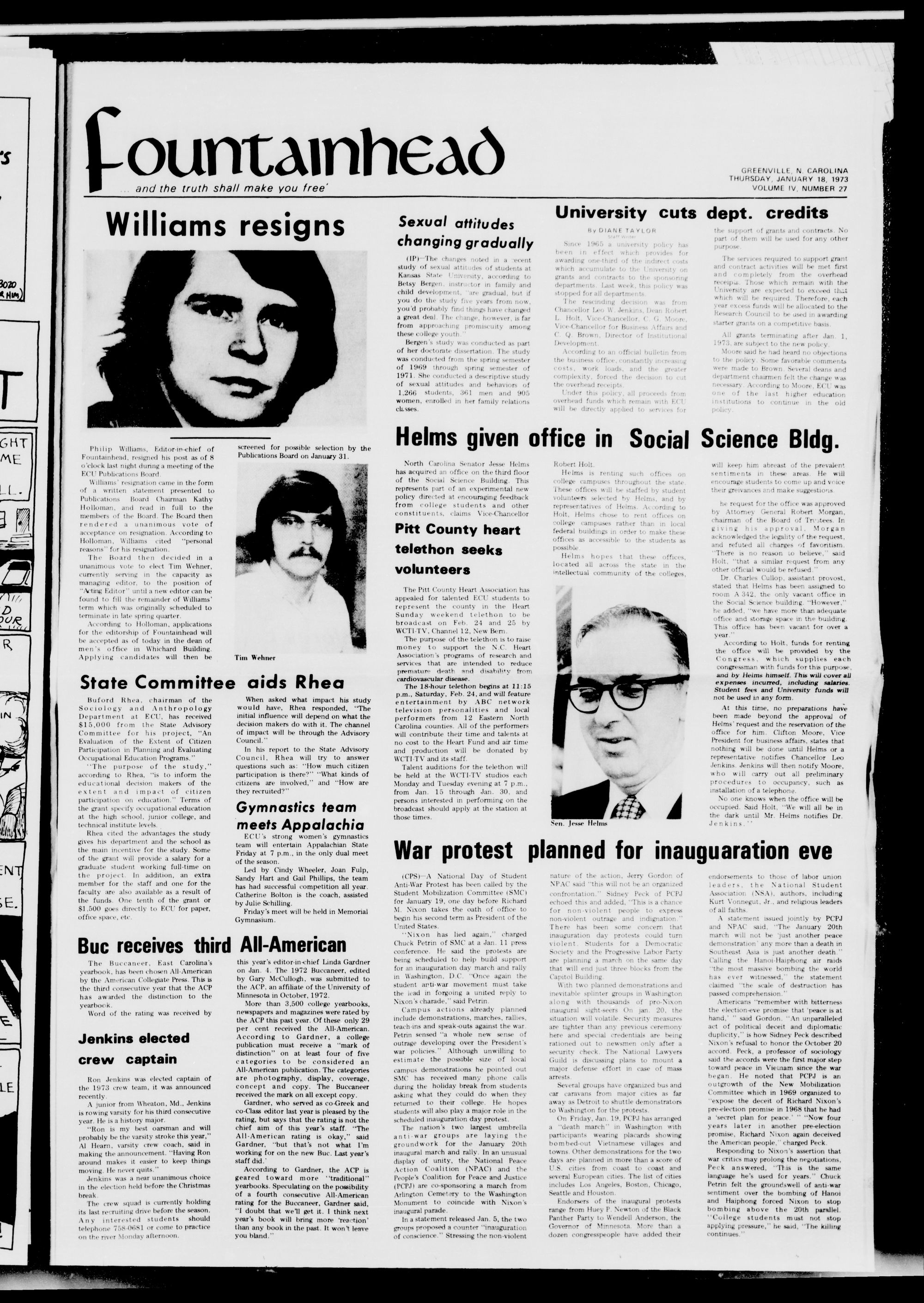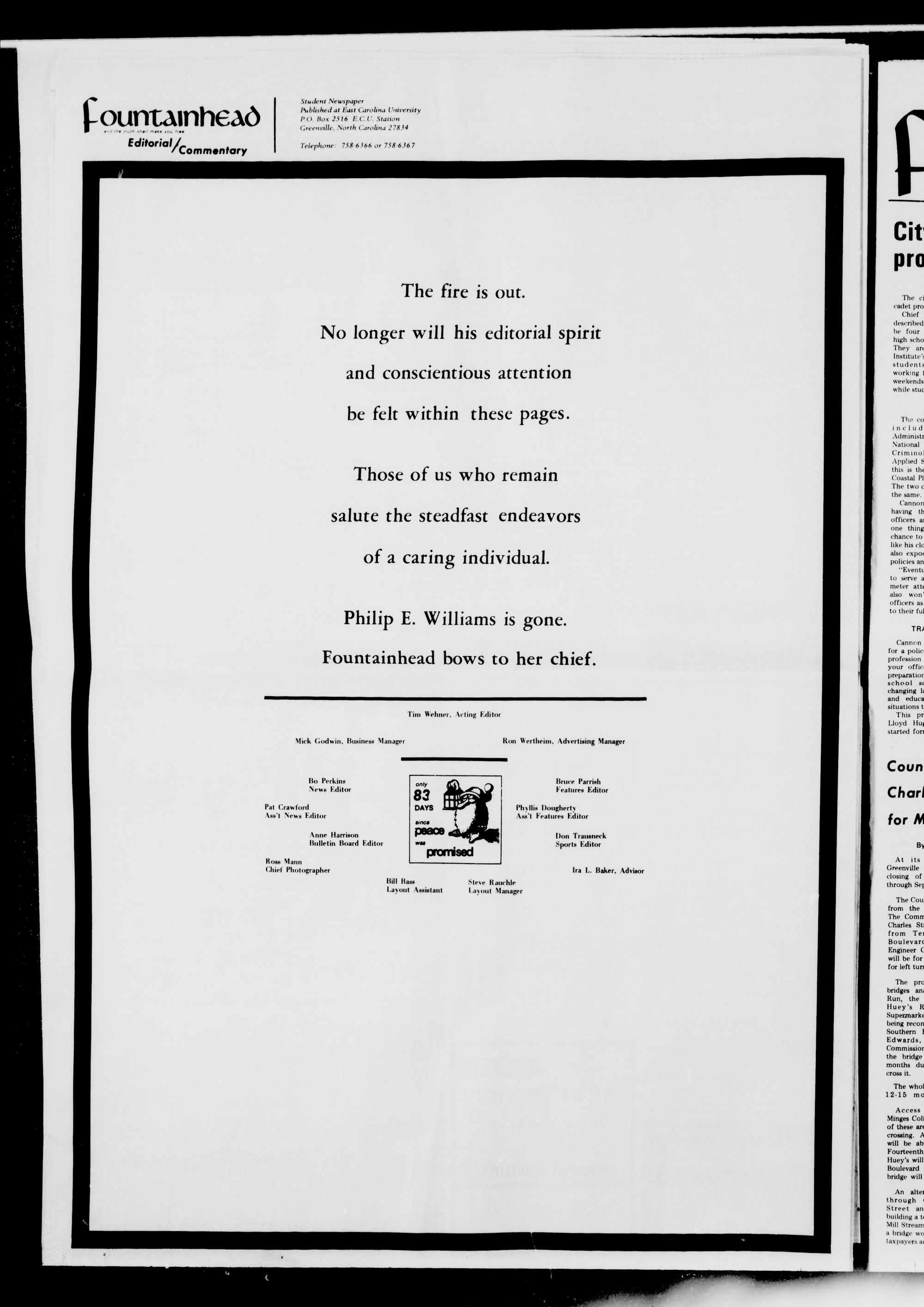 East Carolina's student-run campus newspaper was first published in 1923 as the East Carolina Teachers College News (1923-1925). It has been re-named as The Teco Echo (1925, 1926-1952), East Carolinian (1952-1969), Fountainhead (1969-1979), and The East Carolinian (1969, 1979-present). It includes local, state, national, and international stories with a focus on campus events.