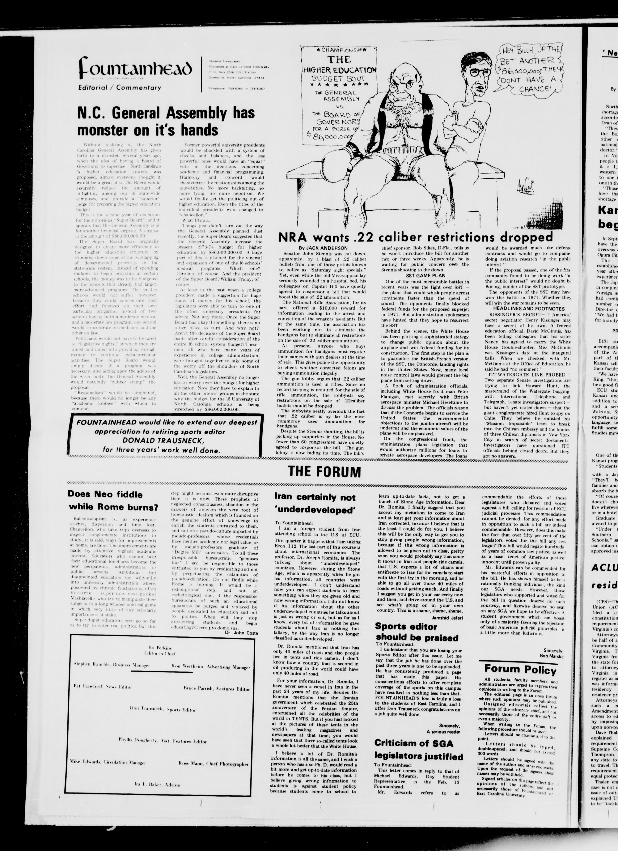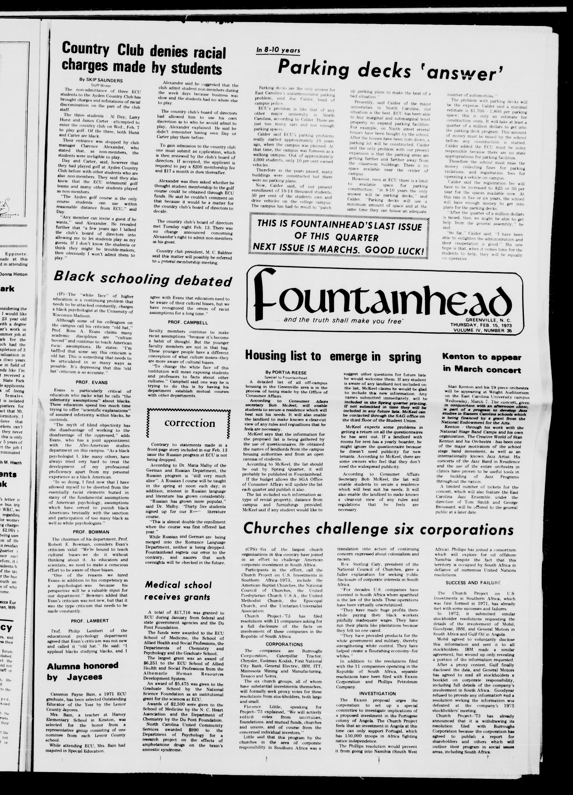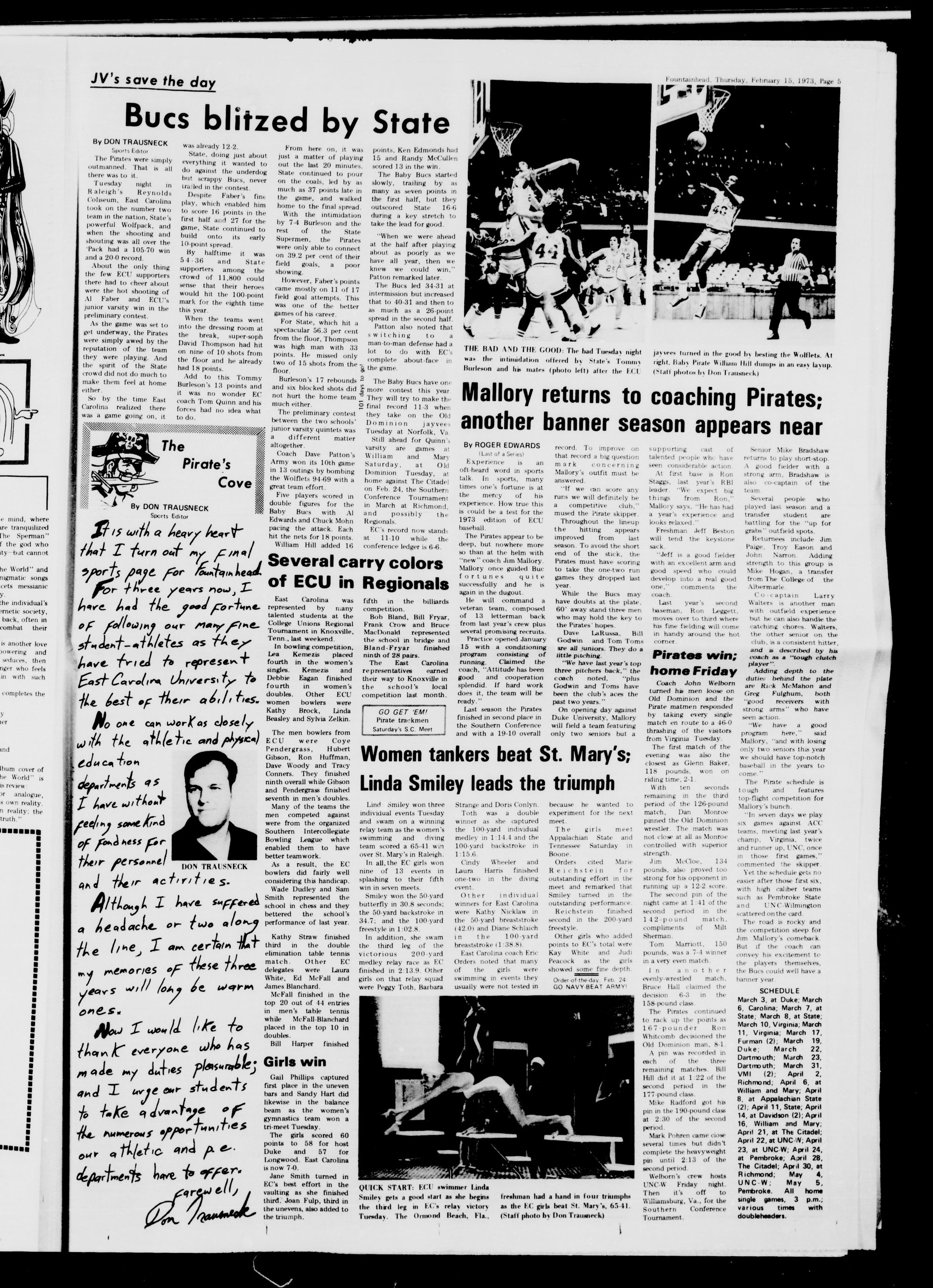 East Carolina's student-run campus newspaper was first published in 1923 as the East Carolina Teachers College News (1923-1925). It has been re-named as The Teco Echo (1925, 1926-1952), East Carolinian (1952-1969), Fountainhead (1969-1979), and The East Carolinian (1969, 1979-present). It includes local, state, national, and international stories with a focus on campus events.