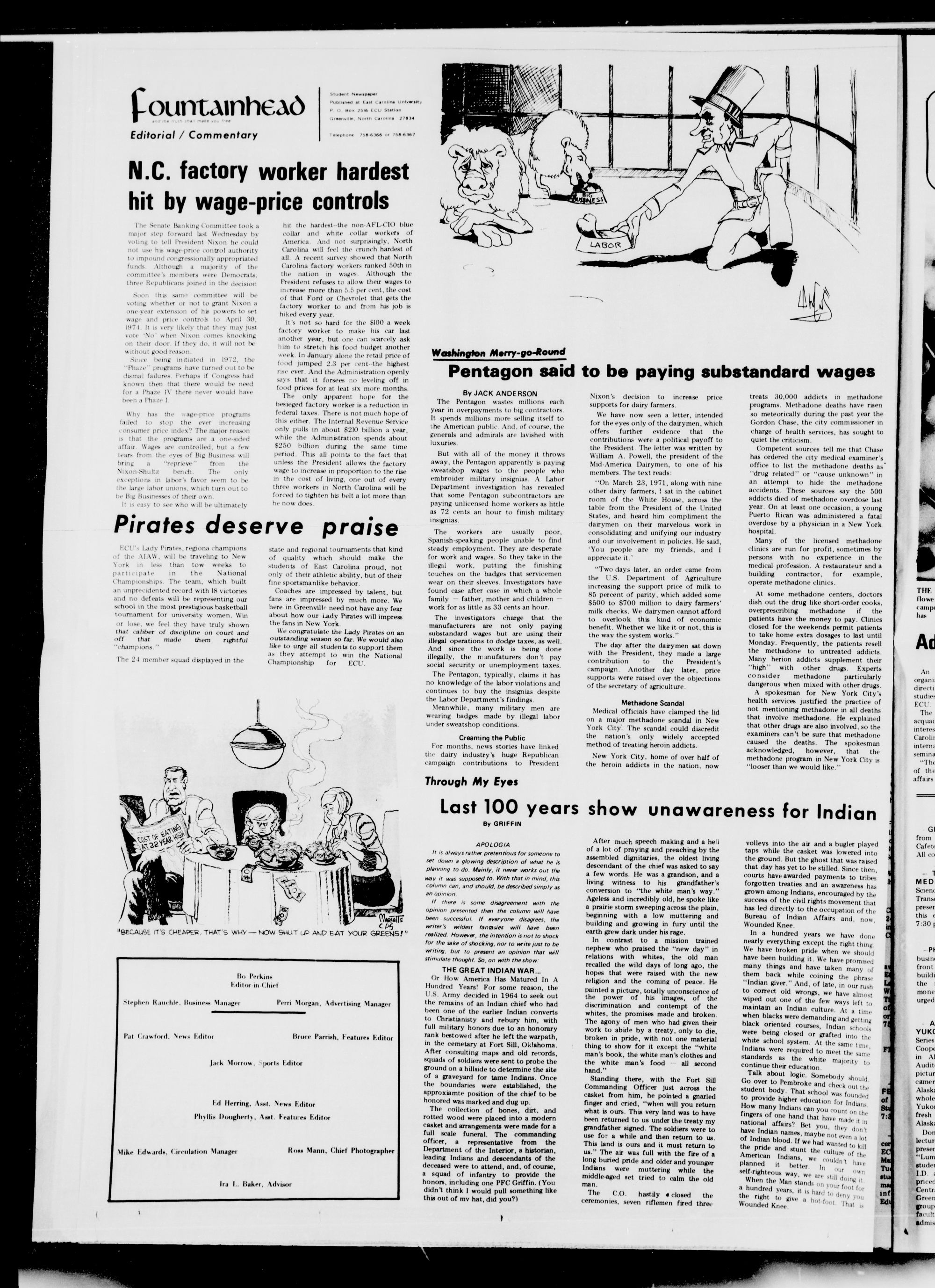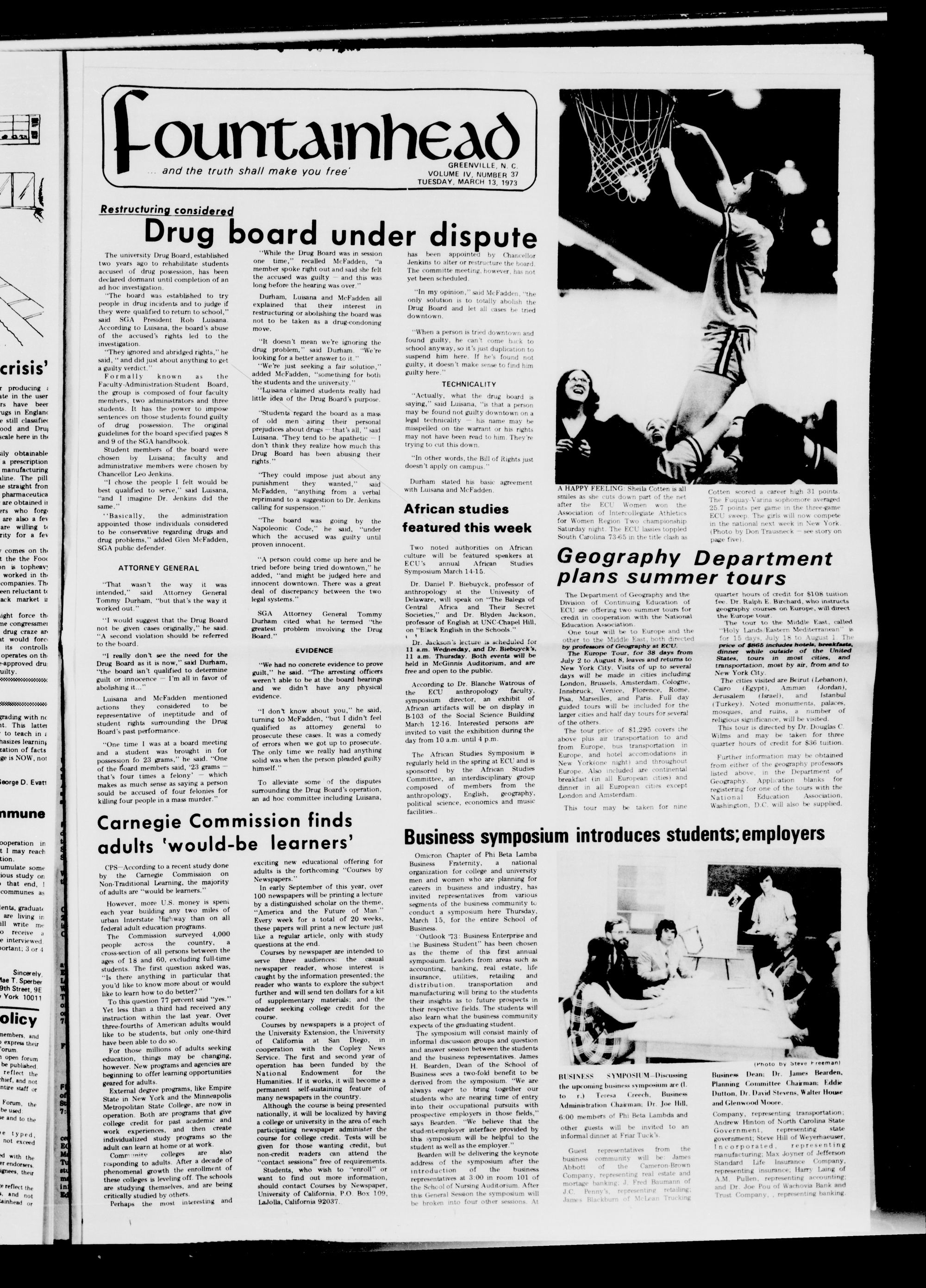 East Carolina's student-run campus newspaper was first published in 1923 as the East Carolina Teachers College News (1923-1925). It has been re-named as The Teco Echo (1925, 1926-1952), East Carolinian (1952-1969), Fountainhead (1969-1979), and The East Carolinian (1969, 1979-present). It includes local, state, national, and international stories with a focus on campus events.
