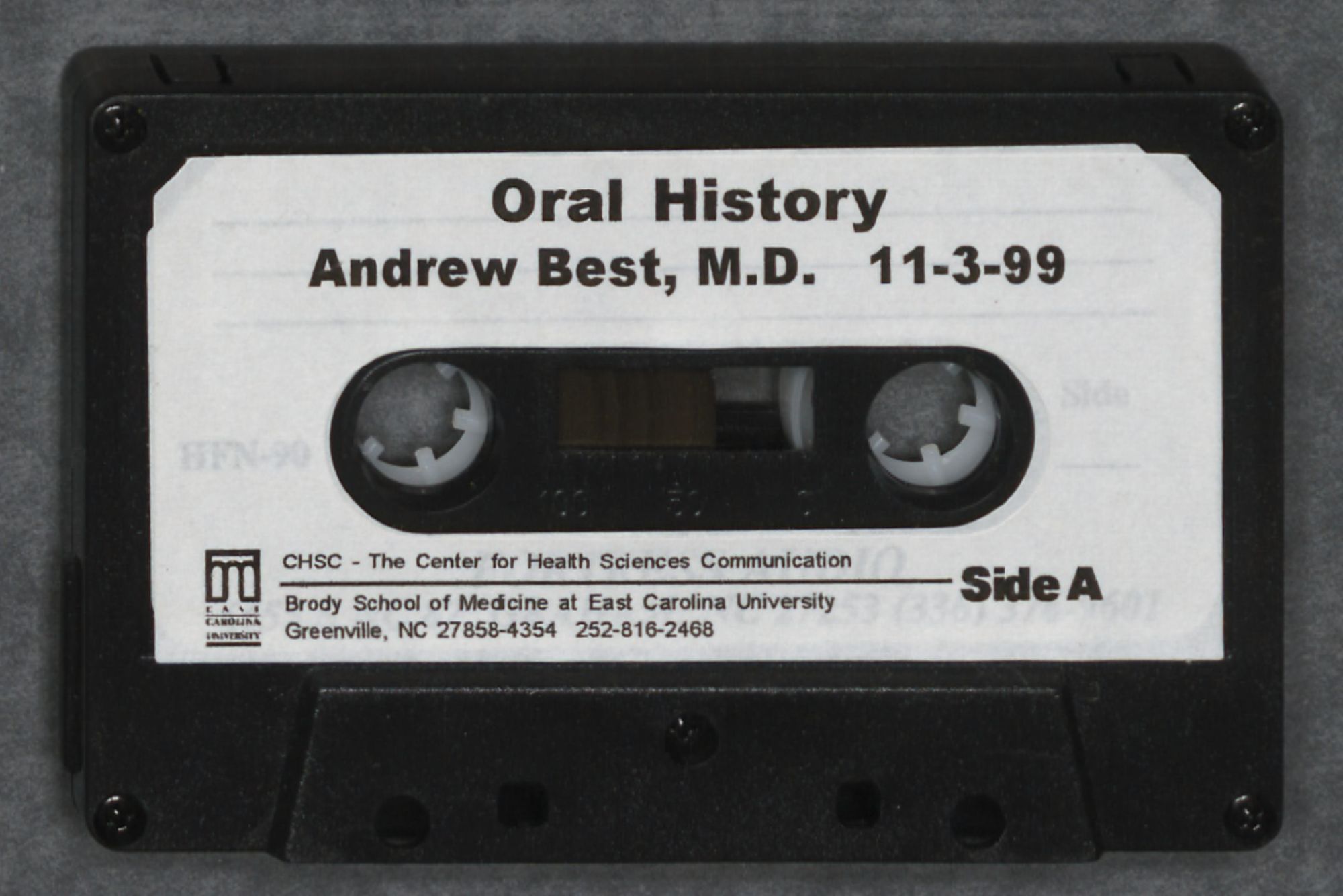 ORAL HISTORY INTERVIEW WITH DR. ANDREW BEST November 3, 1999 Inteviewer: Ruth Moskop Trancribed by: Sabrina Coburn 9 Total Pages Copyight 2000 by East Carolina University. All rights reserved. No part of this document may be reproduced or transmitted in any form or by any means, electronic or mechanical, including photocopying, recording, or by any information storage and retrieval system, without permission in writing from East Carolina University.