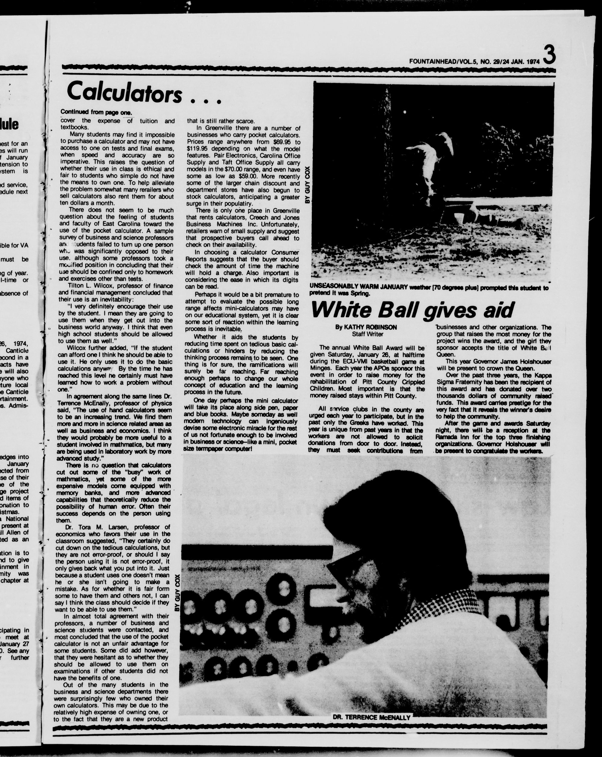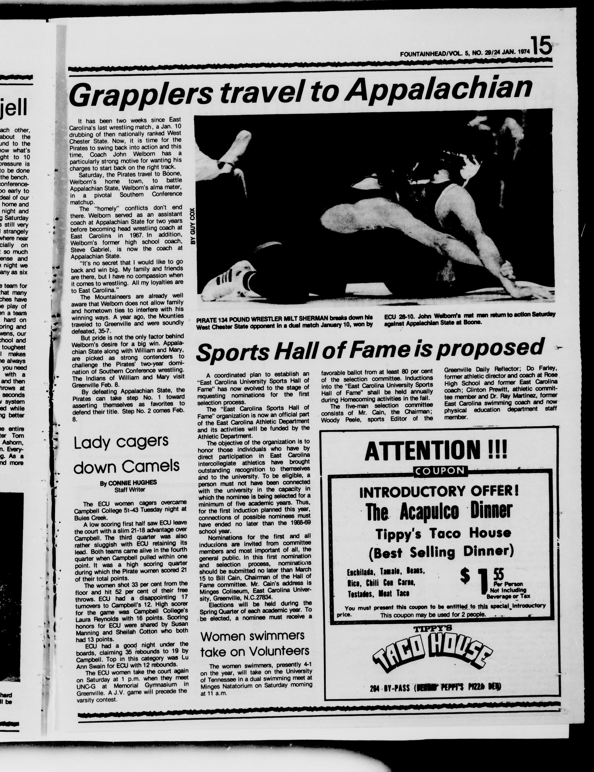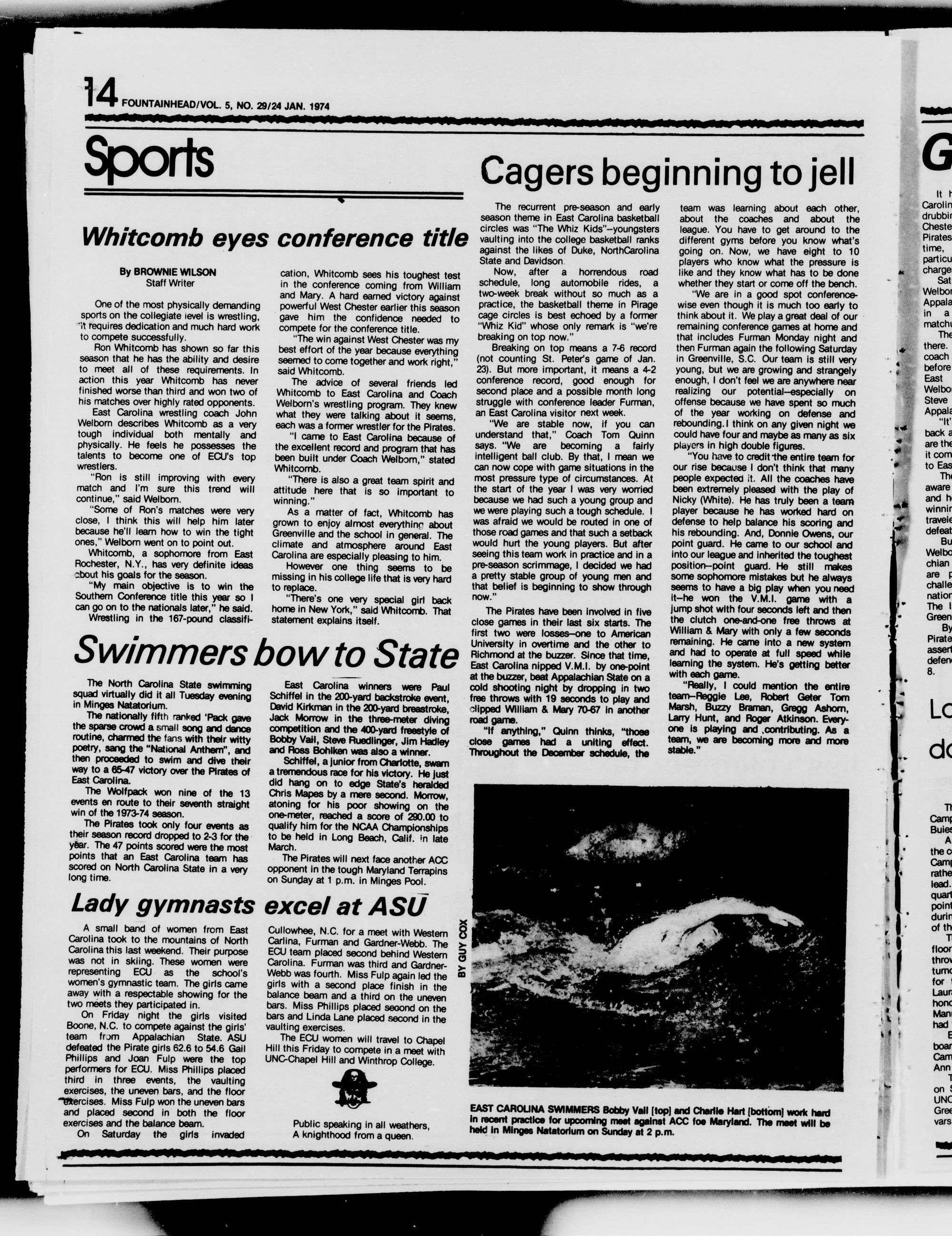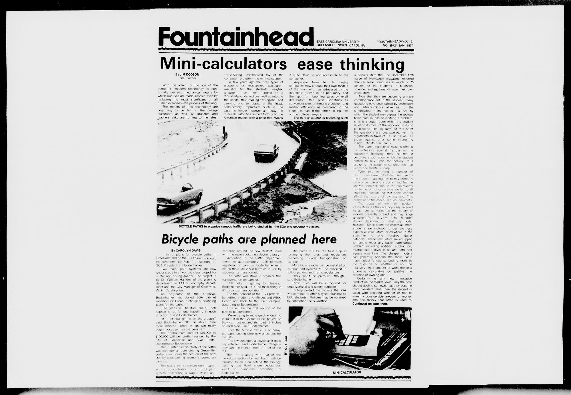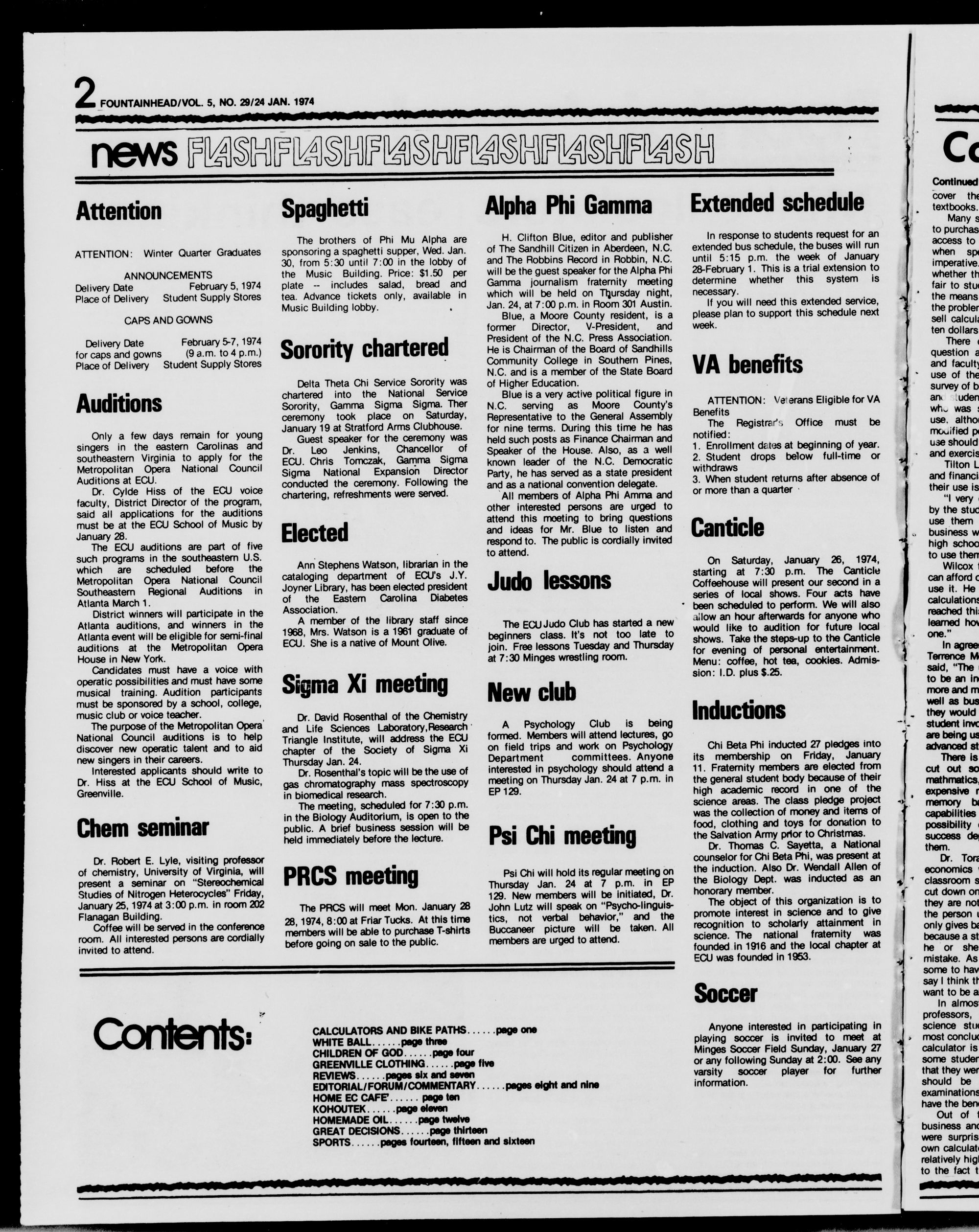 East Carolina's student-run campus newspaper was first published in 1923 as the East Carolina Teachers College News (1923-1925). It has been re-named as The Teco Echo (1925, 1926-1952), East Carolinian (1952-1969), Fountainhead (1969-1979), and The East Carolinian (1969, 1979-present). It includes local, state, national, and international stories with a focus on campus events.