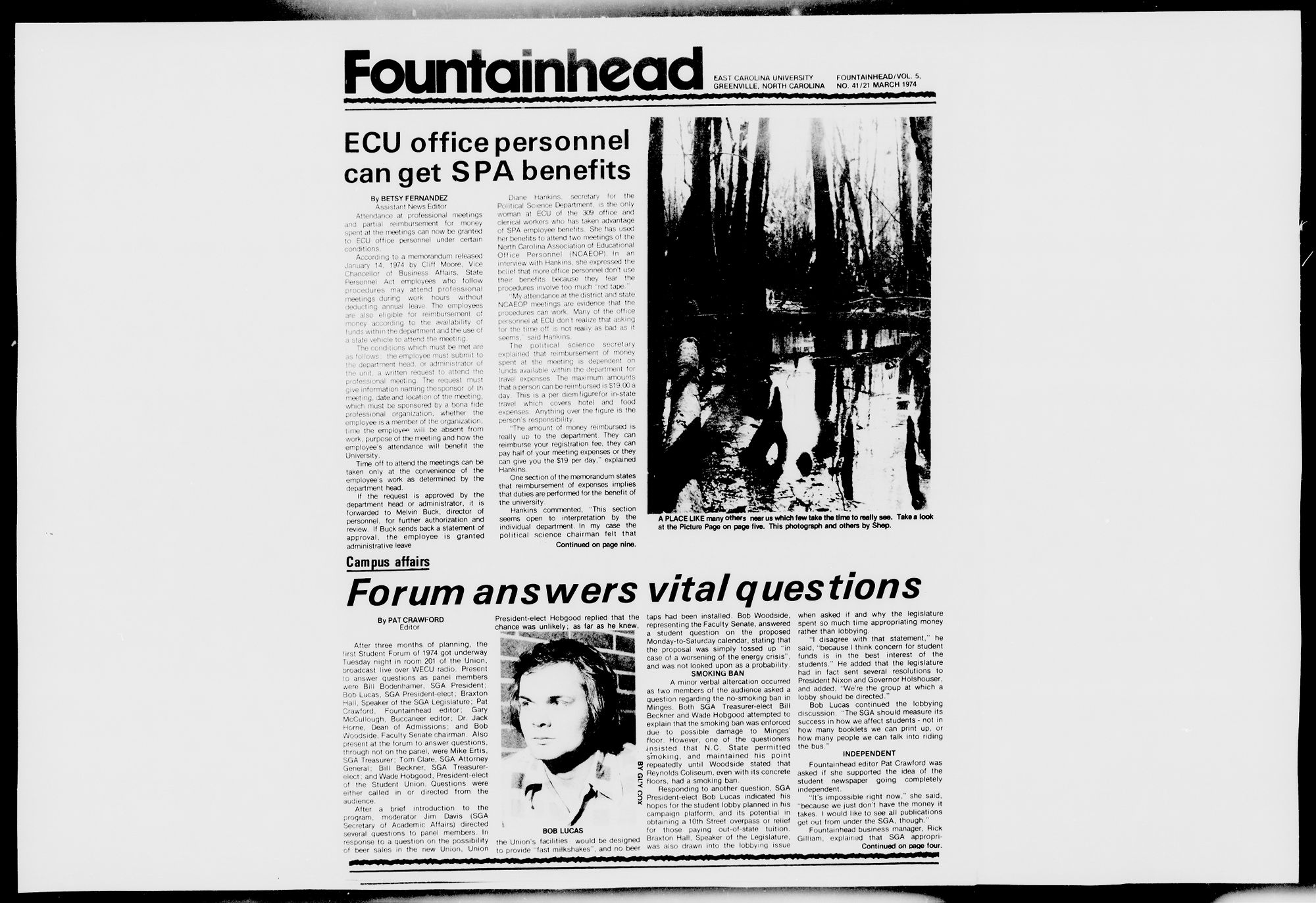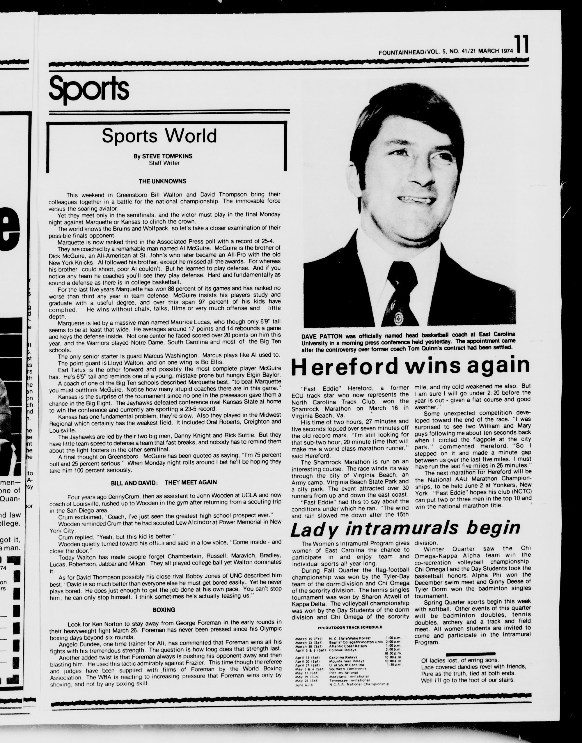 East Carolina's student-run campus newspaper was first published in 1923 as the East Carolina Teachers College News (1923-1925). It has been re-named as The Teco Echo (1925, 1926-1952), East Carolinian (1952-1969), Fountainhead (1969-1979), and The East Carolinian (1969, 1979-present). It includes local, state, national, and international stories with a focus on campus events.