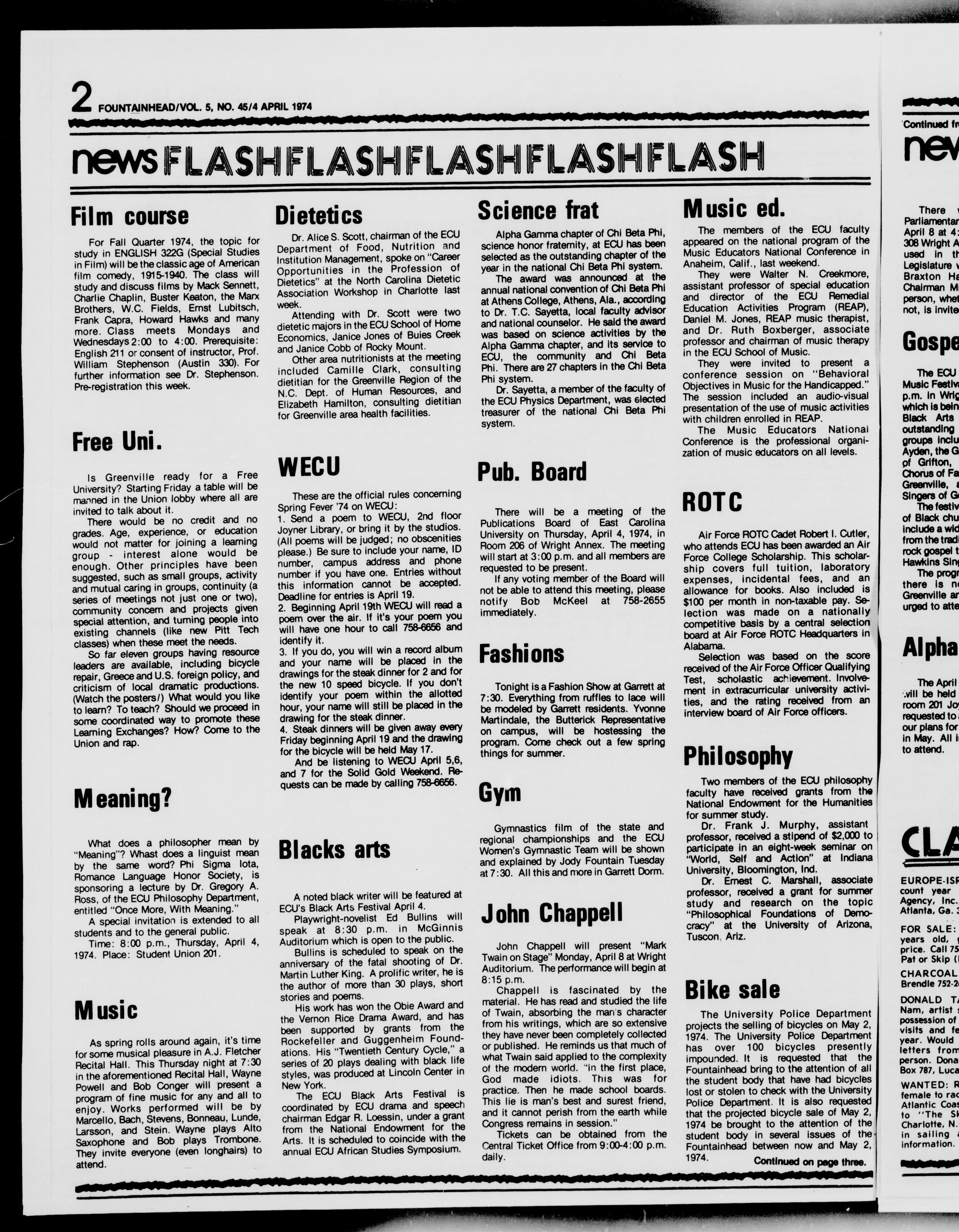 East Carolina's student-run campus newspaper was first published in 1923 as the East Carolina Teachers College News (1923-1925). It has been re-named as The Teco Echo (1925, 1926-1952), East Carolinian (1952-1969), Fountainhead (1969-1979), and The East Carolinian (1969, 1979-present). It includes local, state, national, and international stories with a focus on campus events.