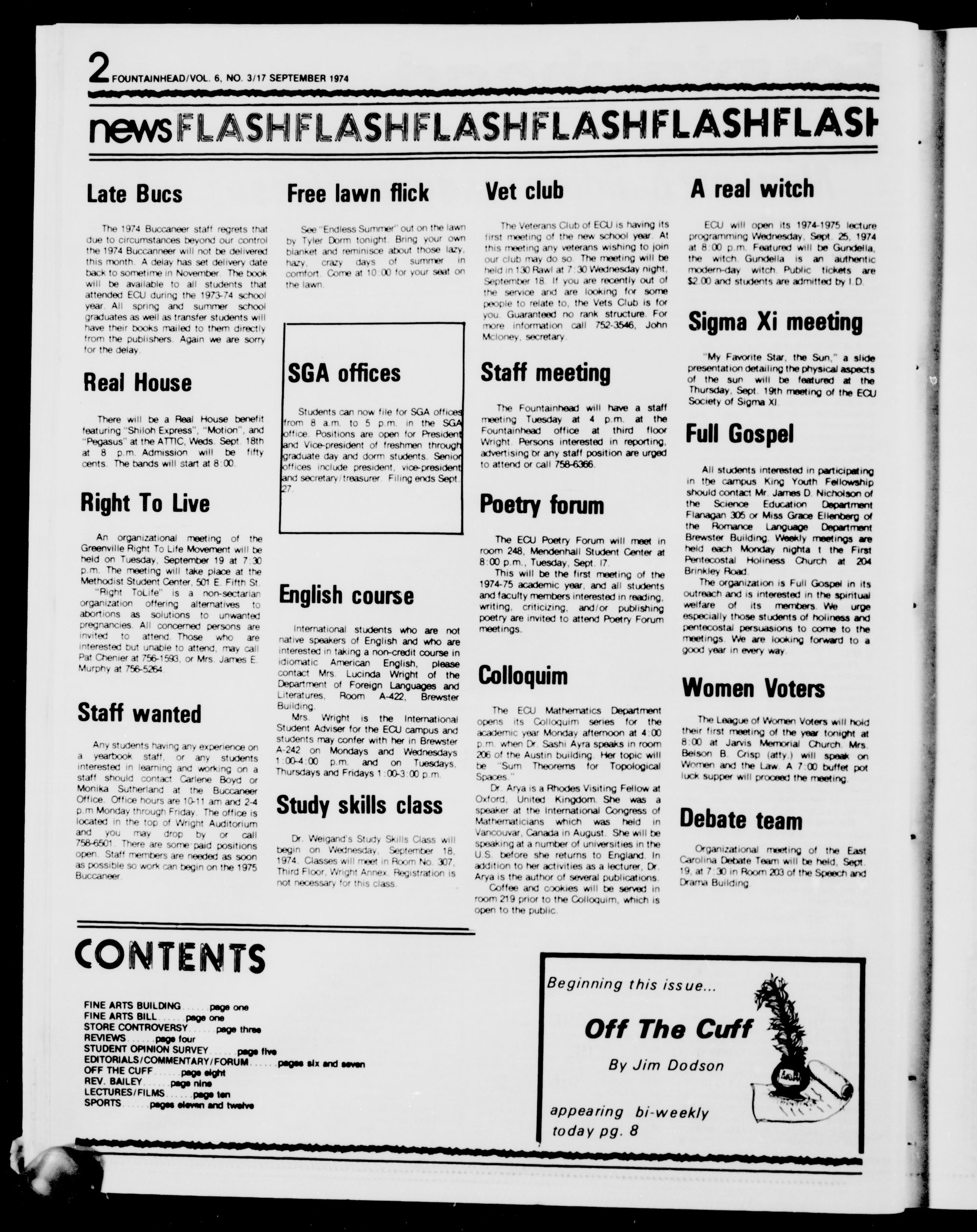 Any students having any experience on a yearbook staff, or any students interested in learning and working on a Staff should contact Carlene Boyd or Monika Sutherland at the Buccaneer Office. Office hours are 10-11 am and 2-4 p.m Monday through Friday. The office is located in the top of Wright Auditorium and you may drop by or call 758-6501. There are some: paid positions open. Staff members are needed as soon aS possible so work can begin on the 1975 Buccaneer