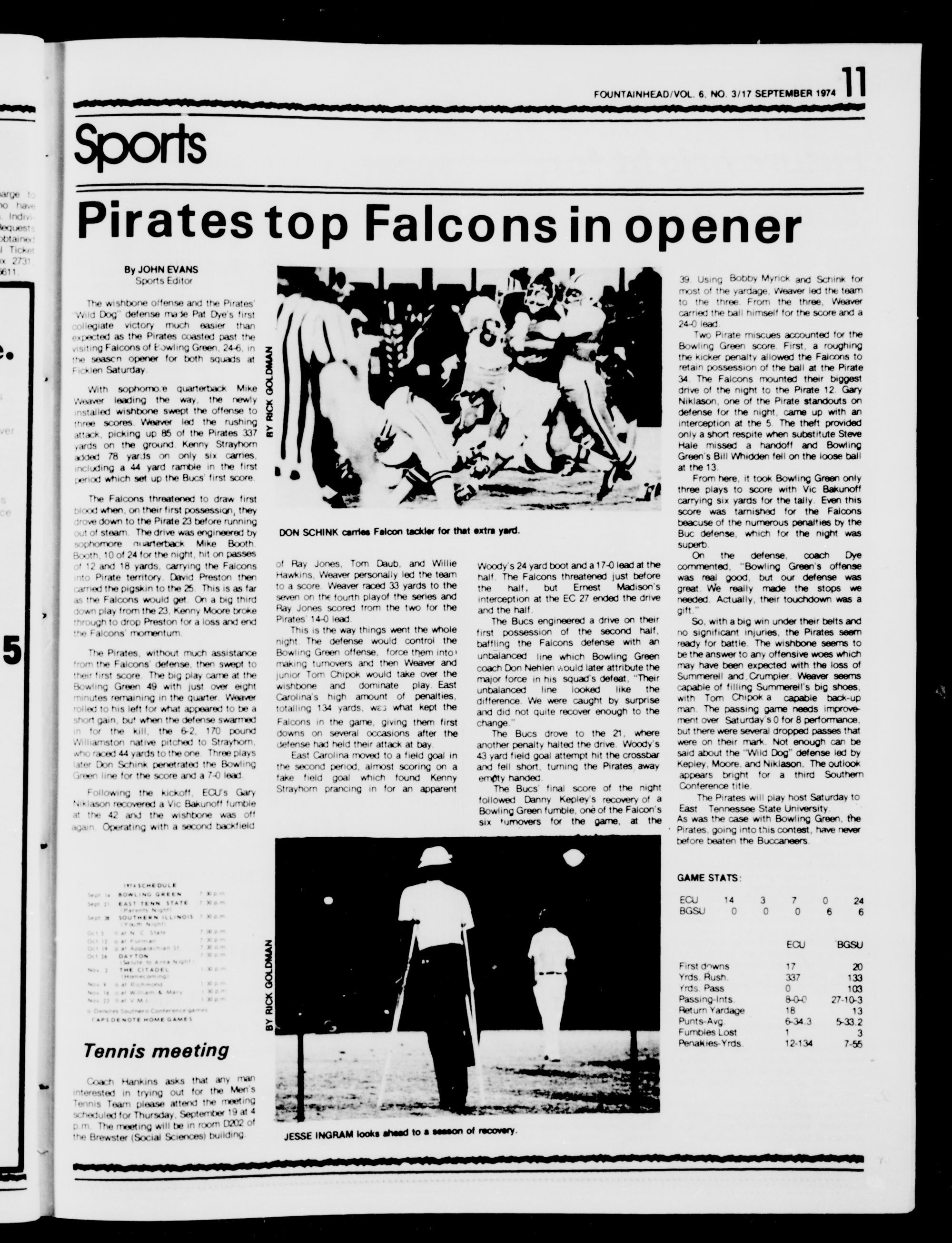 Two Pirate miscues accounted for the Bowling Green score. First, a roughing the kicker penaity allowed the Faicons to retain possession of the bali at the Pirate 34. The Faicons mounted their biggest drive of the night to the Pirate 12. Gary Nikiason, one of the Pirate standouts on defense for the night, came up with an interception at the 5. The theft provided only a short respite when substitute Steve Hale missed a handoff and Bowling Green's Bill Whidden fell on the loose bal! at the 13
