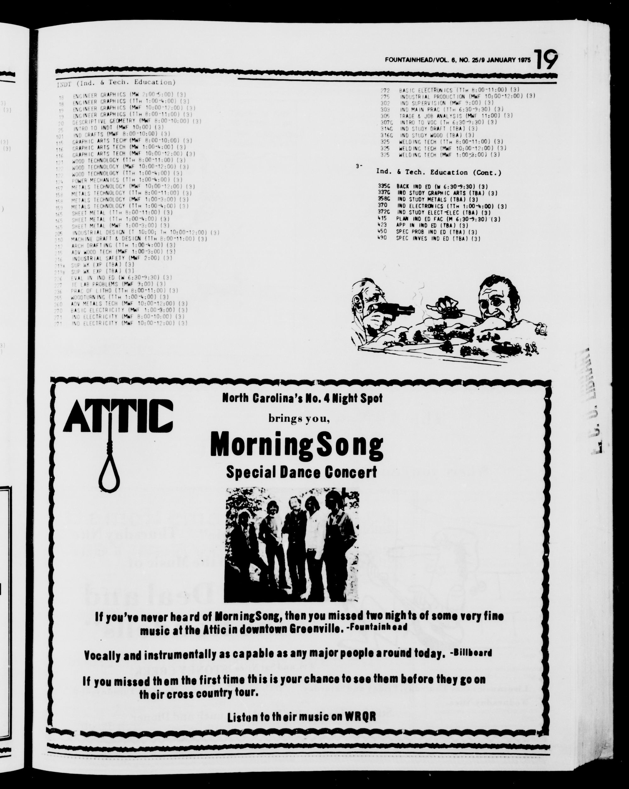 a NDI (Ind. & Tech. Education) 79 BASIC ELECTRUNICS (TlH &:00-11:00) (3) R GRAPHICS (MW 2:00-4:00) (2 one INDUSTRIAL PRODUCTION (MWF 10:00-12:00) (3) ENGINEER GRAF spre vee 00 “4 - Of . ane IND SUPERVISION (MWF 9:00) (3) Die OEE eis ics (MF 10:00°12;00) (4 303 IND MAIN PRAC (TTw 6:30-9:30) (3) FNGINEER GRAN ° a Hageman hae 208 rRADE : 408 ANALYSIS (Myf 11:00) (3) NGINEER GRAPHICS i ‘ee 8:00 -1307G INTRO TO VOC (Tw 6:30-9:30) (3) A ae vee a : 3146 IND STUDY DRAFT (TBA) (3) OTRO ie Er Seer ent 19) 316G IND STUDY WOOD (TBA) (3) Ne oats teem Wee 00-10-00) (2) 325 WELDING TECH (TTw 8:00-11:00) (3) ee ee i Sf hay ol 325 WELDING TECH (MWF 10:00-12:00) is PRAPHICCH 1: 004: 00 “ : -00-3:00) (3 RAPHIC ARTS TECH (MWF 10:00-12:00) (3) 325 O WELDING TECH (MWE 1:00-3:00) ( “OO! TECHNOLOGY (TI 8:00-11:00) (3) ee WOOD TECHNOLOGY (Mwh 10:00-12: Of 3) ied. & Tech. Education (Cont. ) WOOD TECHNOLOGY (TT 1:00-4:00) (3) Pre tat Uae Th te-ts.dn (4) 335G BACK IND ED (W 6:30-9:30) (3) METALS TESS fa ating ces a 4s 337G IND STUDY GRAPHIC ARTS (TBA) (3) METALS Teco wae Ca eas bat” 958G IND STUDY METALS (TBA) (3) METALG TESS ioe anon. Oh) 14) 370 IND ELECTRONICS (TTH 1:00-6:00) (3) METALS TECHNOLOGY (TTH va hv il 372G IND STUDY ELECT-ELEC (TBA) (3) Weer ere ie) tiie et 415 PLAN IND ED FAC (M 6:30-9:30) (3) Et ee ee ee an. fa 423 APP IN IND ED (TBA) (3) r phil ng Bar Bg th hl Nig a 450 SPEC PROB IND ED (TBA) (3) 6 MOUSTRIAL ORS Rm EY cerees iM Wagon i220) (3) 490 SPEC INVES IND ED (TBA) (3) ' MACHINE DRAFT & DESIGN (TIm 8:00-11:00) (3) ARCH DRAFTING (TTw 1:00-4:00) (3) ADV WOOD TECH (MWF 1:00-3:00) (3) NOUSTRIAL SAFETY (MWF 2:00) (3) 194 Pp wk EXP (TBA) (3) P WK EXP (TBA) (3) VAL IN INO ED (W 6:30°9:30) (3 ’ AR PROBLEMS (MwWwF 9:00) (3 Zz Da f 1THO (TTw 8:00-11:0 (3 4 . ) wool NING H 1:00-4:00) A ADV METALS TECH (MwF 10:00-12:00) (3) . oS — (Oh7, BA FLECTRICITY (MWF 1:00-3:00) (3) peti a ’ NO ELECTRICITY (MWF 8:00-10:00) (3 e ‘ IRICITY (MWF 10:00-17:00) 7 -) cf 4 North Carolina’s No. 4 Night Spot ; brings you, te Special Dance Concert ra —. ee