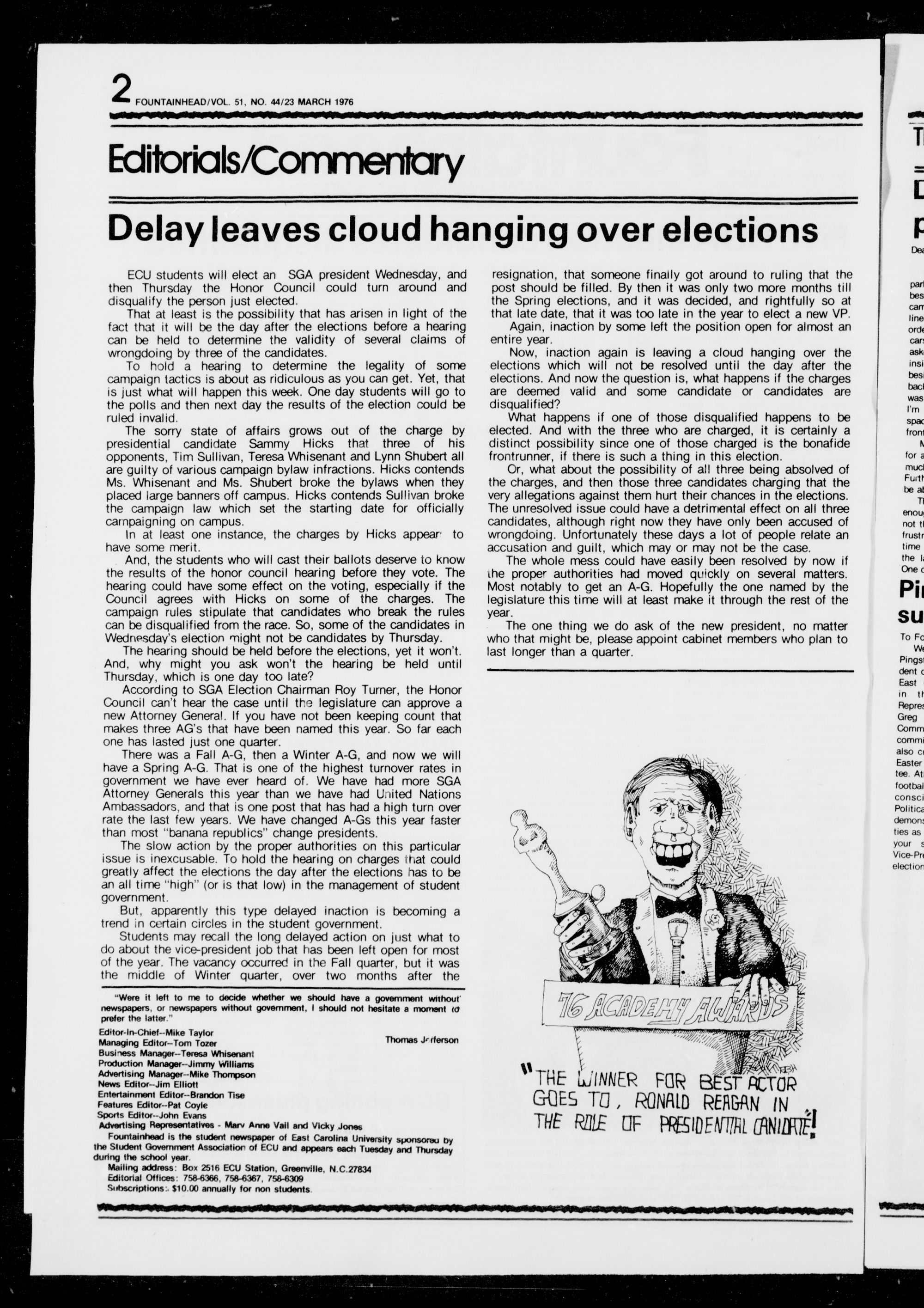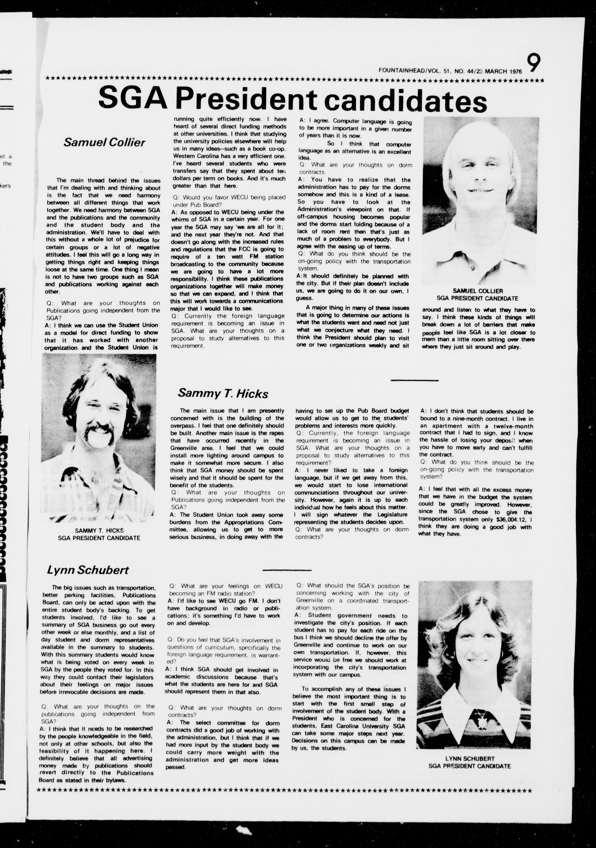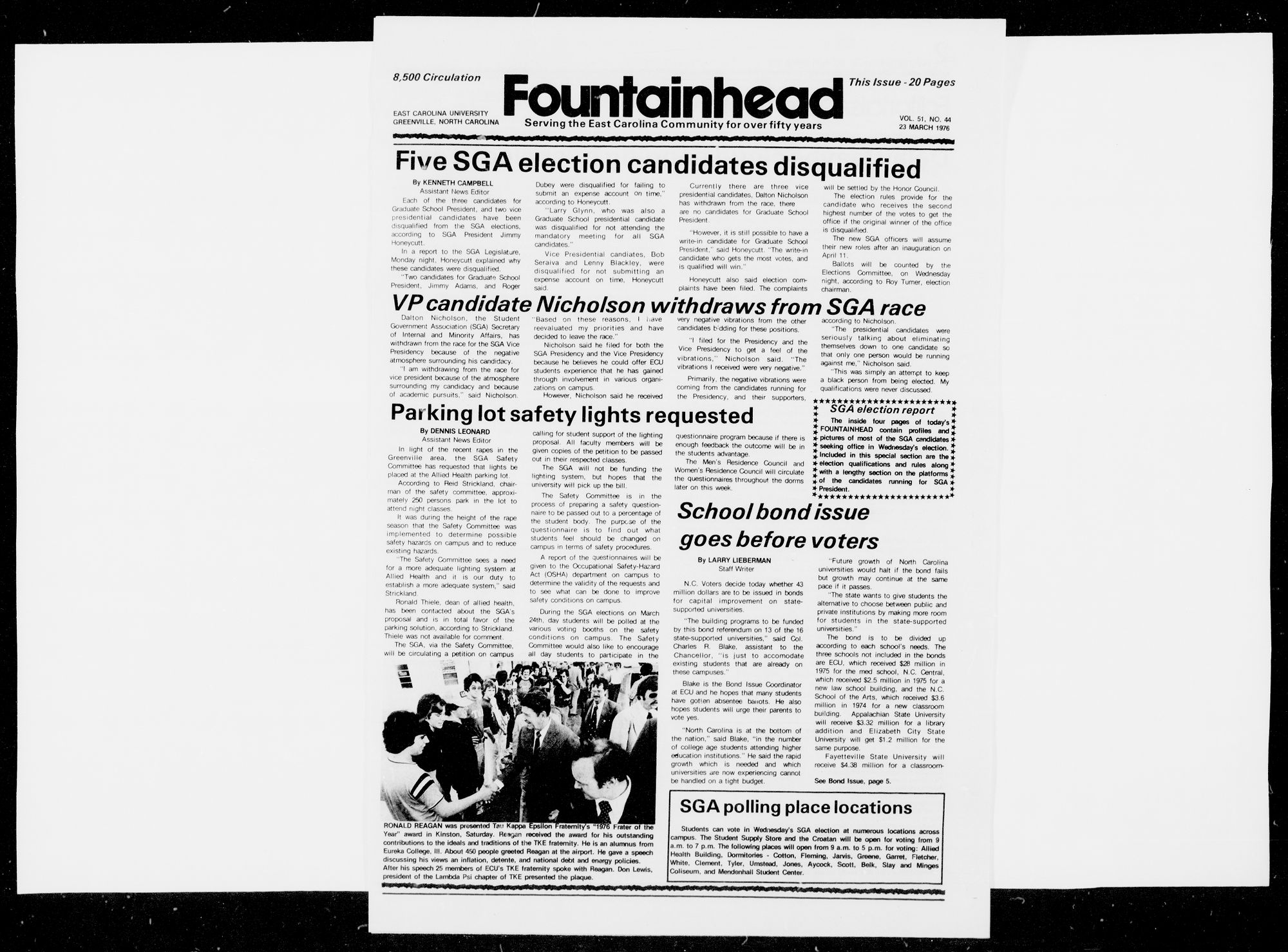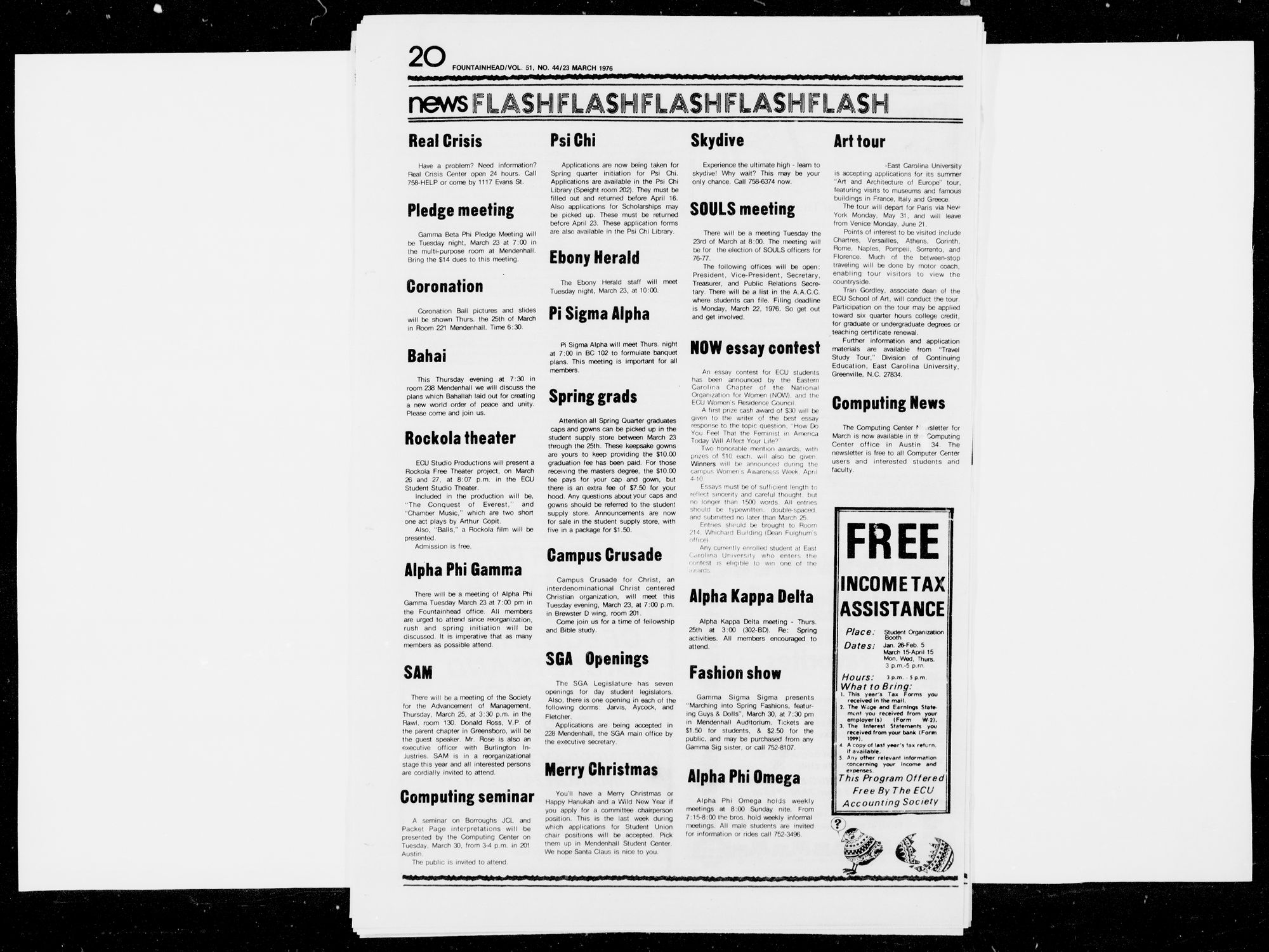 East Carolina's student-run campus newspaper was first published in 1923 as the East Carolina Teachers College News (1923-1925). It has been re-named as The Teco Echo (1925, 1926-1952), East Carolinian (1952-1969), Fountainhead (1969-1979), and The East Carolinian (1969, 1979-present). It includes local, state, national, and international stories with a focus on campus events.