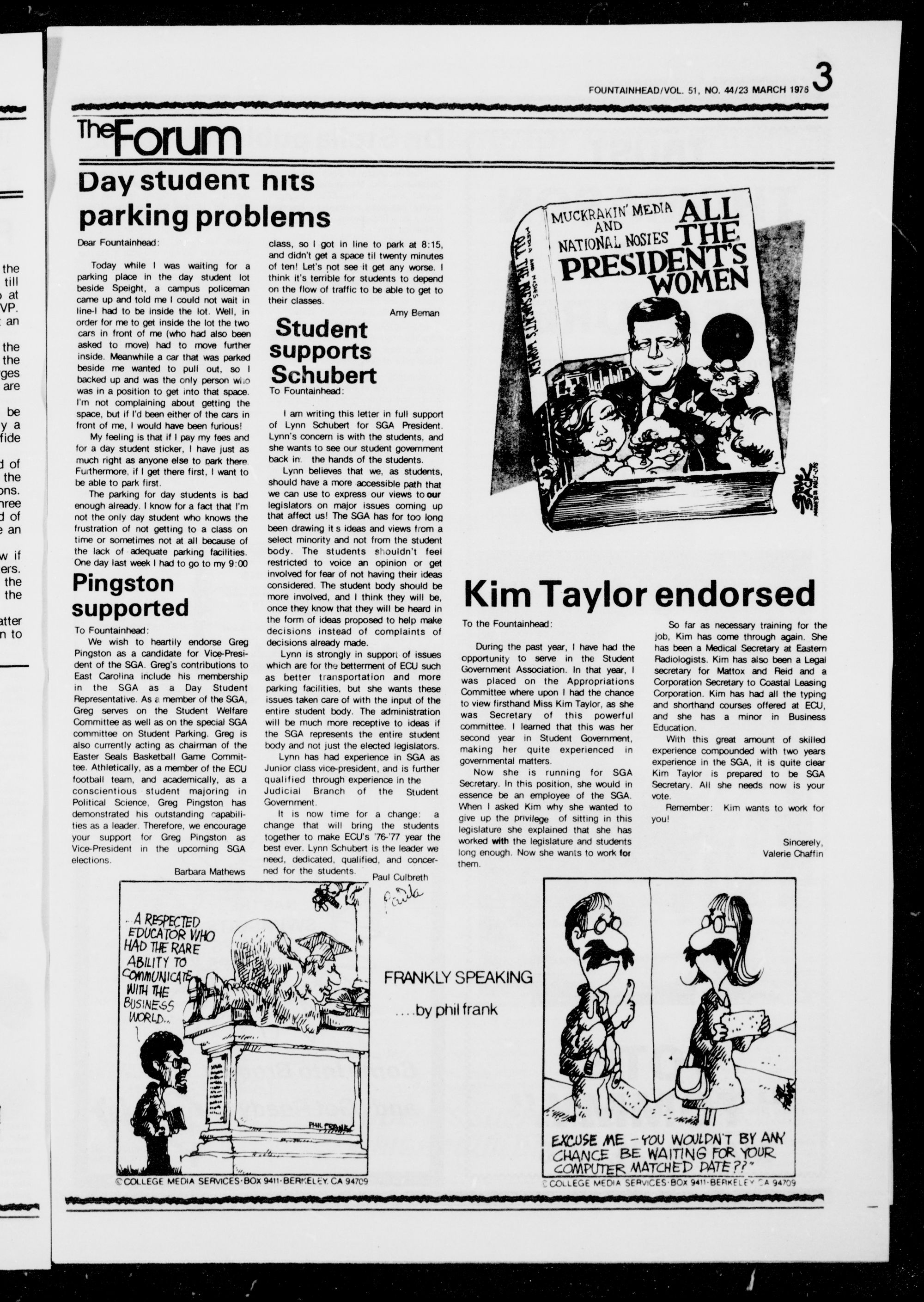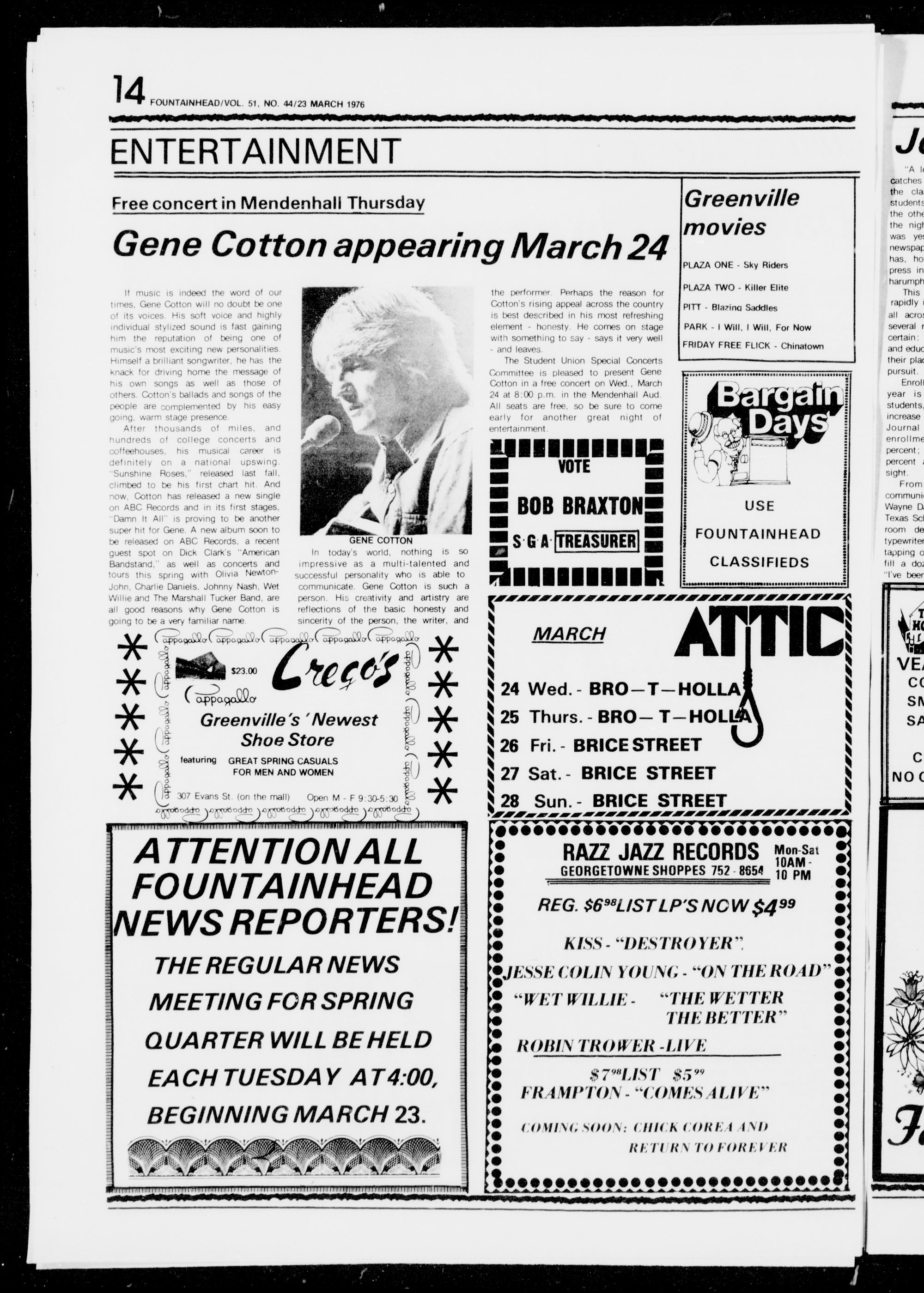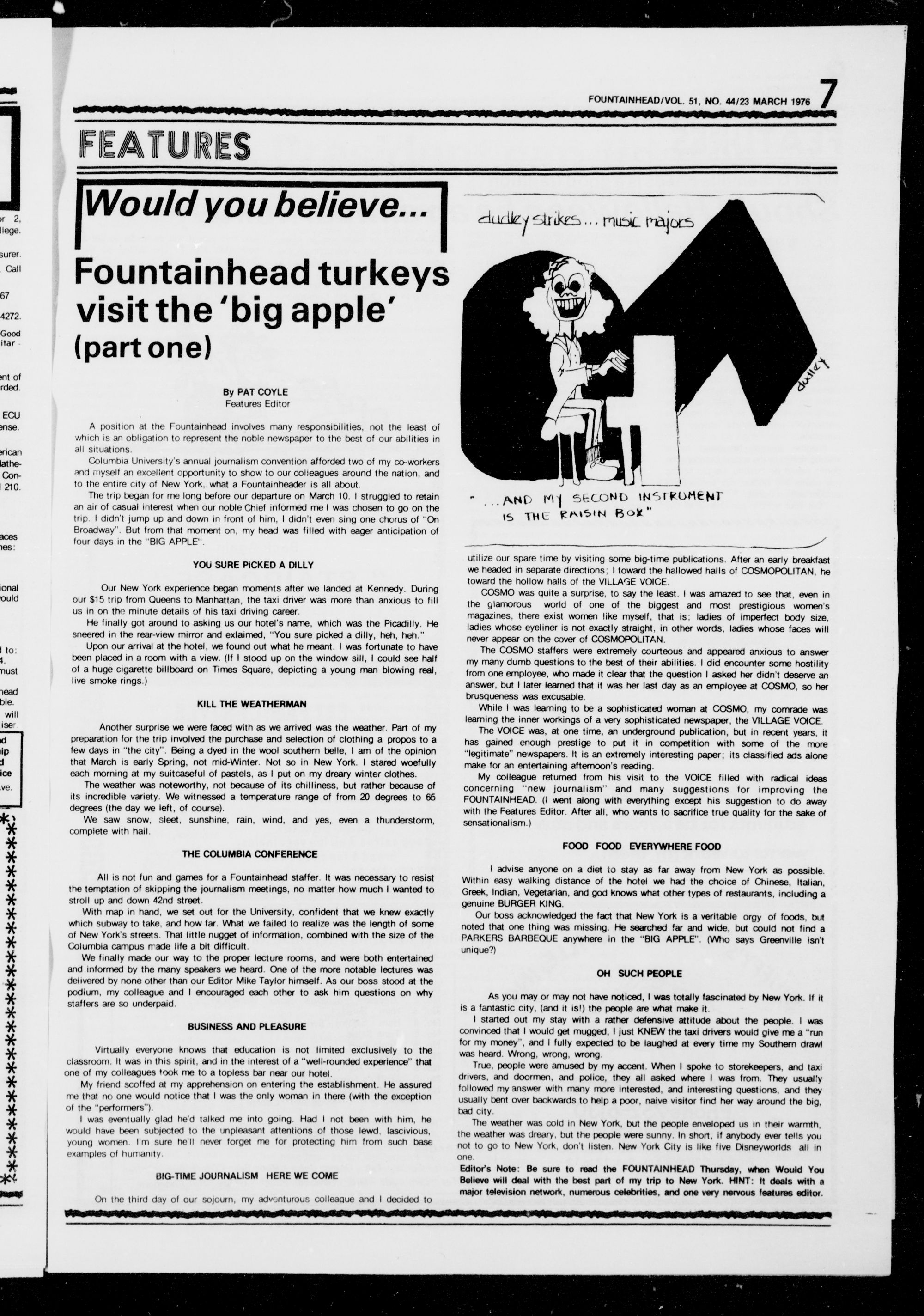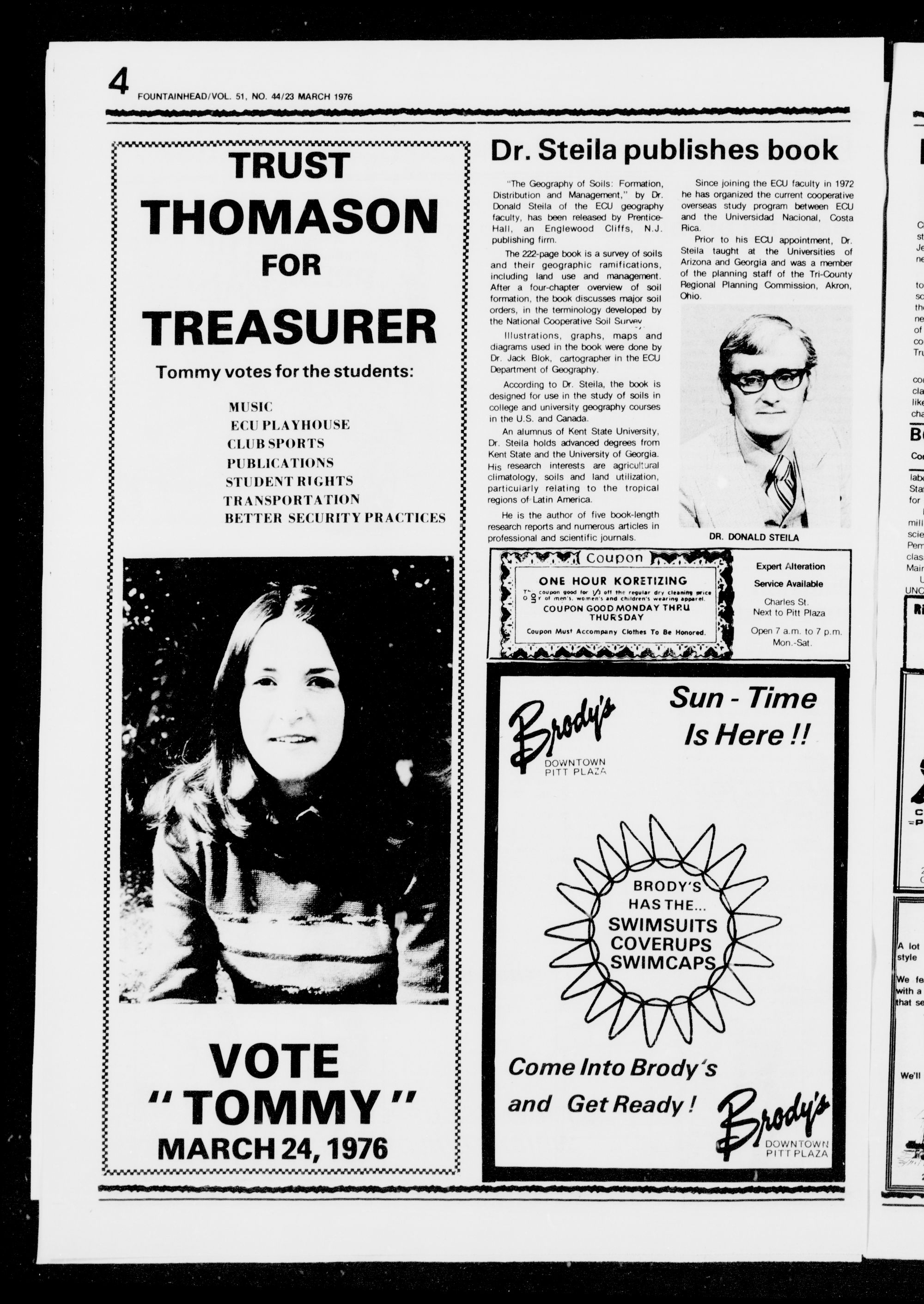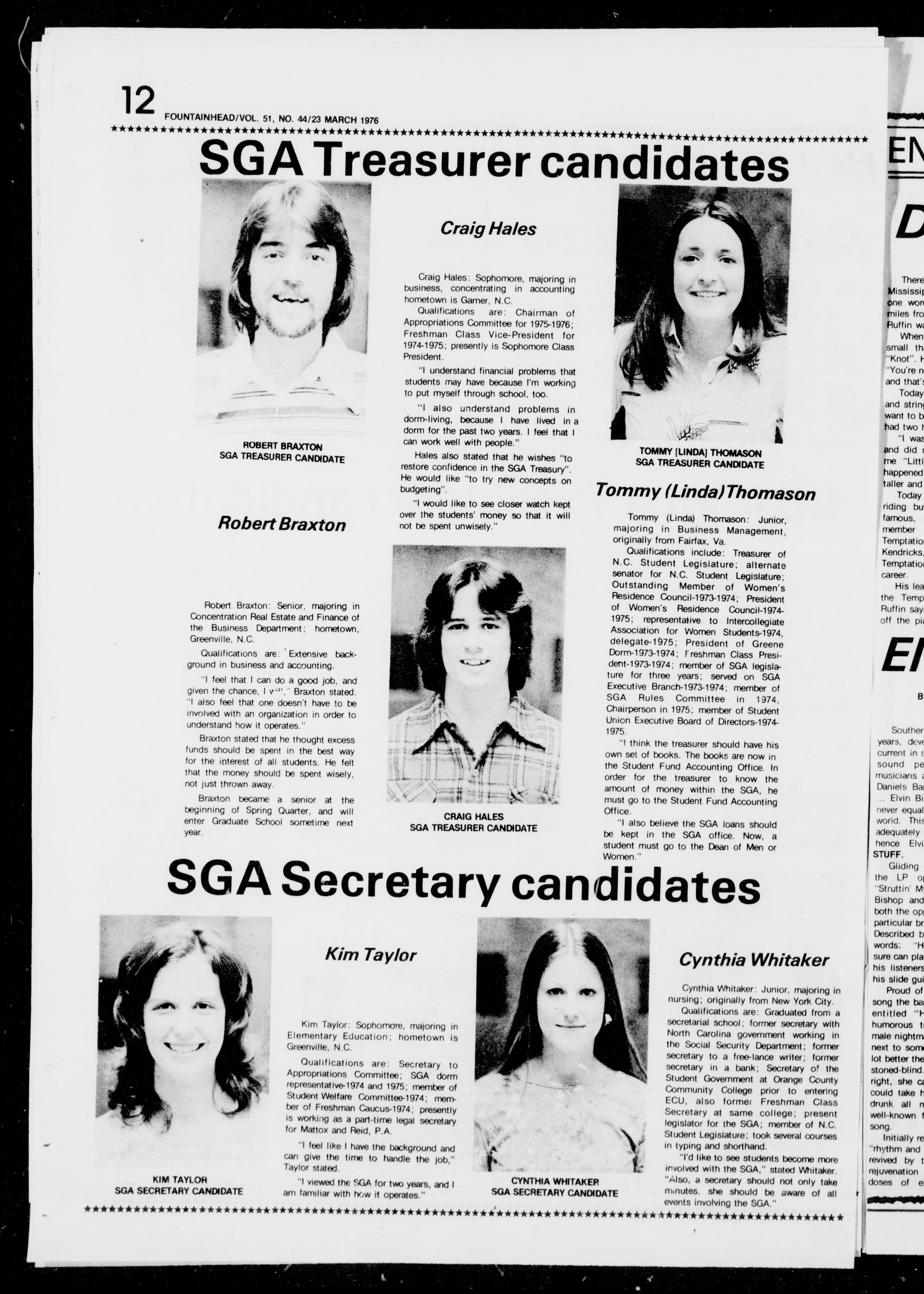 East Carolina's student-run campus newspaper was first published in 1923 as the East Carolina Teachers College News (1923-1925). It has been re-named as The Teco Echo (1925, 1926-1952), East Carolinian (1952-1969), Fountainhead (1969-1979), and The East Carolinian (1969, 1979-present). It includes local, state, national, and international stories with a focus on campus events.