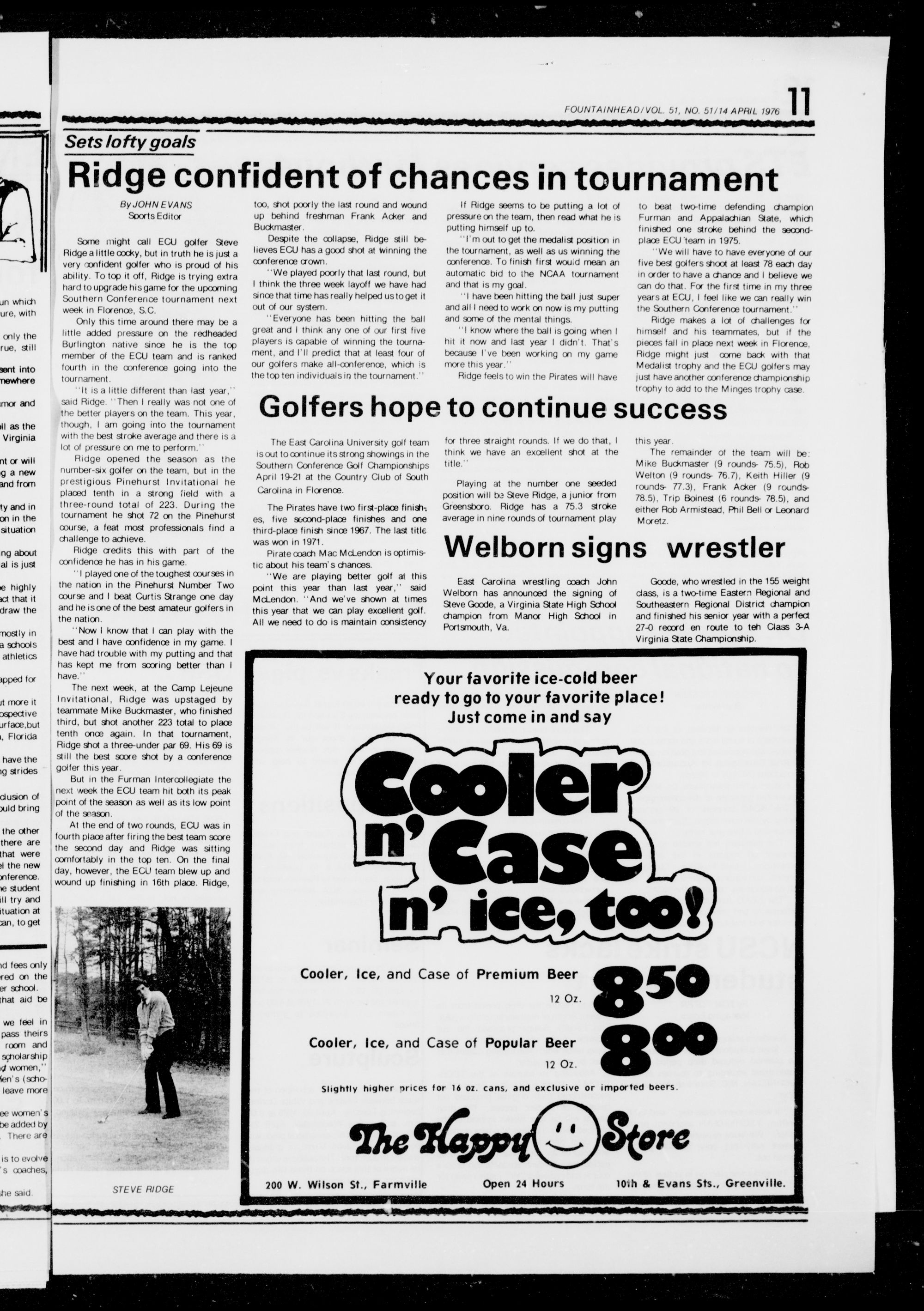 East Carolina's student-run campus newspaper was first published in 1923 as the East Carolina Teachers College News (1923-1925). It has been re-named as The Teco Echo (1925, 1926-1952), East Carolinian (1952-1969), Fountainhead (1969-1979), and The East Carolinian (1969, 1979-present). It includes local, state, national, and international stories with a focus on campus events.