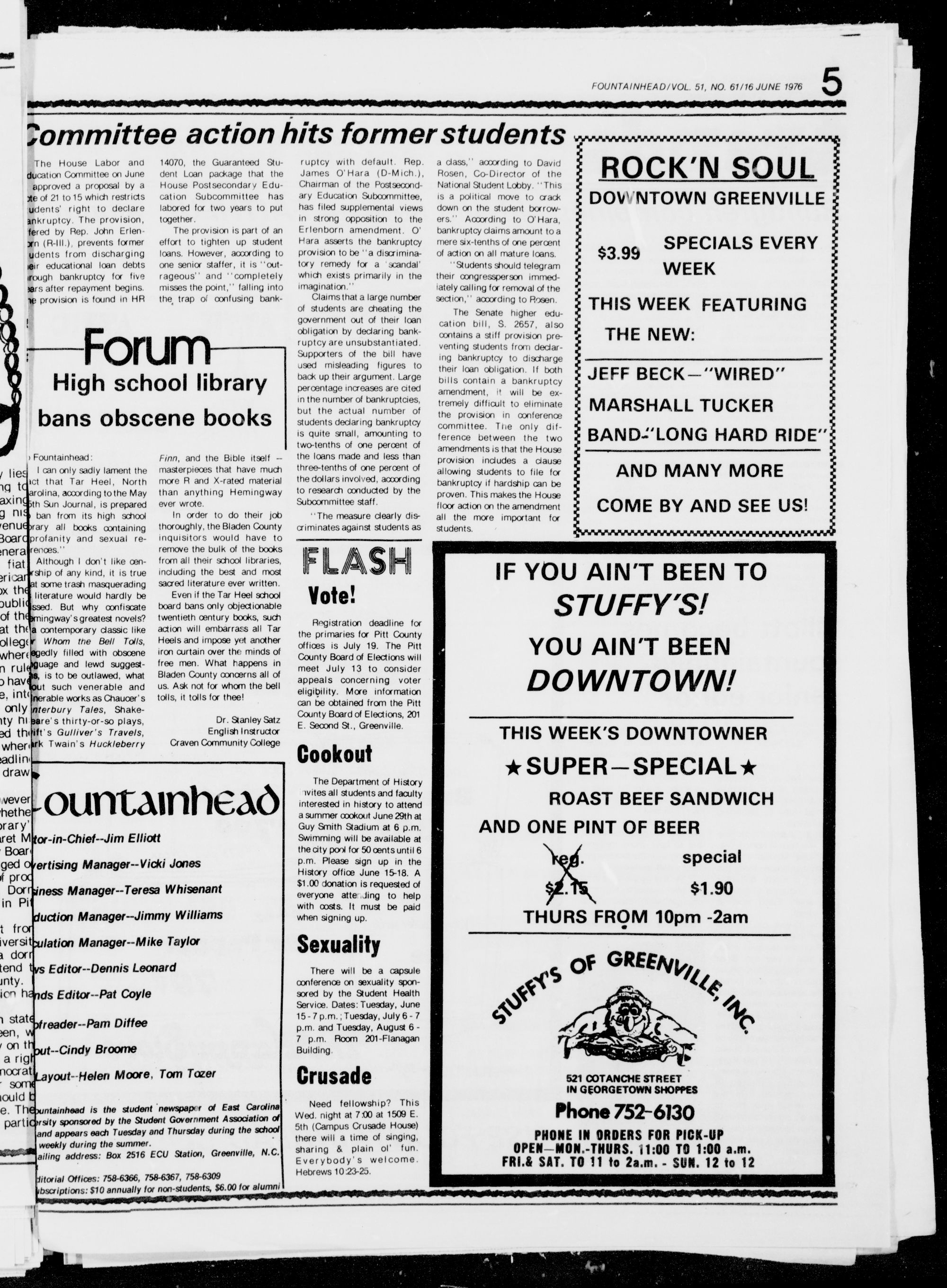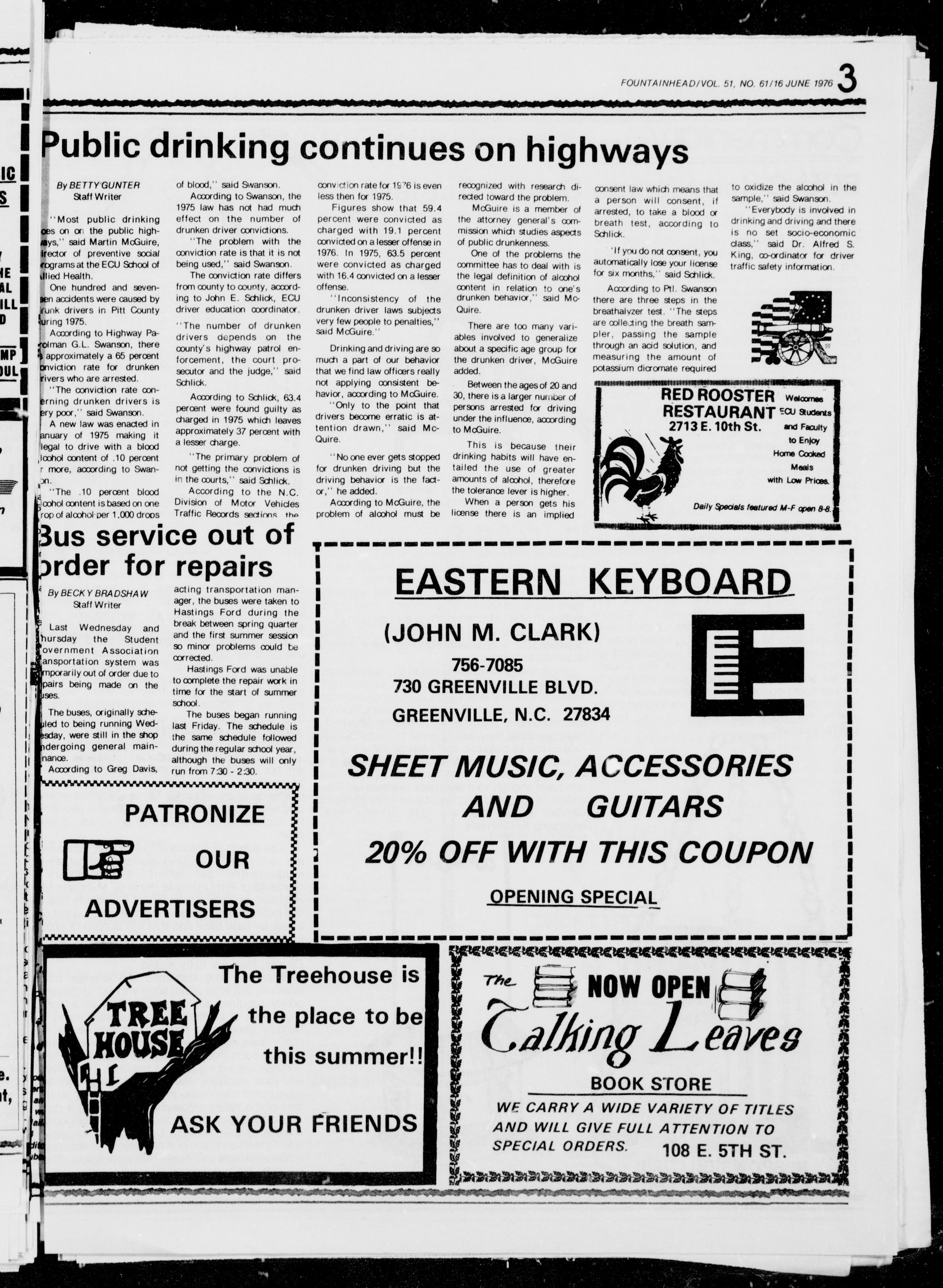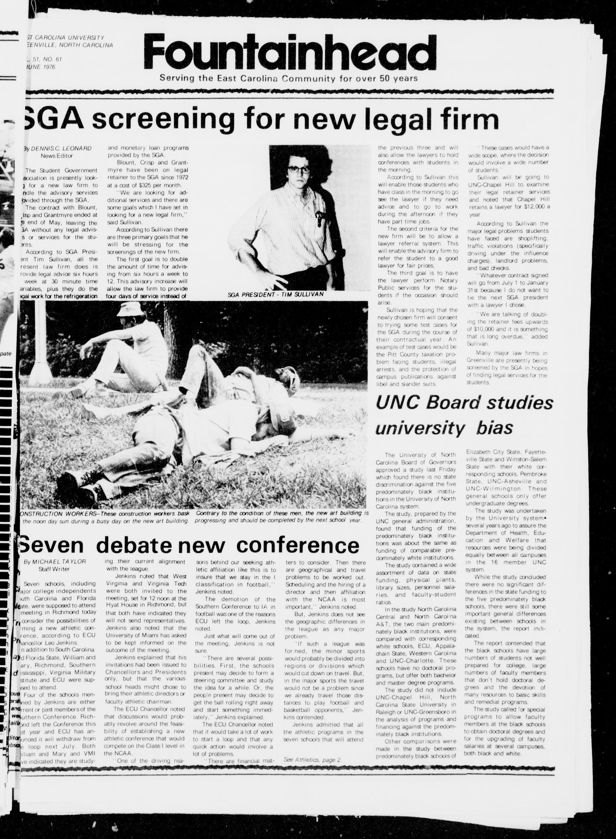 East Carolina's student-run campus newspaper was first published in 1923 as the East Carolina Teachers College News (1923-1925). It has been re-named as The Teco Echo (1925, 1926-1952), East Carolinian (1952-1969), Fountainhead (1969-1979), and The East Carolinian (1969, 1979-present). It includes local, state, national, and international stories with a focus on campus events.