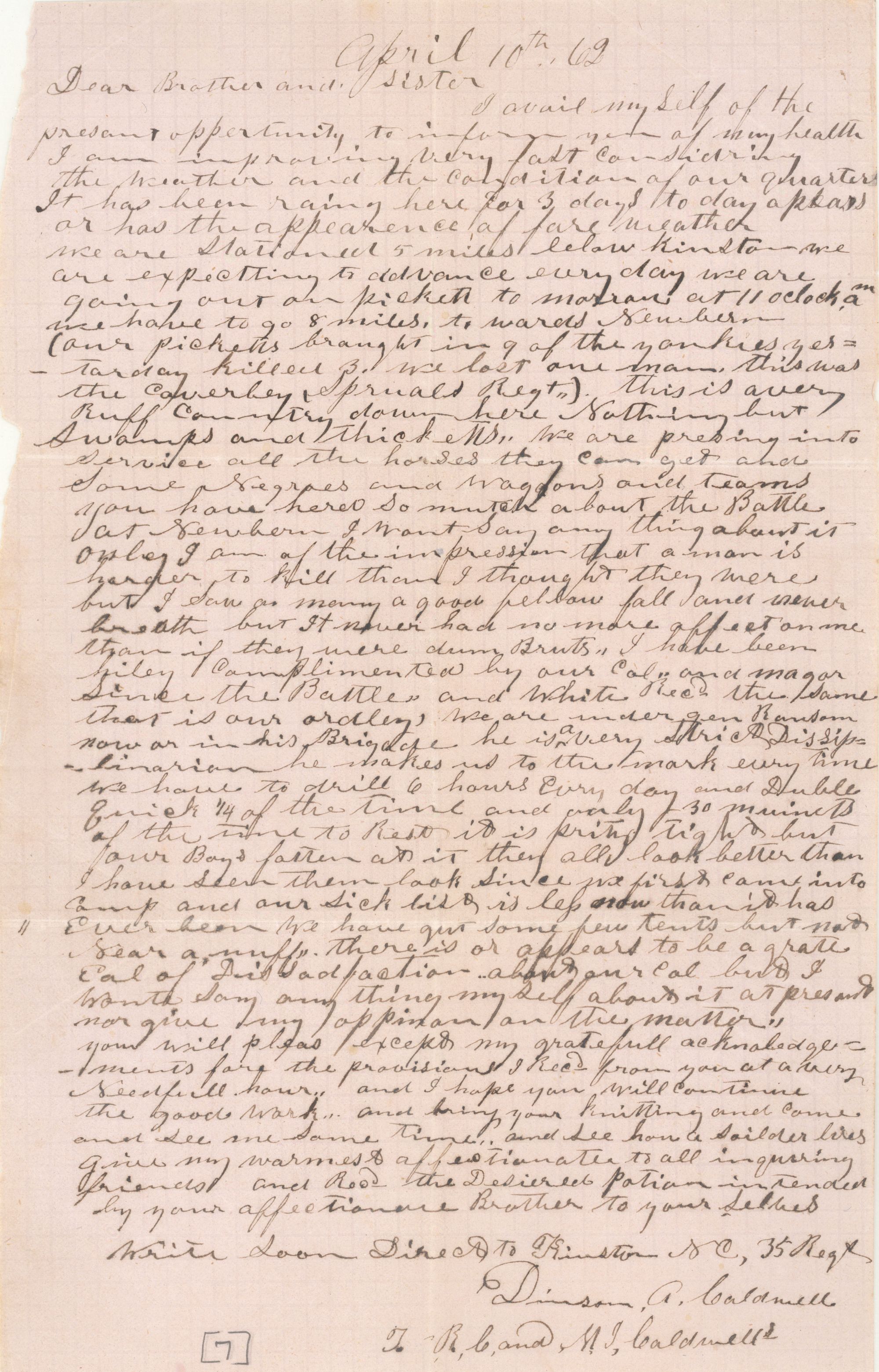I avail mySelf of the present opportunity to inform you of my health I am improving very fast considering the weather and the condition of our quarters It has been rainy here for 3 days to day [illegible] or has the appearence of fare weather we are stationed 5 miles below Kinston we are expecting to advance every day we are going out on picket[note] to morrow at 11 oclock,am we have to go 8 miles, to wards Newbern (our pickets brought in 9 of the Yankees yes=-terday killed 3. We lost one man, this was the caverley, Spruald Regt,,) this is avery Ruff country down here. Nothing but Swamps and thicketts,, we are presing into service all the horses they can get and Some Negroes and waggons and teams you have herd So mutch about the Battle at Newbern. I wont Say any thing about it only I am of the impression that a man is harder to kill than I thought they were but I Saw a many a good fellow fall and never breath but It never had no more affect on me than if they were dum bruts,, I have been hiley complimented by our Col.. and Magor[note] Since the Battle and White recd[note] the Same that is our ordley, We are under Gen Ransom now ar in his Brigade he is a very strict Dissip=-linarian he makes us to the mark every time we have to drill 6 hours every day and Duble quick ¼ of the time and only 30 minutes of the time to Rest it is prity tight but our Boys fatten[note] at it they all look better than I have seen them look Since we first came into camp and our Sick list is less now than it has Ever been we have gut Some few tents but not Near a nuff,,. There is or appears to be a grate deal of dissadfaction ..about our Col. but I wont Say any thing myself about it at present nor give my oppinon on the matter,, you will pleas except my gratefull acknoledge=-ments fore the provisions I Recd from you at a very Needfull hour,, and I hope you will continue the good work,, and bring your knitting and come and See me Sometime,, and See how a Soilder lives give my warmest affectionates to all inquiring friends and Recd the Desiered potian intended by your affectionare Brother to your Selves