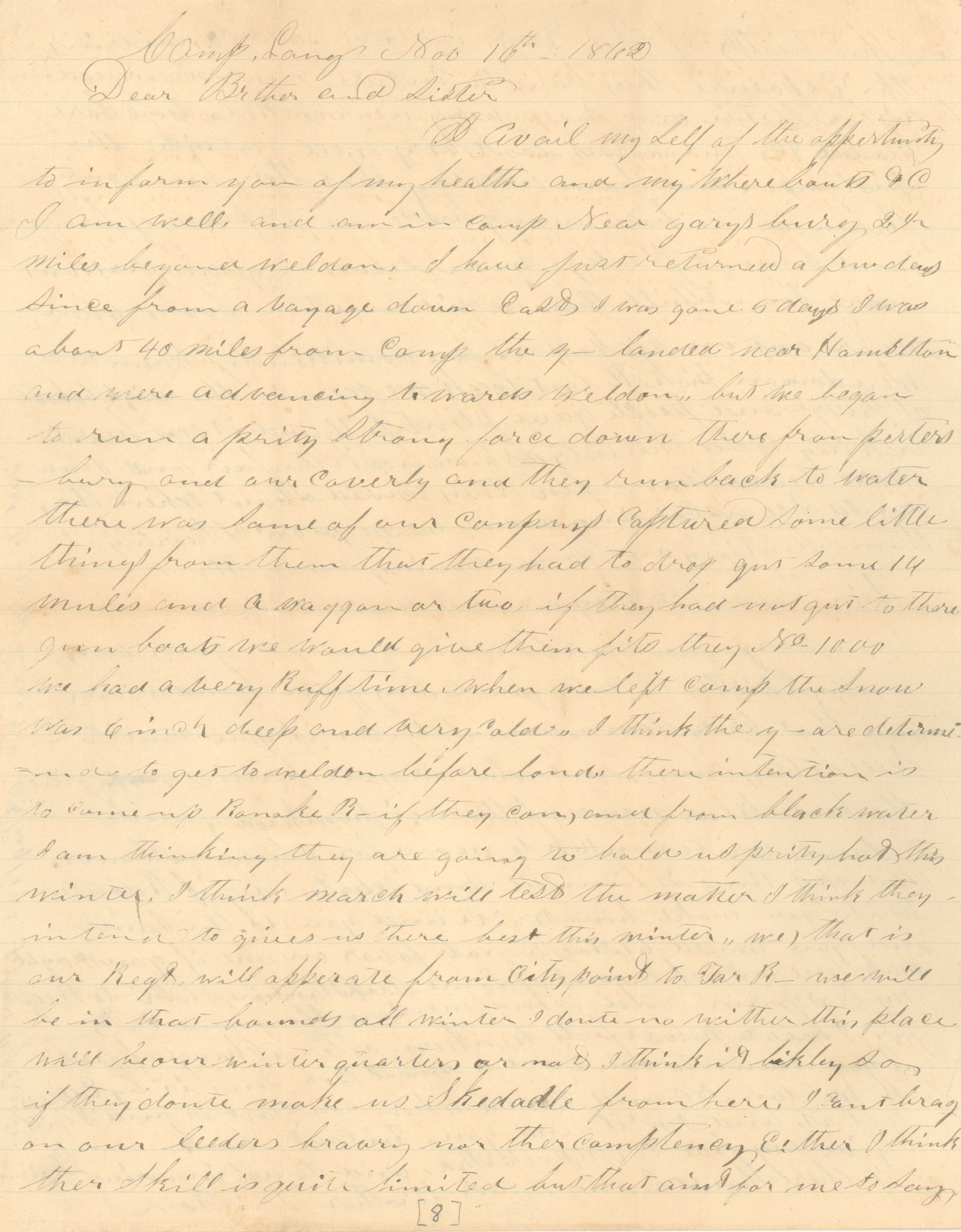 I Avail my Self of the opportunity to inform you of my health and my whereabouts etc. I am well and am in camp near Garysburg 24 miles beyond Weldon. I have just returned a few days Since from a voyage down East I was gone 5 days I was about 40 miles from camp the Y-[note] landed near Hamilton and were advancing toward Weldon,, but we began to run a prity Strong force down there from Peters-burg and our caverly and they run back to water there was Some of our company captured Some little things from them that they had to drop gut some 14 mules and a waggan or two if they had not gut to there gun boats we would give them fits they No 1000 we had a very Ruff time when we left camp the Snow was 6 inch deep and very cold,, I think the Y- are determi-=ned to get to Weldon before land,, there intention is to come up Ranoke R-[note] if they can, and from black water I am thinking they are going to hold us prity hard this winter. I think March will test the matter I think they intend to gives us there best this winter,, we, that is our Regt will operate apperate from city points to Tar R- we will be in that boundry all winter I donte no wether this place will be our winter quarters or not I think it likely so if they donte make us skedadle from here. I cant brag on our leeders bravry nor ther comptency either. I think ther Skill is quite limited but that aint for me to Say.