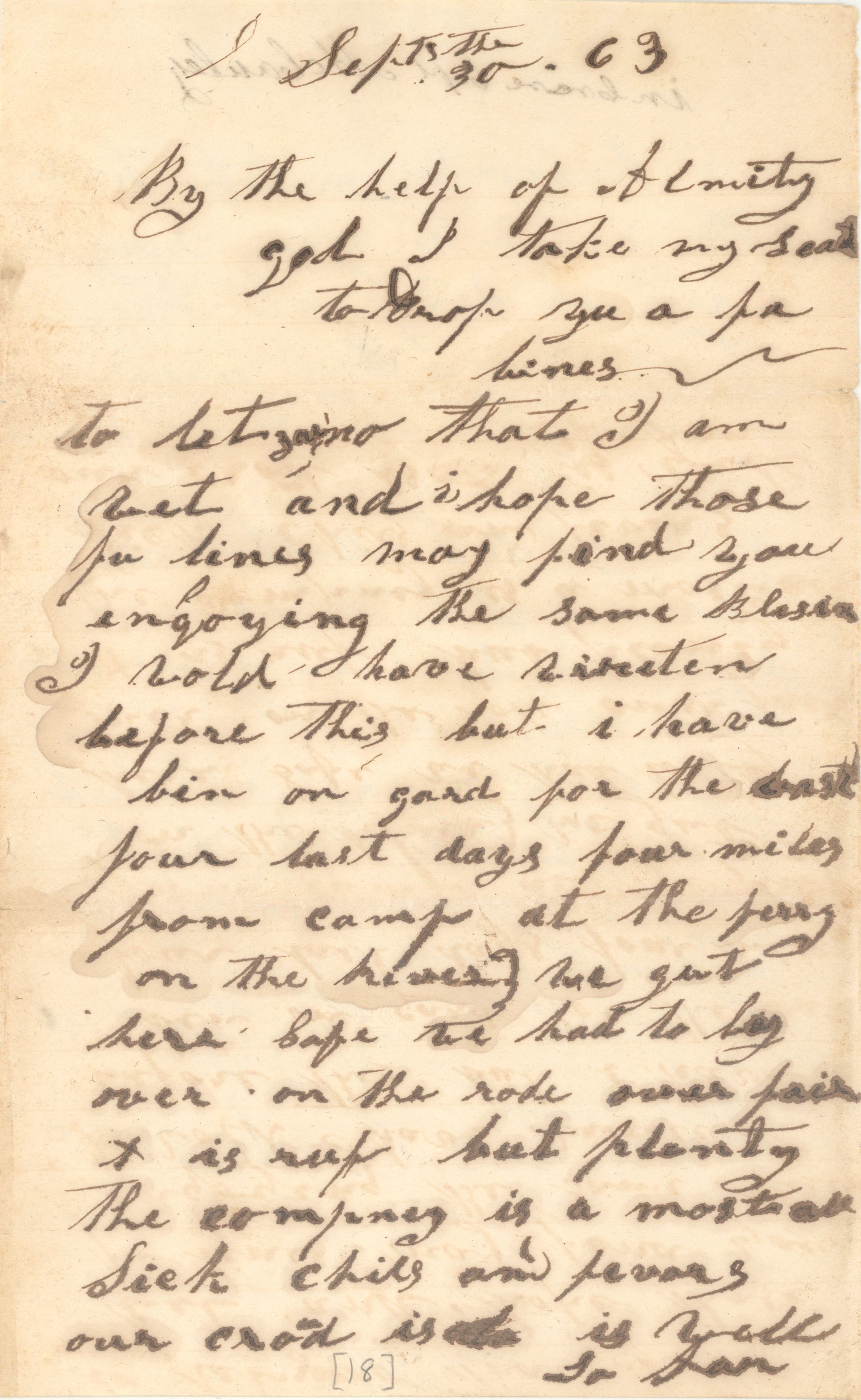 By the help of Almity god I take my seat to drop you a few lines to let you no that I am wet and i hope those fu lines may find you engoying the same Blessin[note] I wold have wireten before this but i have bin on gard for the last four days last days four miles from camp at the ferry on the river we gut here safe we had to lay over on the rode over fair it is ruf but plenty The compny is a most all Sick chils and fevers our crowd is [illegible text] is well so far