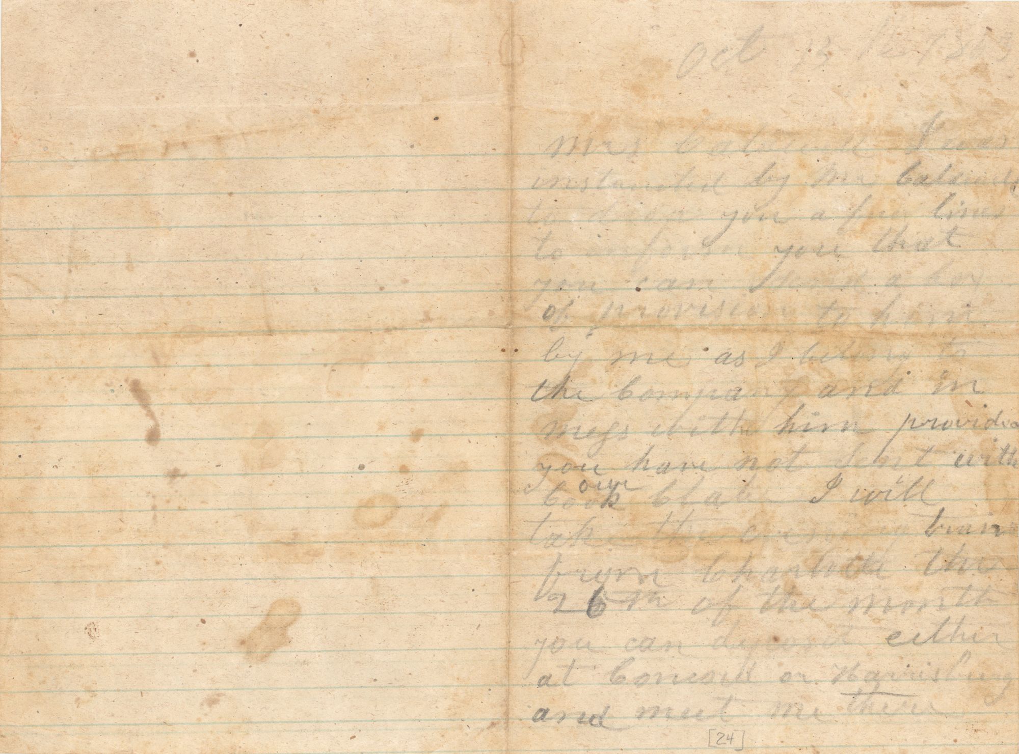Mrs Caldwell I was instructed by Mr Caldwell to drop you a few lines to inform you that you can send a box of provisions to him by me as I belong to the Company and in mess with him providing you have not sent with our cook Clab I will take the company train from Charlotte the 26th of the month you can deposit either at Cornwall or Harrisburg and met me there
