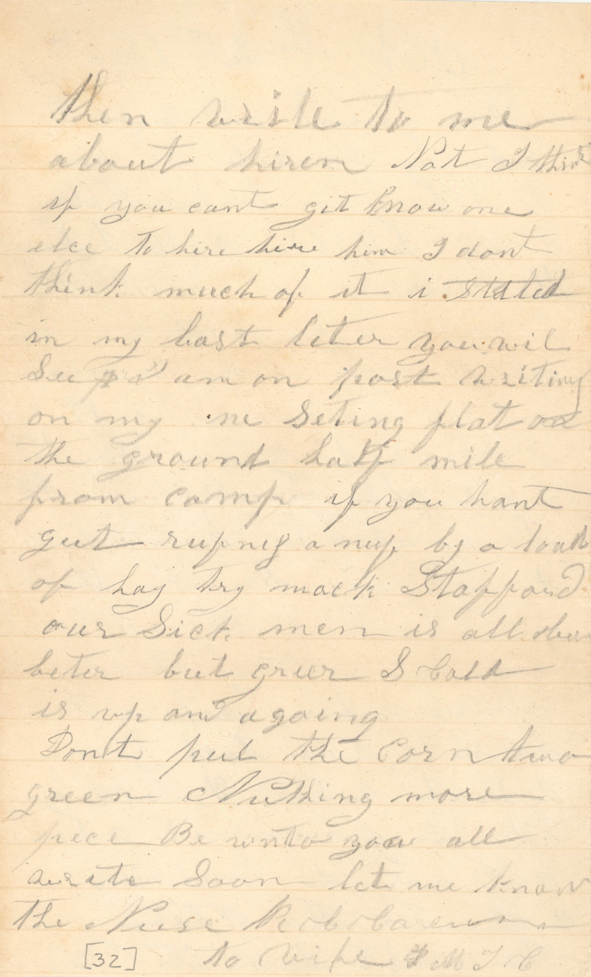 then write to me about hiren Nat I think if you can't git know one else to hire hire him I don't think much of it I Stated in my last leter you wil Su[illegible] I am on post writing on my ne seting flat the ground half mile from camp if you hant gut rufing a nuf by a load of hay try mack Stafford our Sick men is all but beter but greer S Cald is up and a going Dont put the corn two green