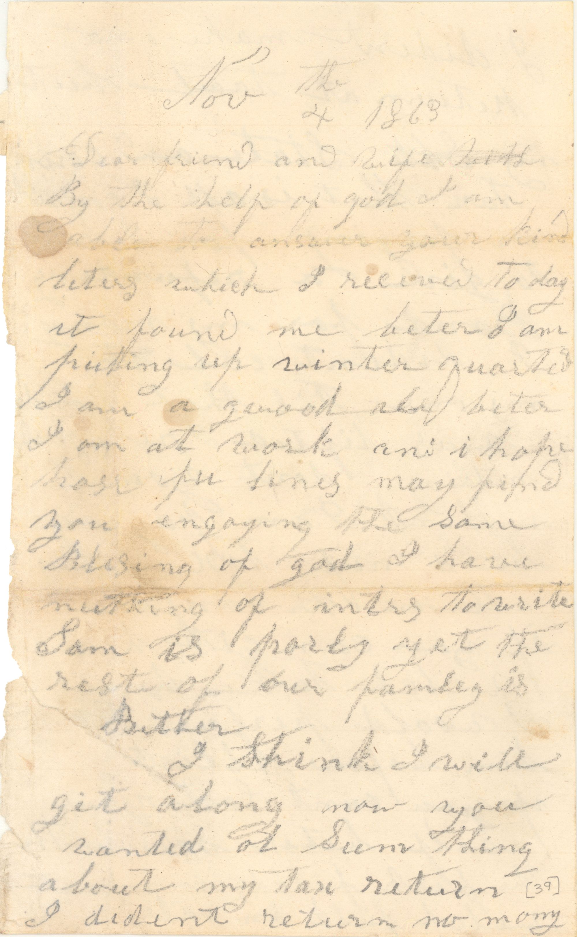 By the help of god I am able to answer your kind leters which I receved to day it found me beter I am puting up winter quarters I am a goood abe beter I am at work and i hope those fu lines may find you engoying the Same Blessing of god I have nuthing of intrs to write Sam is porly yet the rest of our famley is Better