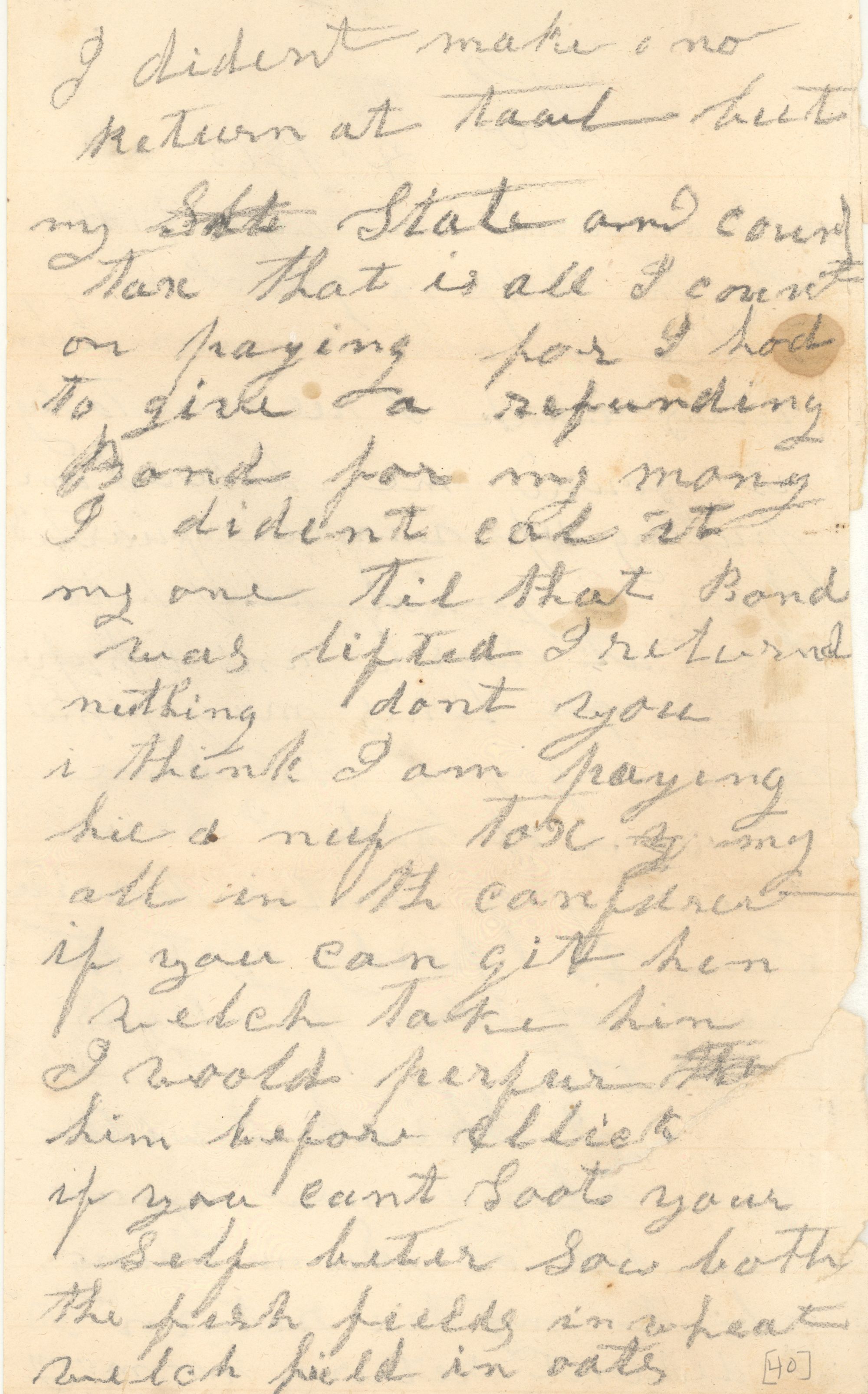 I dident make no return at tawl but my State and county tax that is all count on paying for I had to give a refunding Bond for my mony I dident cal it my one til that Bond was lifted I returned nothing dont you I think I am paying him a nuf tax my all in the confdrert if you can git Hen Welch take him I woold perfur him before Ellie if you cant Soot your Self beter Sow both the first fields in wheat Welch field in oats (letter stops--pages missing or lost).