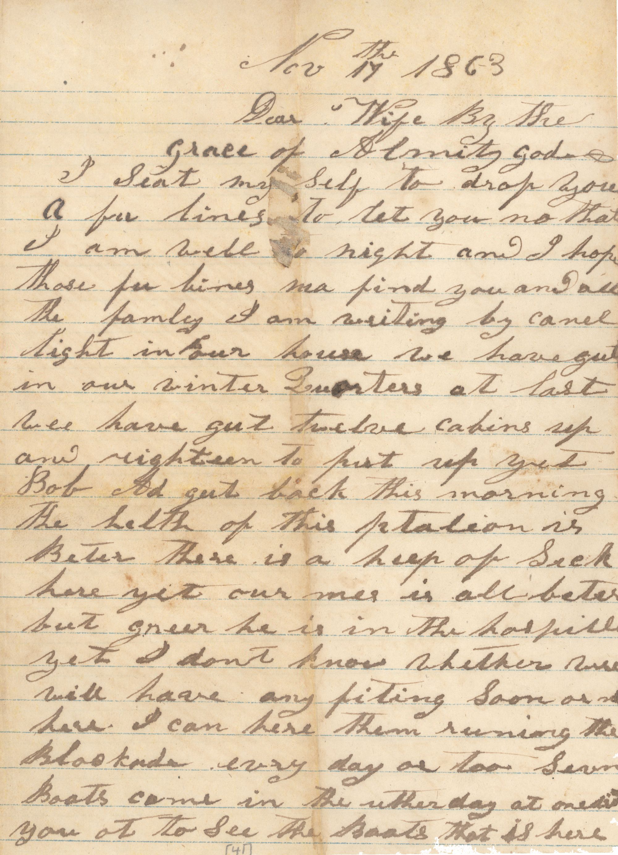 By the grace of Almity god I seat my self to drop you a fu lines to let you no that I am well to night and I hope those fu lines ma find you and all the family I am writing by canel light in our house we have gut in our winter quarters at last we have gut twelve cabins up and nighteen to put up yet Bob Ad gut back this morning the helth of this ptalion is beter there is a heep of Sick here yet our mes is all beter but greer he is in the hospitle yet I dont know whether very will have any fiting Soon or not here I can here them runing the blockades every day or too Sevn boats came in the uther day at one did you ot to See the boats that is here