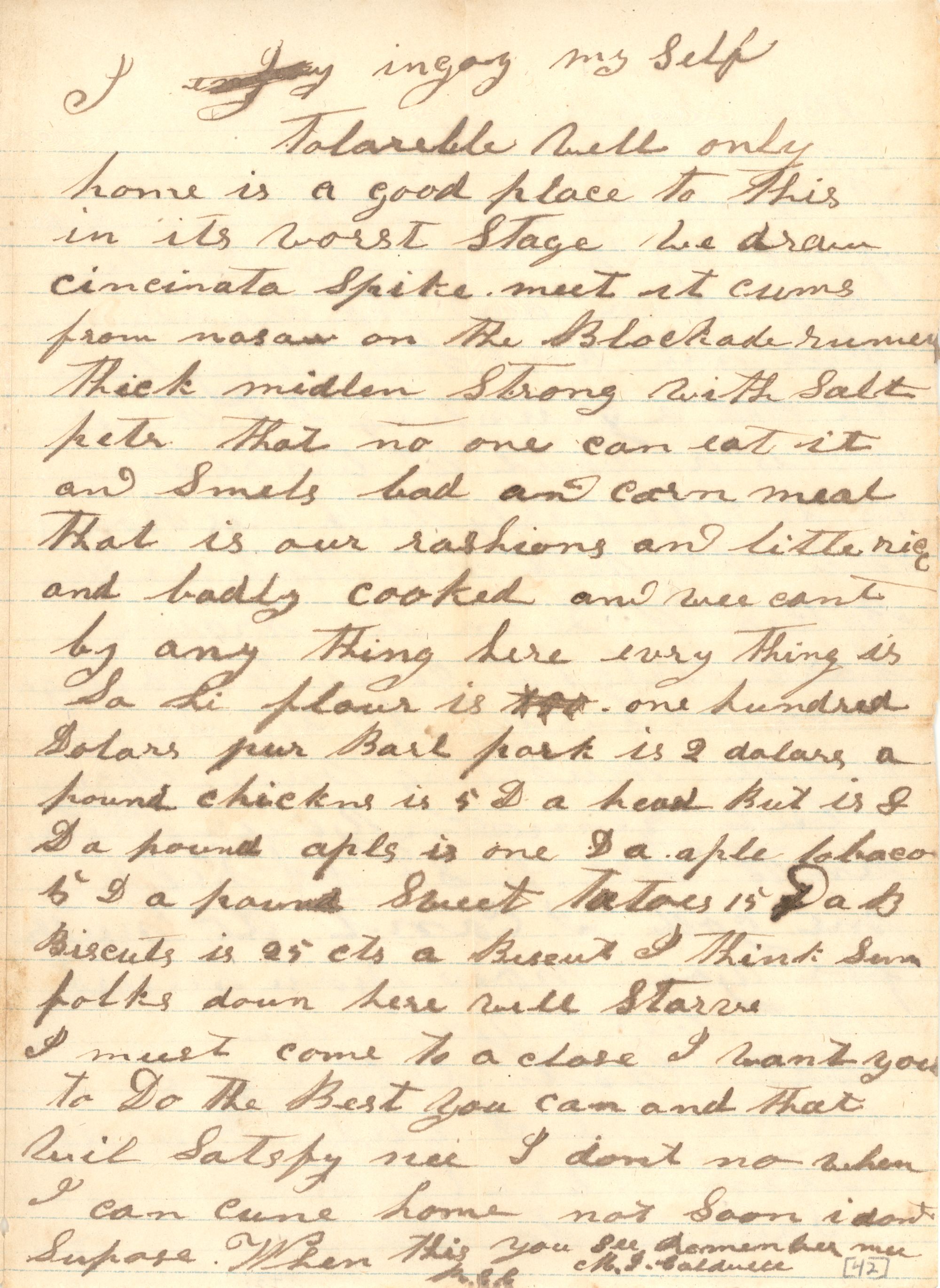 I ingoy my Self tolareble well only home is a good place to this in its worst Stage we draw cincinata Spike meet it cums from nasaw on the Blockade[note] rumey thick midlen Strong with Salt petr that no one can eat it and Smels bad and corn meal that is our rashions an little rice and badly cooked and we cant by any thing here evry thing is So hi flour is one hundred dolars pur Barl pork is 2 dolars a pound chickens is 5 D a head but is 8 D a pound apls is one D a aple tobaco 3 D a pound sweet tatoes 15 D a pound Biscuts is 25 cts a Biscut I think sum folks down here will Starve I must come to a close I want you to Do the Best you can and that wil Satsfy me I dont no when I can cume home not Soon i dont Supose.