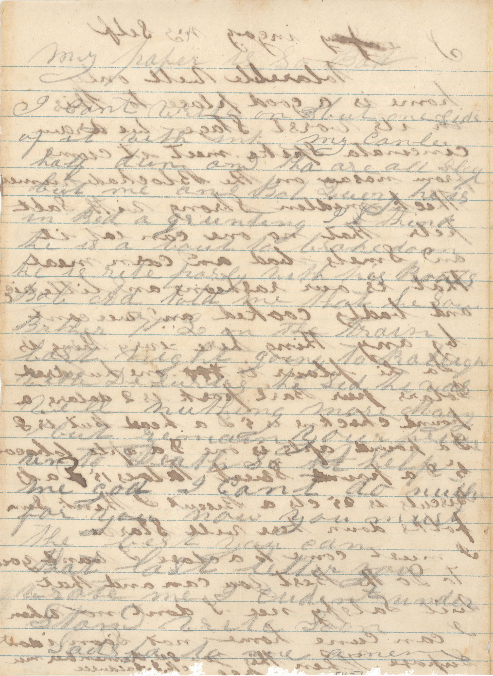 My paper is So bad I cant write on but one side of it with ink my canle half dun an tha are all sleep but me and Bob Query he is in Bed a grunting I think he is a bout to brake down he is rite porly with his boats Bob A told me that he saw brother L on the train last night gone to Raleigh with DeSurlog he Sed he was well nuthing more Magg but remain your friend unto death so help me god I cant do nuth for you now you must the best you can that last letter you wrote me I cudent understand write Soon Satisfied to me amen