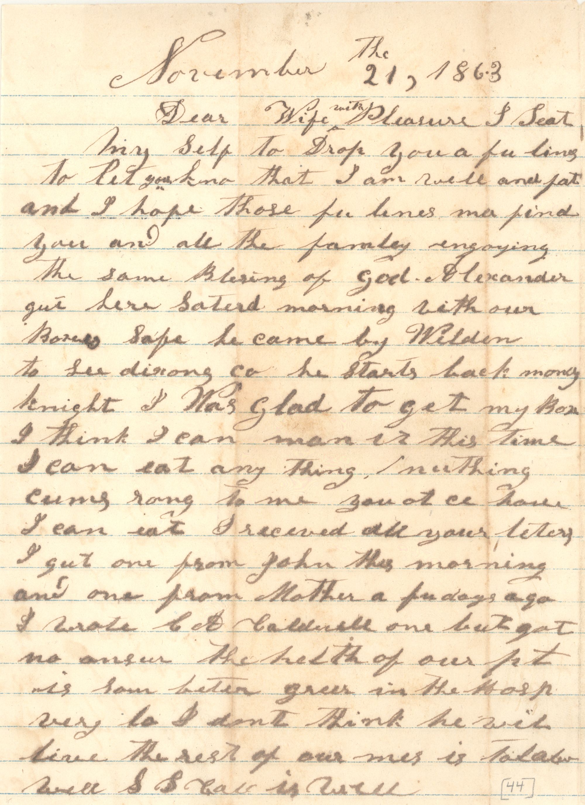 With Pleasure I Seat my Self to drop you a fu lines to let you kno that I am well and fat and I hope those fu lines ma find you and all the family engoying the same blesing of god. Alexander gut here Saterd morning with our Boxes Safe he came by Wilden to Lee divons co he starts back Monday knight I Was glad to get my Box I think I can man it this time I can eat any thing. nuthing cums rong to me you ot a have I can eat I receved all your leters I gut one from John this morning and one from Mother a fu days ago I wrote C.A. Caldwell one but got no ansur the helth of our pt[note] is som better Greer in the hosp very long I dont think he wil live the rest of our mes is tolable well S S Call is well
