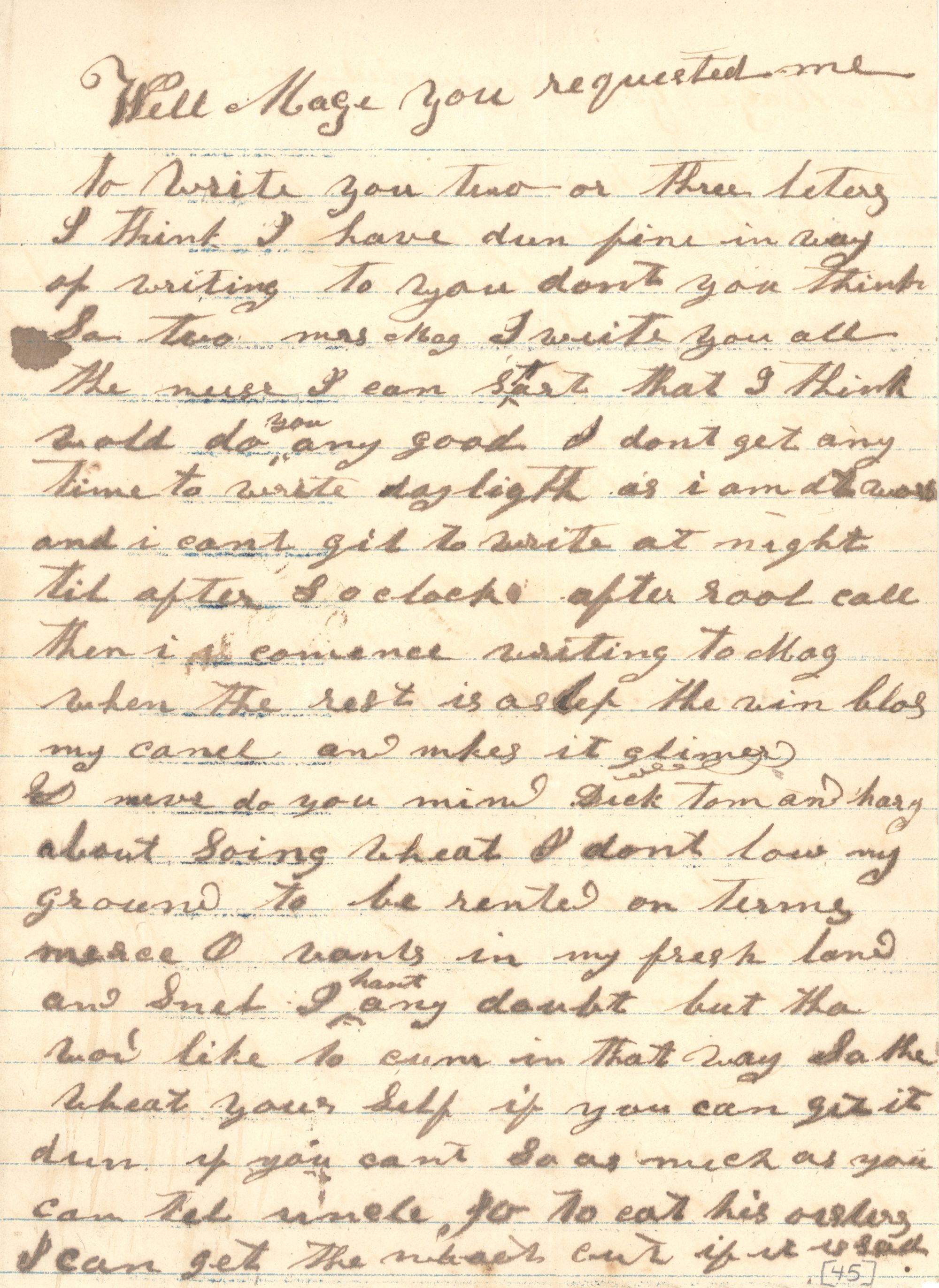 Well Mag you requested me to write you two or three leters I think I have dun fine in way of writing to you dont you think So two Mrs Mag I write you all the nuse I can start that I think wold do you any good I dont get any time to write day ligth is I am at work and I cant git to write at night til after 8 o clock after rool call then i comence writing to Mag when the rest is aslep the win blos my canel and mkes it glimer never do you mind Dick Tom and Hary about Soing wheat I dont low my ground to be rented on terms merce wants in my fresh land and [illegible] I hant any doubt but tha war like to cum in that way So the wheat your Self if you can get it dun if you cant So as much as you can tel uncle Jo to eat his oysters I can get the wheat cut if it is back (the letter ends here with an accompanying first draft)