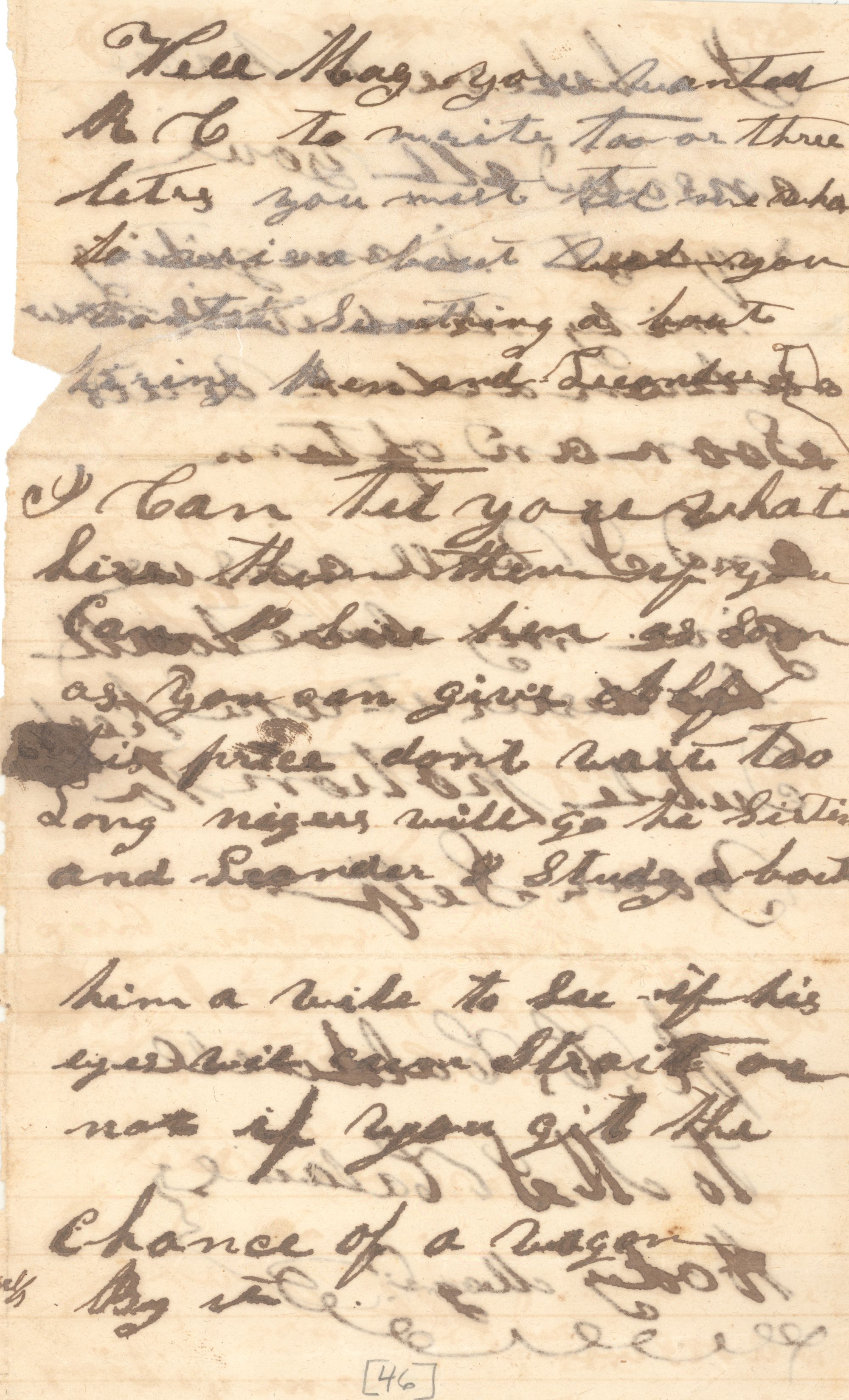 Well Mag you wanted R C to write too or three letrs you must tel me wha to wrie a bout wat you wanted something a bout hiring men and Leeanders I can tel you what hires then them if you can hire him as soon as you can give alf his price dont wait too long nigers will go hi Sister and Leander study about him a wile to see if his eyes wil cum strait or not if you git the chance of a wagon by it