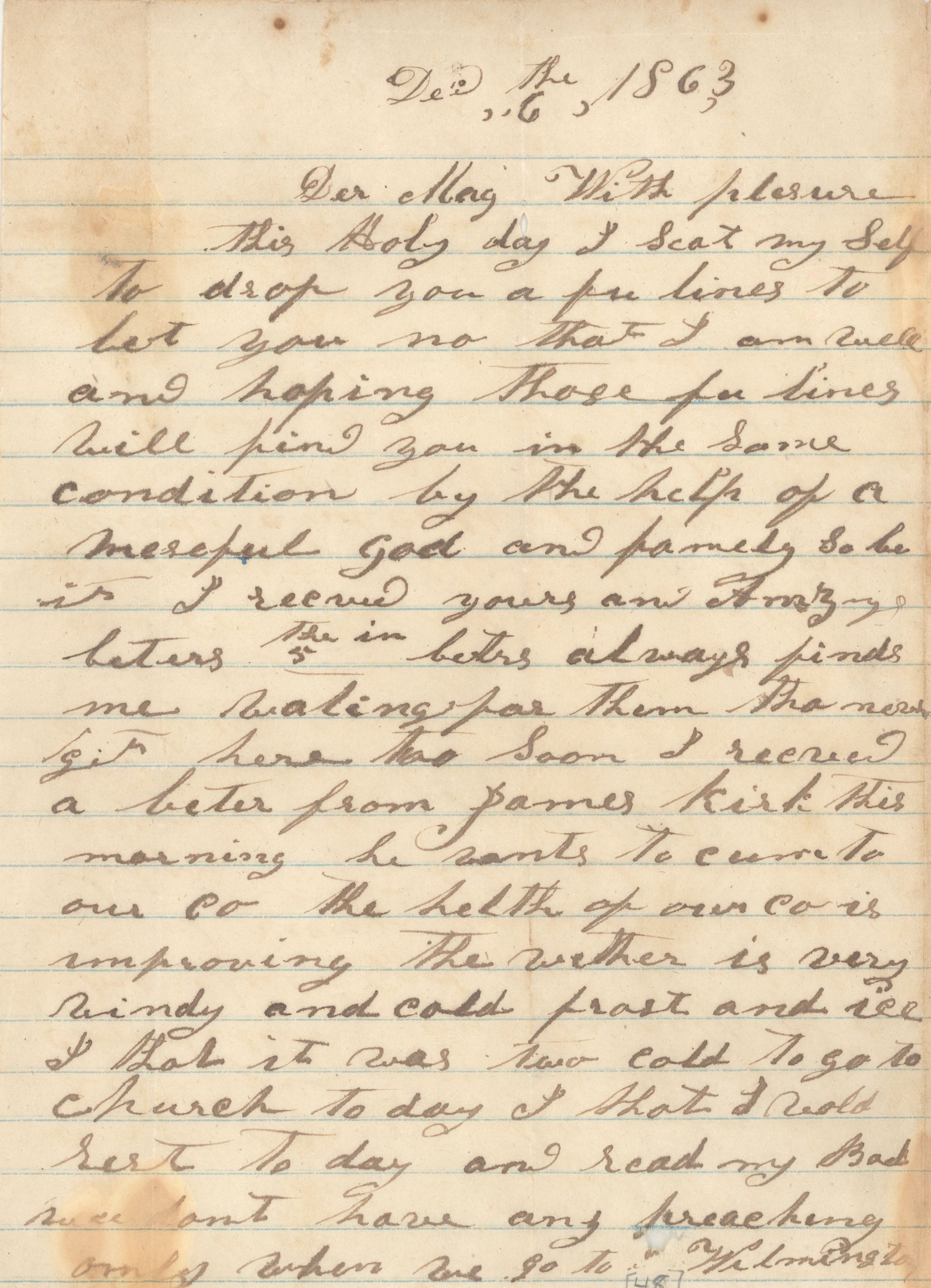 With plesure this Holy day I seat my Self to drop you a fu lines to let you no that I am well and hoping those fu lines will find you in the same condition by the help of a meseful God and family So be it I recevd yours an Amzis leters the in 5 leters always finds me wating for them tha never git here too Soon I recved a leter from James Kirk this morning he wants to cum to our co the helth of our co is improving the wether is very windy and cold frost and ice I thot it was two cold to go to church to day and read my book we dont have any preaching only when we go to Wilmington