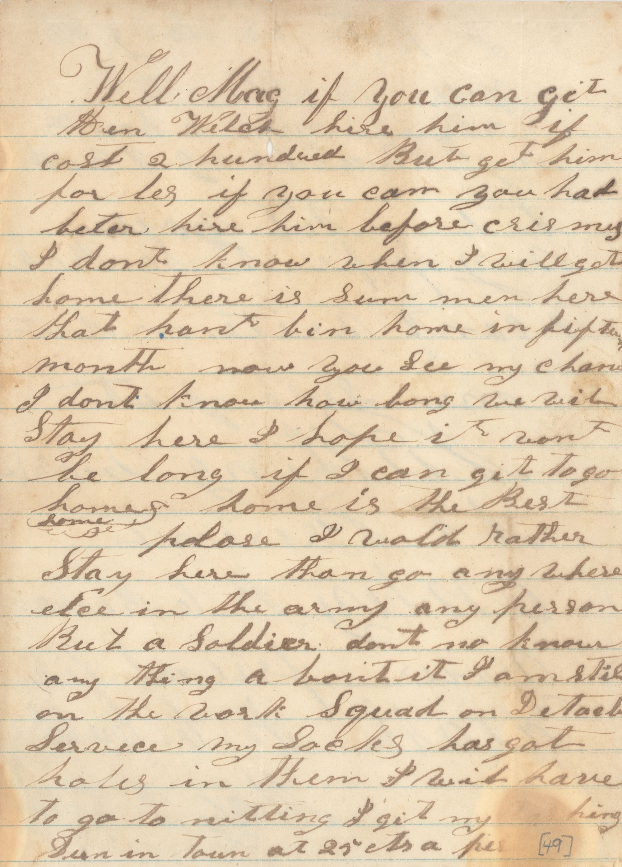 Well Mag, if you can git Hen Welch hire him it cost 2 hundred but get him for les if you can you had beter hire him before crismus I dont know when I wil get home there is sum men here that hant bin home in fifteen month now you see my chance I dont know how long we wil stay here I hope it wont be long if I can git to go home home is the best pelase I wold rather stay here than go any where elce in the army any person But a Soldier dont no know any thing a bout it I am stil on the work Squad on Detach Service my Socks has got holes in them I wil have to go to nitting I git my washing dun in town at 25 cts a pese