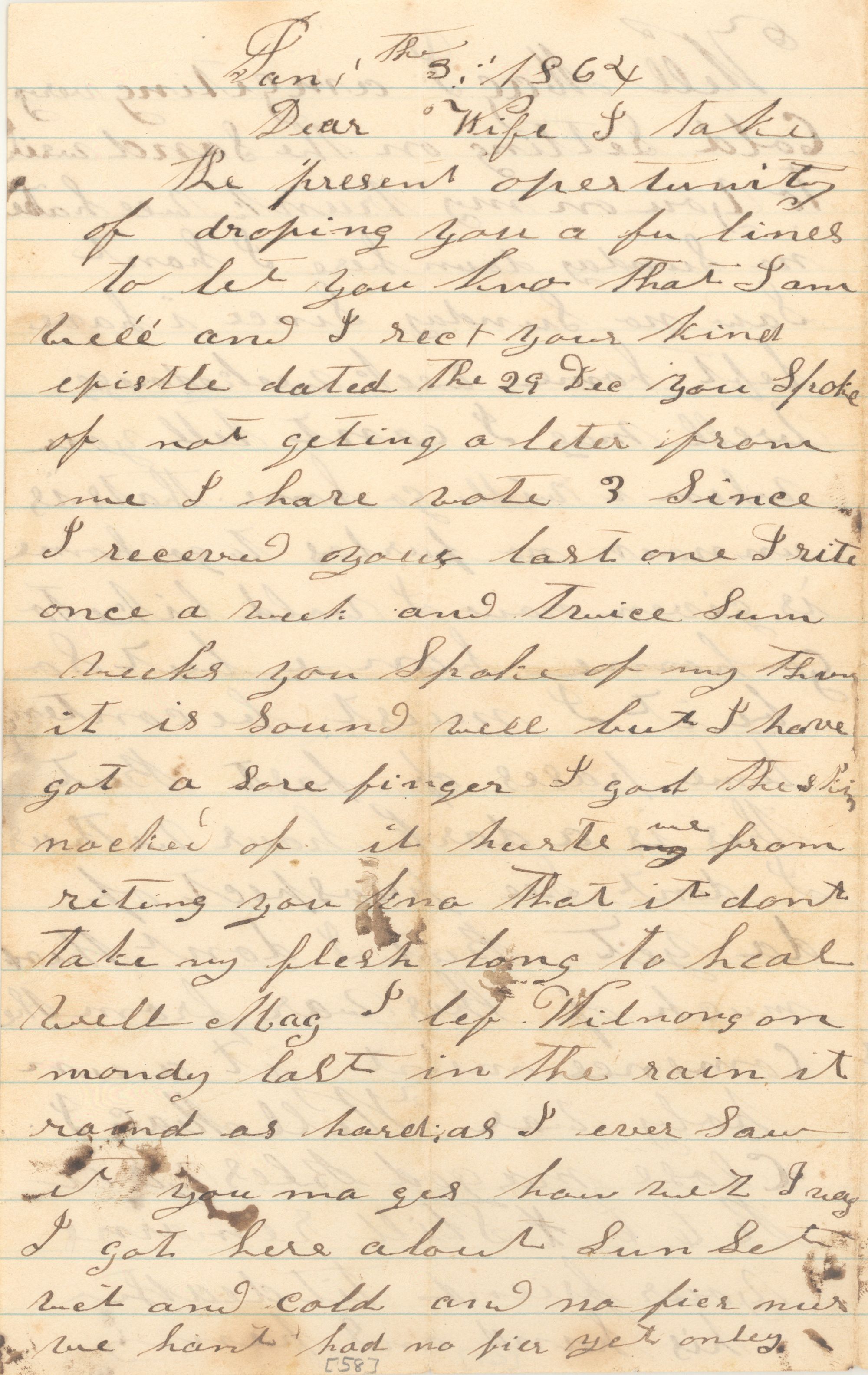 I take the present opertunity of droping you a fu lines to let you kno that I am well and I recd your kind epistle dated the 29 Dec you spoke of not geting a leter from me I have wote 3 Since I receved your last one I rite once a week and twice Sum weeks you spoke of my thum it is Sound well but I have got a sore finger I got the skin nocked of it hurte me from riting you kno that it dont take my flesh long to heal well Mag I lef Wilnong on mondy last in the rain it raind as hard as I ever Saw it you ma ges how wet I was I got here about Sun Set wet and cold and no fier nur we hant had no fier yet onley