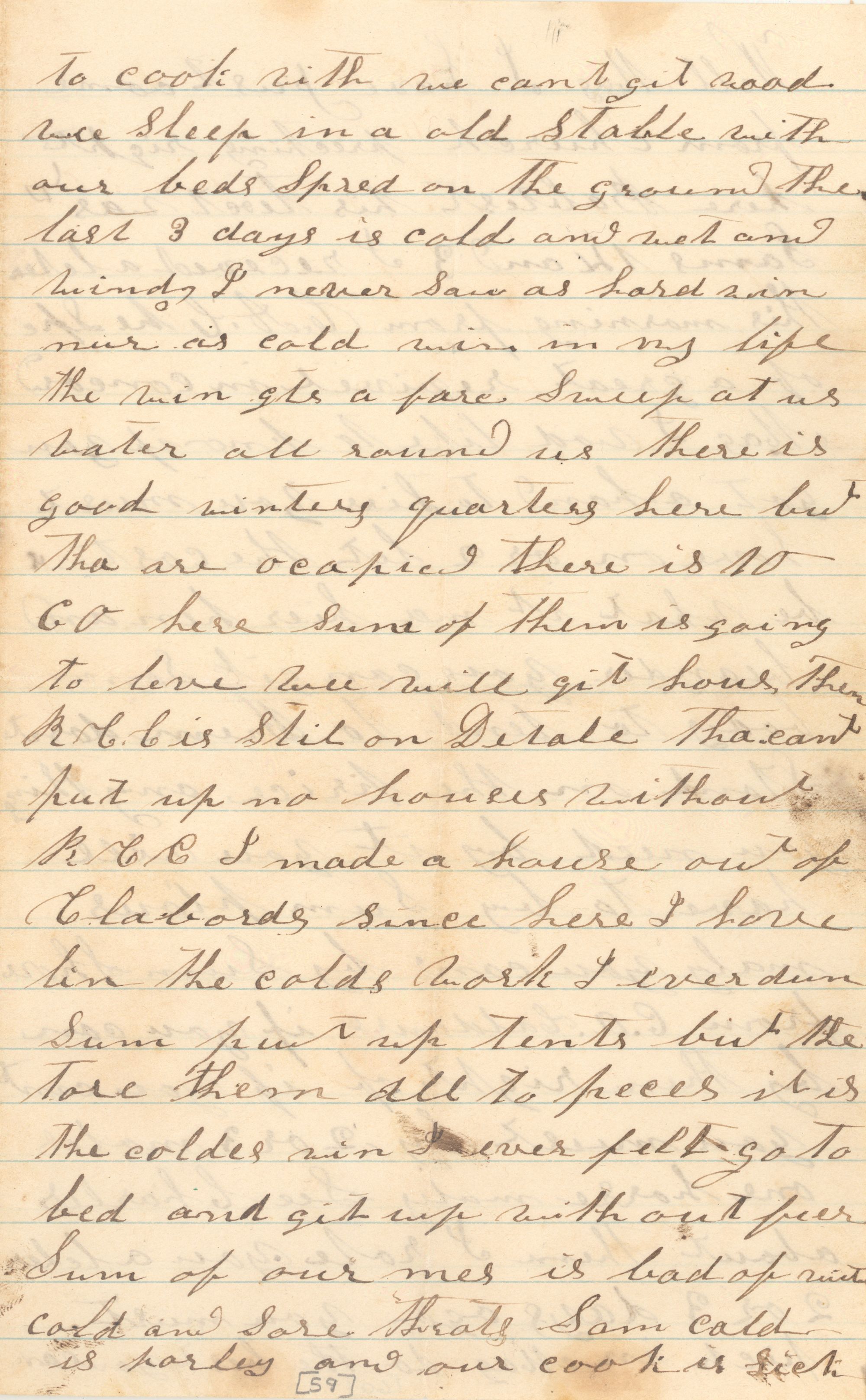 to cook with we cant git wood we Sleep in a old Stable with our beds Spred on the ground the last 3 days is cold and wet and windy I never saw as hard win nur as cold win in my life the win gits a fare sweep at us water all round us there is good winters quarters here but tha are ocapied there is NO CO[note] here Sume of them is going to leve wee will git hous then R.C.C. is Stil on Detale tha cant put up no houses without R.C.C. I made a house out of clabords since here I have bin the colds work I ever dun sum put up tents but the tore them all them peces it is the coldes win I ever felt go to bed and git up with out fier Sum of our mes is bad of with cold and sore throats Sam cold is porley and our cook is Sick