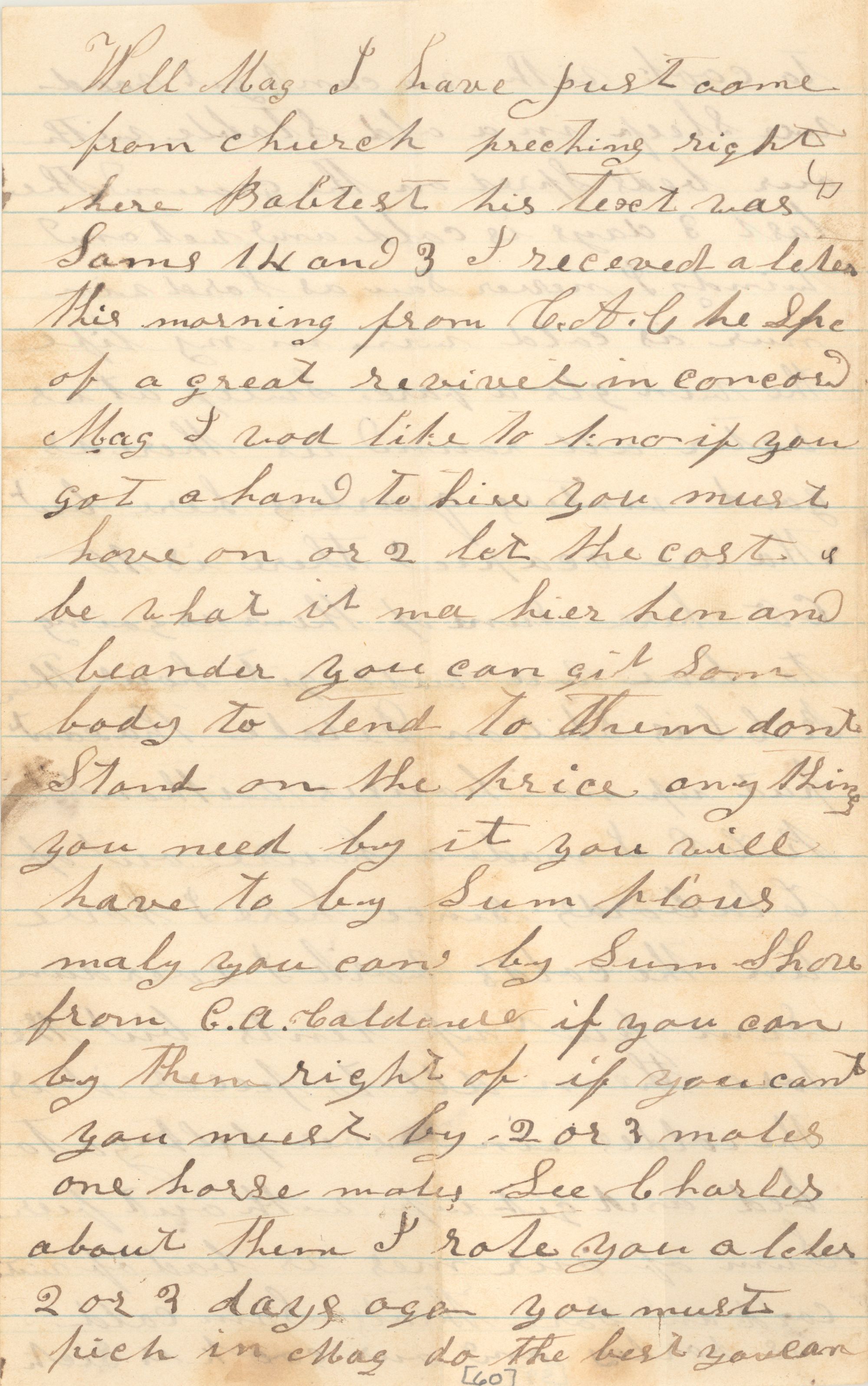 Well Mag I have just come from church preching right here Babtest his text was Sams[note] 14 and 3 I receved a leter this morning from C.A.C. he spo of a great revivel in Concord Mag I wod like to know if you got a hand to hire you must have on or 2 let the cost be what it ma hier Hen and Leander you can git som body to tend to them dont Stand on the price any thing you need buy it you will have to buy Sum plous maby you can by sum shore from C.A. Caldwell if you can buy them right of if you cant you must by 2 or 3 mules one horse males See Charles about them I rote you a leter 2 or 3 days ago you must pich in Mag do the best you can