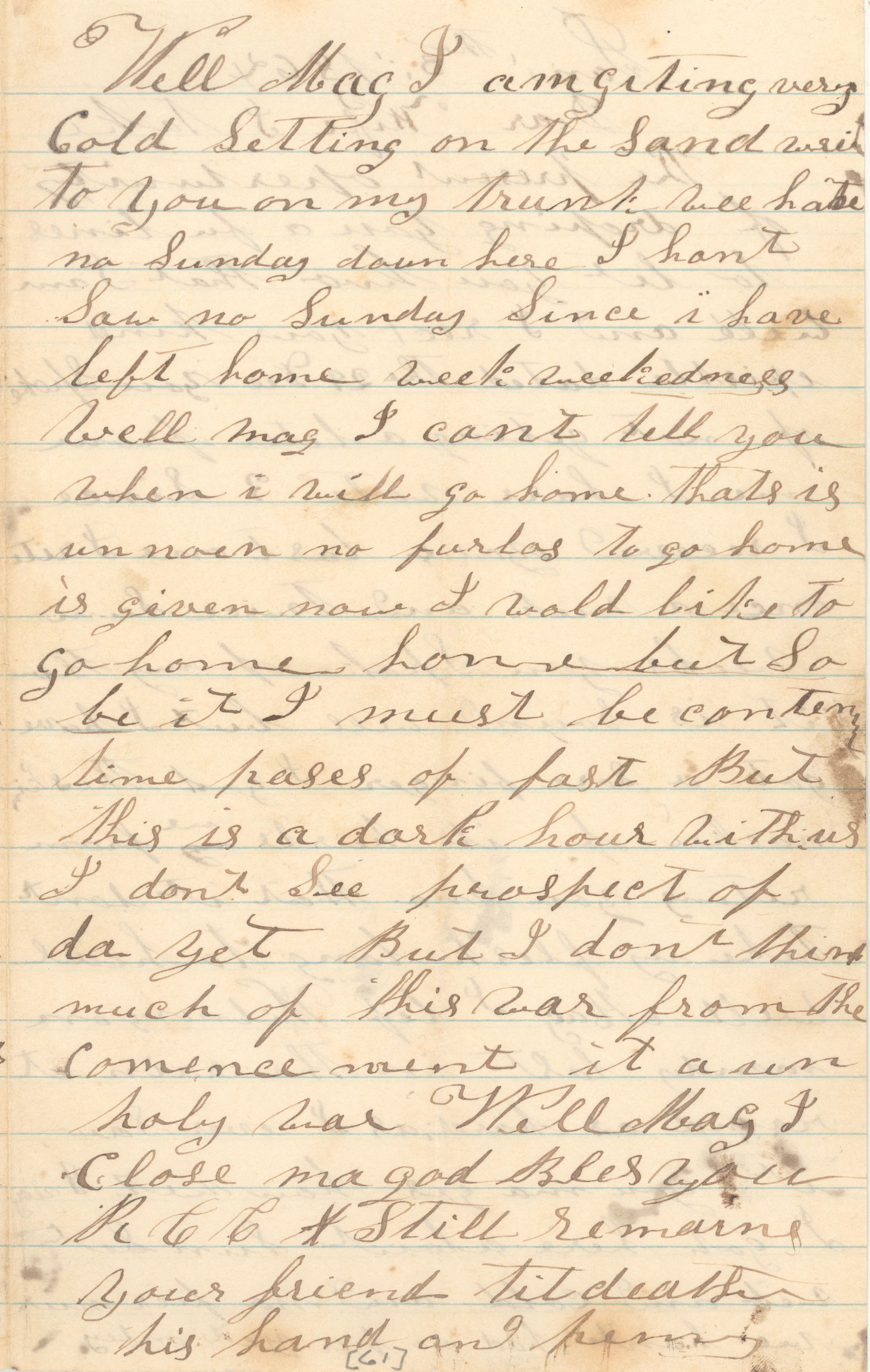 Well Mag I am giting very cold setting on the sand writ to you on my trunk we have no Sunday down here I hant saw no Sunday Since i have left home week weekedness Well Mag I cant tell you when i will go home. that is unnoen no furlos to go home is given now I wold like to go home home but So be it I must be conten time pases of fast but this is a dark hour with us I dont see prospect of da yet but I dont think much of this war from the comencement it a un holy war