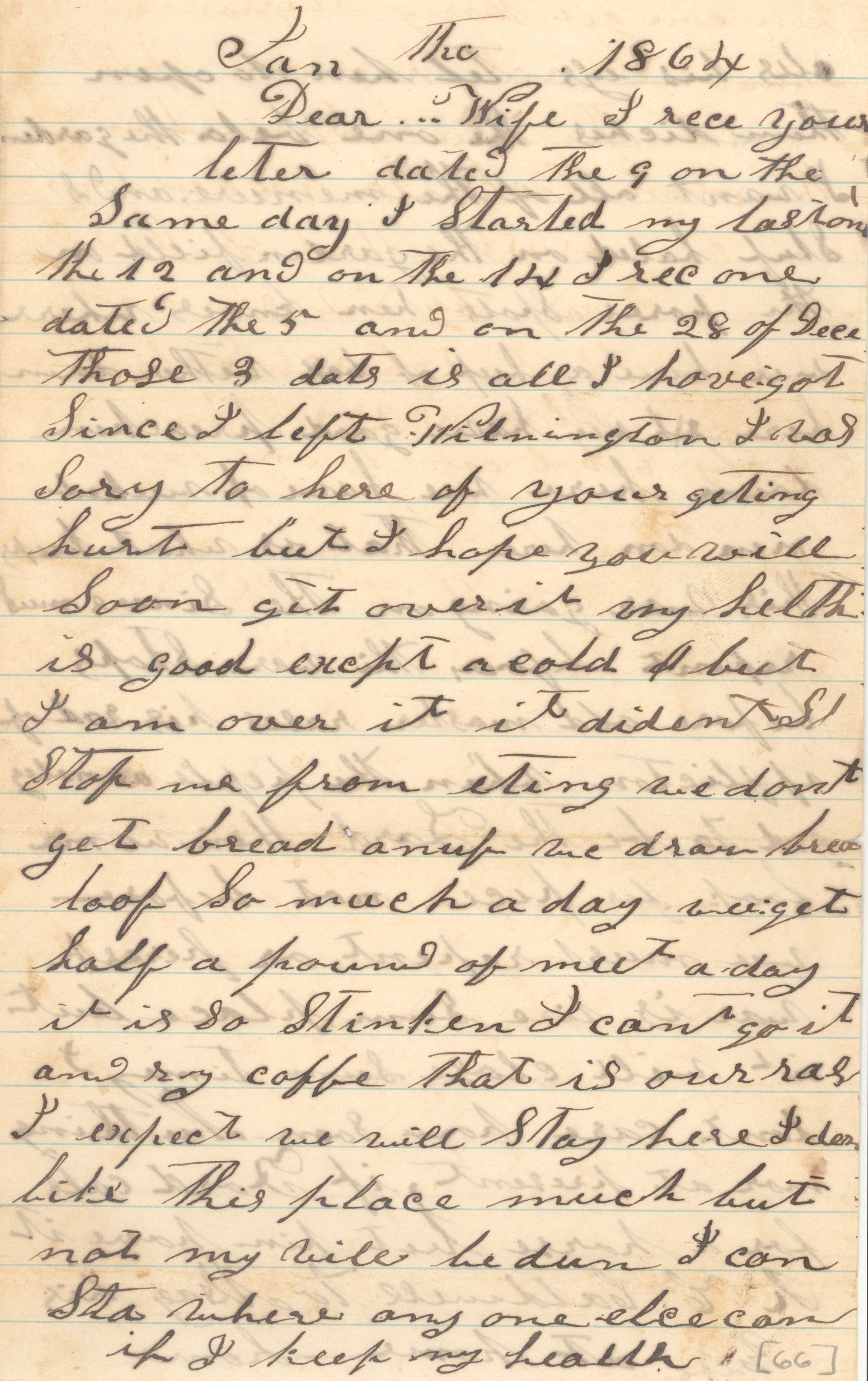 I rece your letter dated the 9 on the Same day I Started my last one the 12 and on the 14 I rec one dated the 5 and on the 28 of Dece those 3 dates is all I have got Since I left Wilmington I was Sory to here of your geting hurt but I hope you will Soon git over it my helth is good except a cold but I am over it it dident Stop me from eting we dont get bread a nuf we draw bred loof So much a day wee get half a pound of meet a day it is So Stinken I cant go it and dry coffe that is our ras I expect we will Stay here I don like this place much but not my will be dun I can sta where anyone elce can if I keep my health