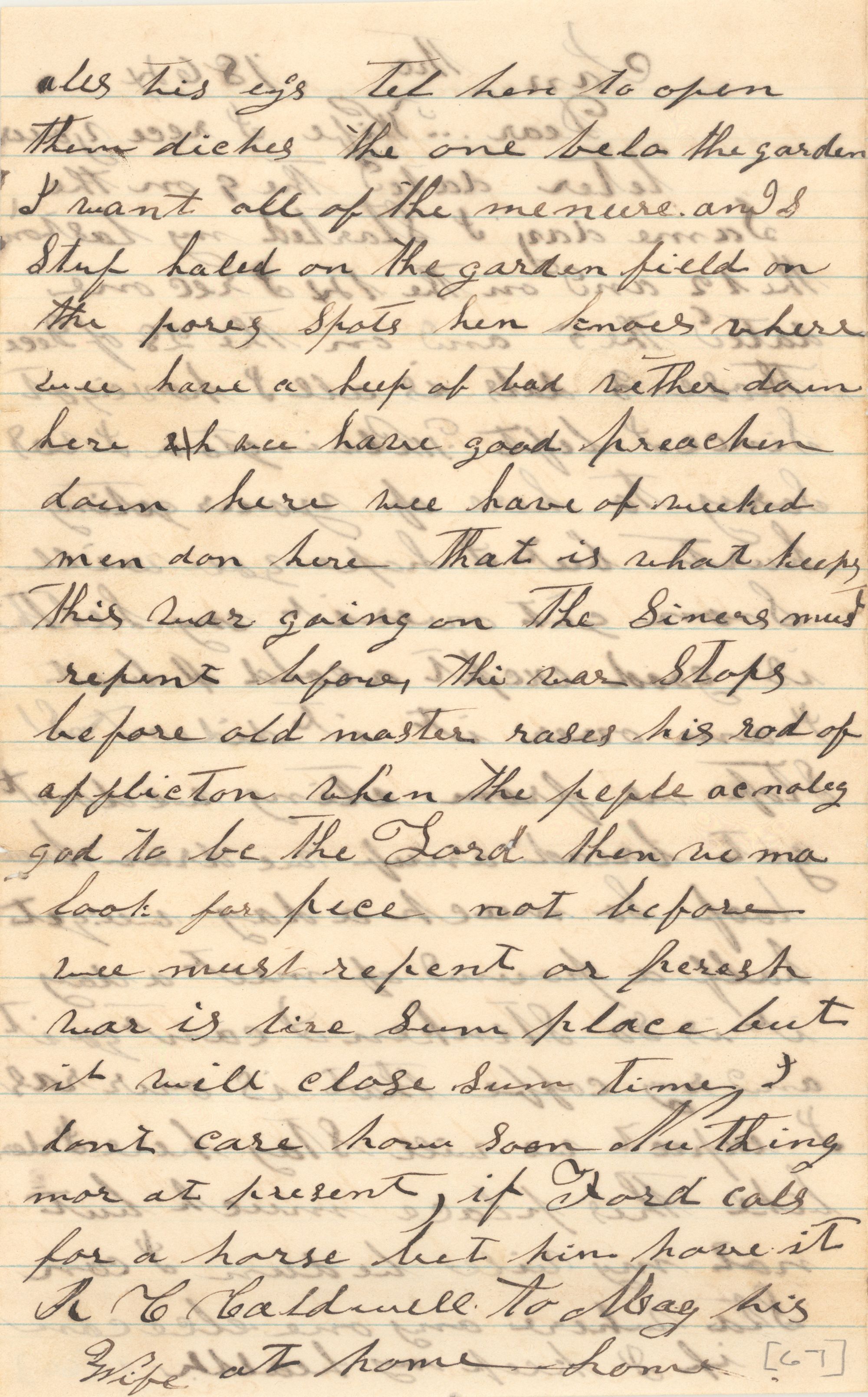 ales his eye tel hen to open them diches the one belo the garden I want all of the menure and Stuf haled on the garden field on the pores Spots hen knows where wee have a heep of bad wether dams here wee have good preachen down here wee have of wicked men don here That is what keeps this war going on The Siners [sinners] must repent bfore this war Stops before old master rases his rod of affliction when the peple acnoleg god to be the Lord then we ma look for pece not before wee must repent or peresh was is tire sum place but it will close sum time I dont care how Soon Nuthing mor at present, if Ford cals for a horse let him have it