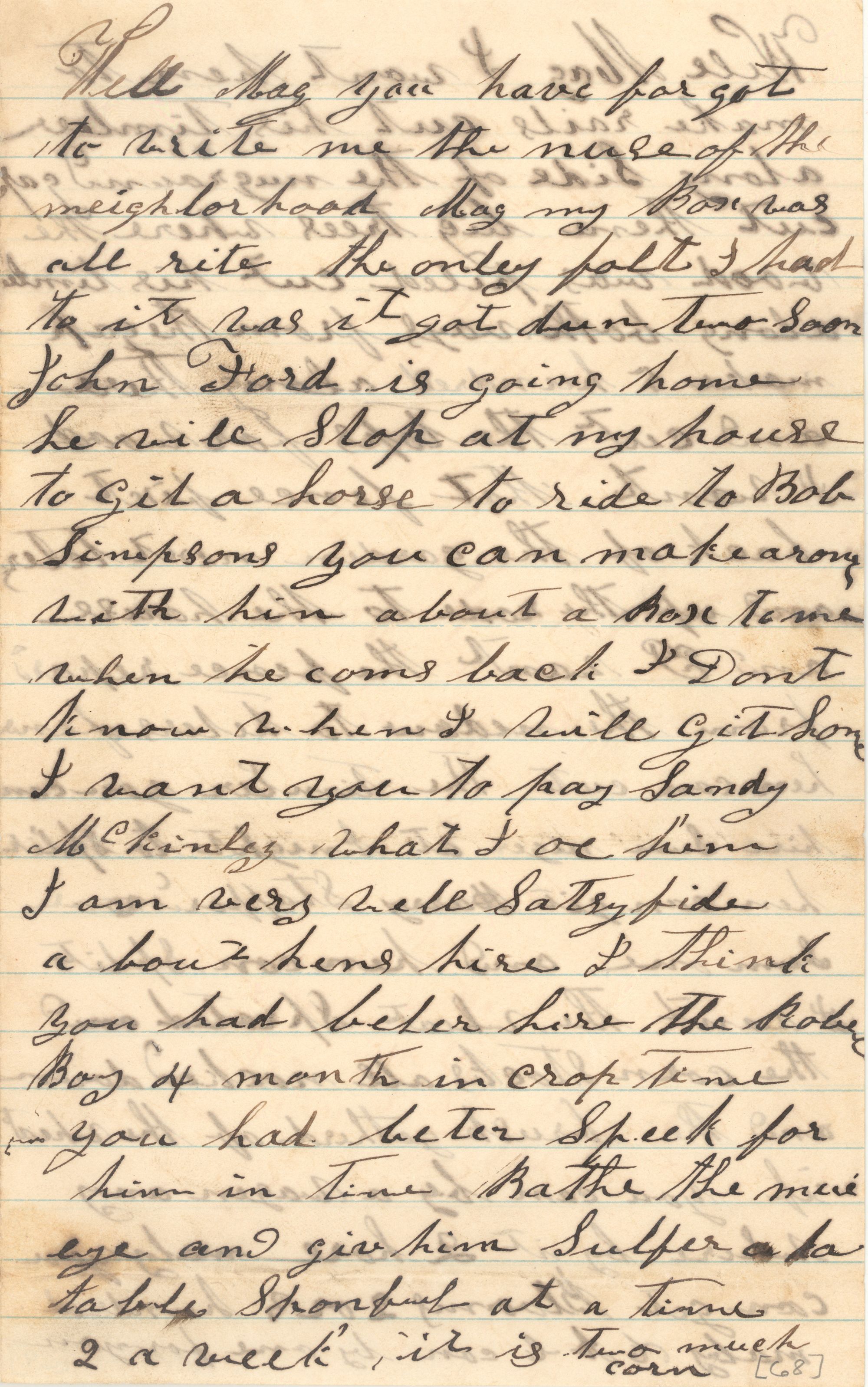 Well Mag you have forgot to write me the nuse of the neighborhood Mag my box was all rite the onley falt I had to it was it got dun two Soon John Ford is going home he will Stop at my house to git a horse to ride to Bob Simpsons you can make arons[note] with him about a box to me when he comes back I dont know when I will git home I want you to pay Sandy McKinley what I oe him I am very well satsyfied a bout Bens hire I think you had beter hire the Robert boy 4 month in crop time you had beter speek for him in time Bathe the mue eye and give him sulfur a table Sponful at a time 2 a week, it is two much corn