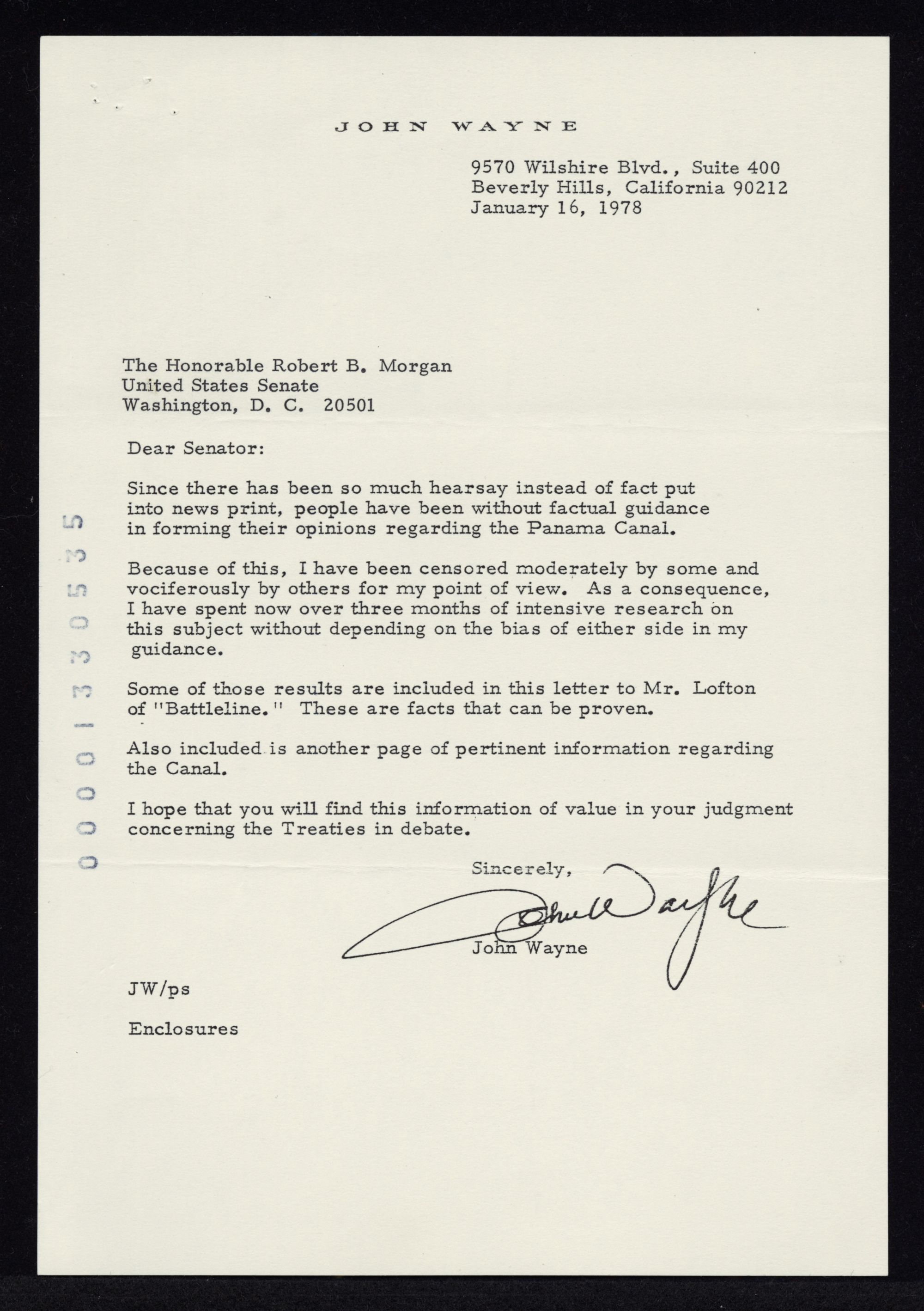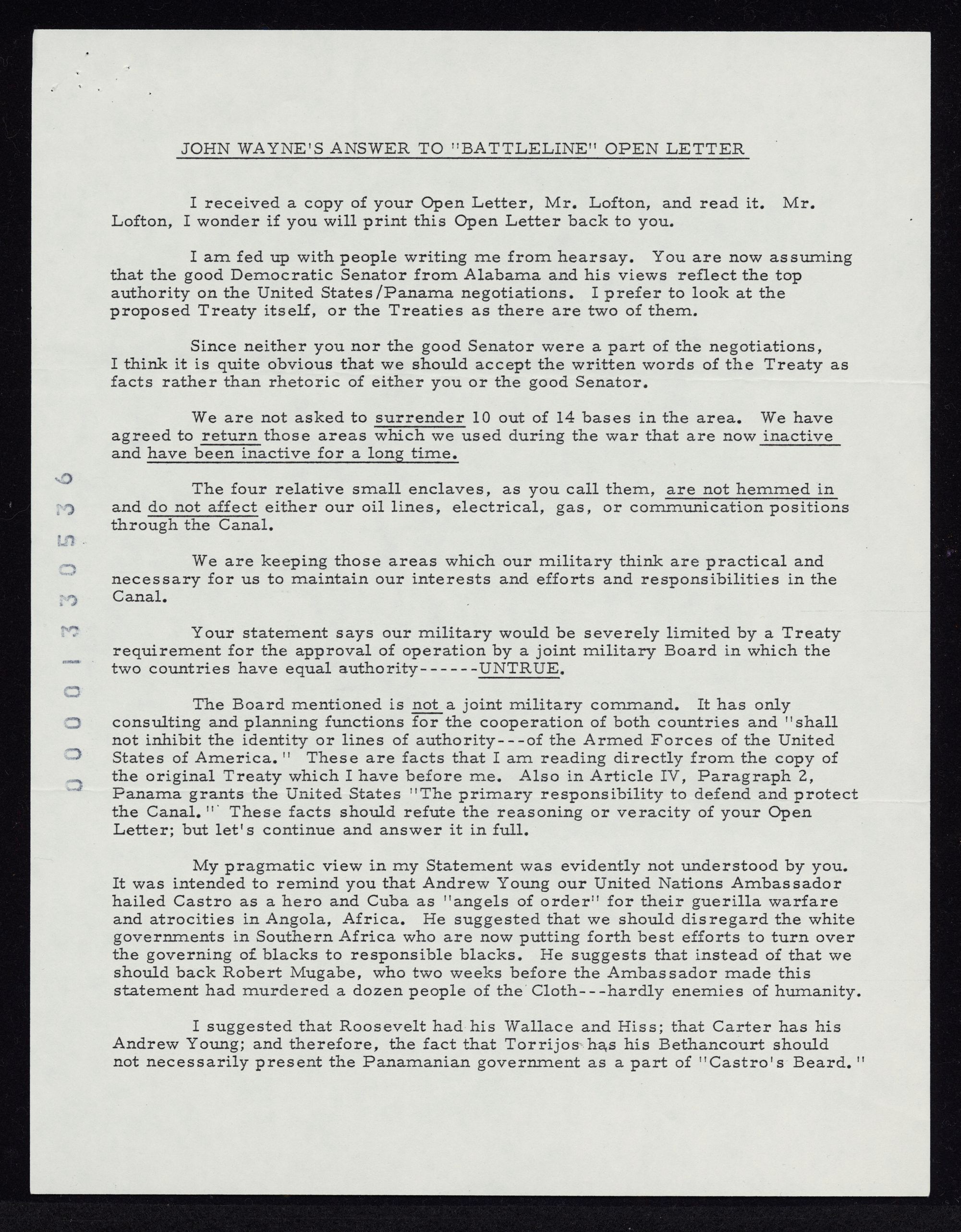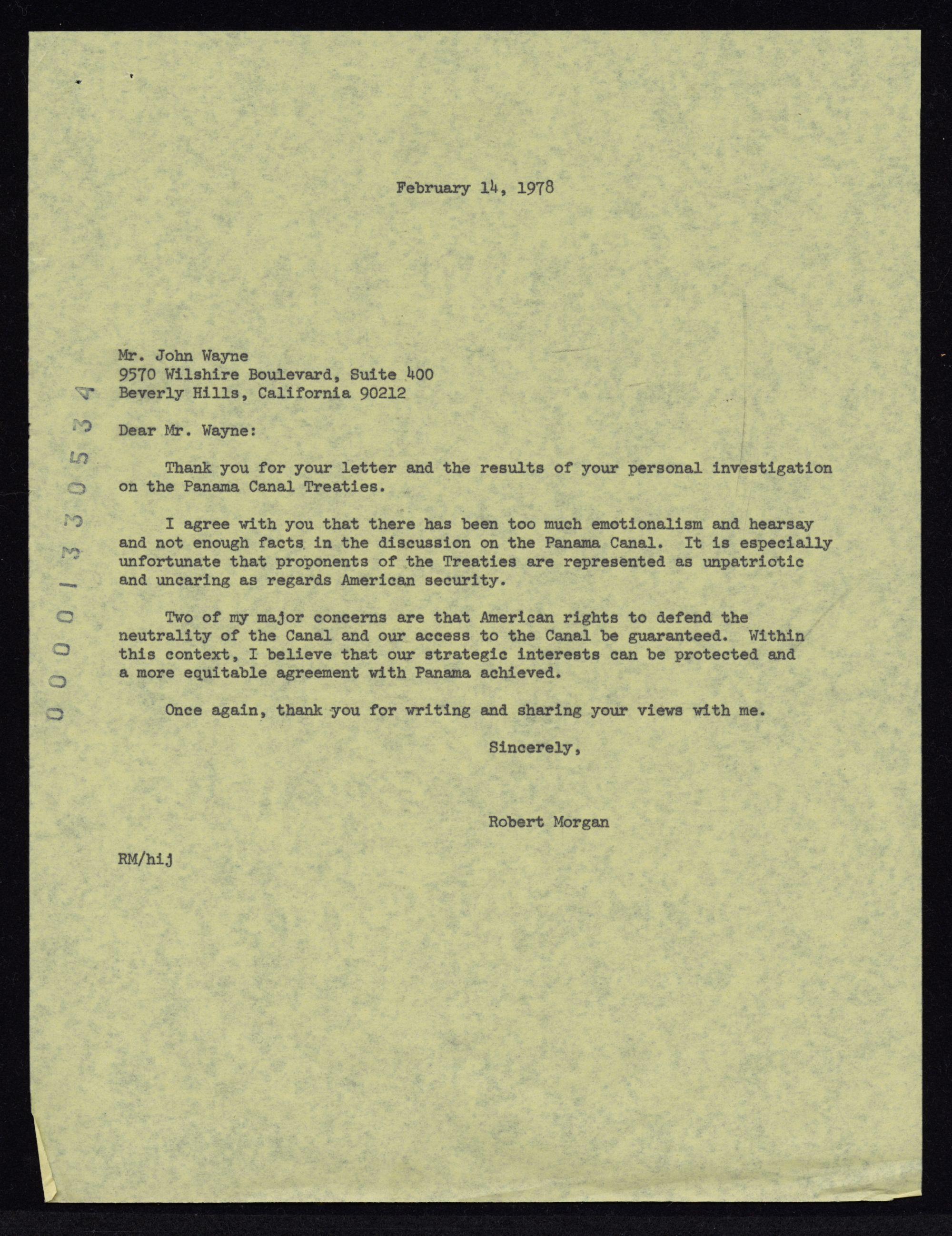 You say that it is a blow to you to learn from the press that I favor the surrender of the Panama Canal. I certainly did not. I was appalled when General Eisenhower did just that and gave the sovereignty of the Canal away by allowing the Panamanian flag to fly there; but at that time, neither Congress, nor the press, nor the conservatives uttered any kind of cry. I did, but it was a voice in the wilderness.