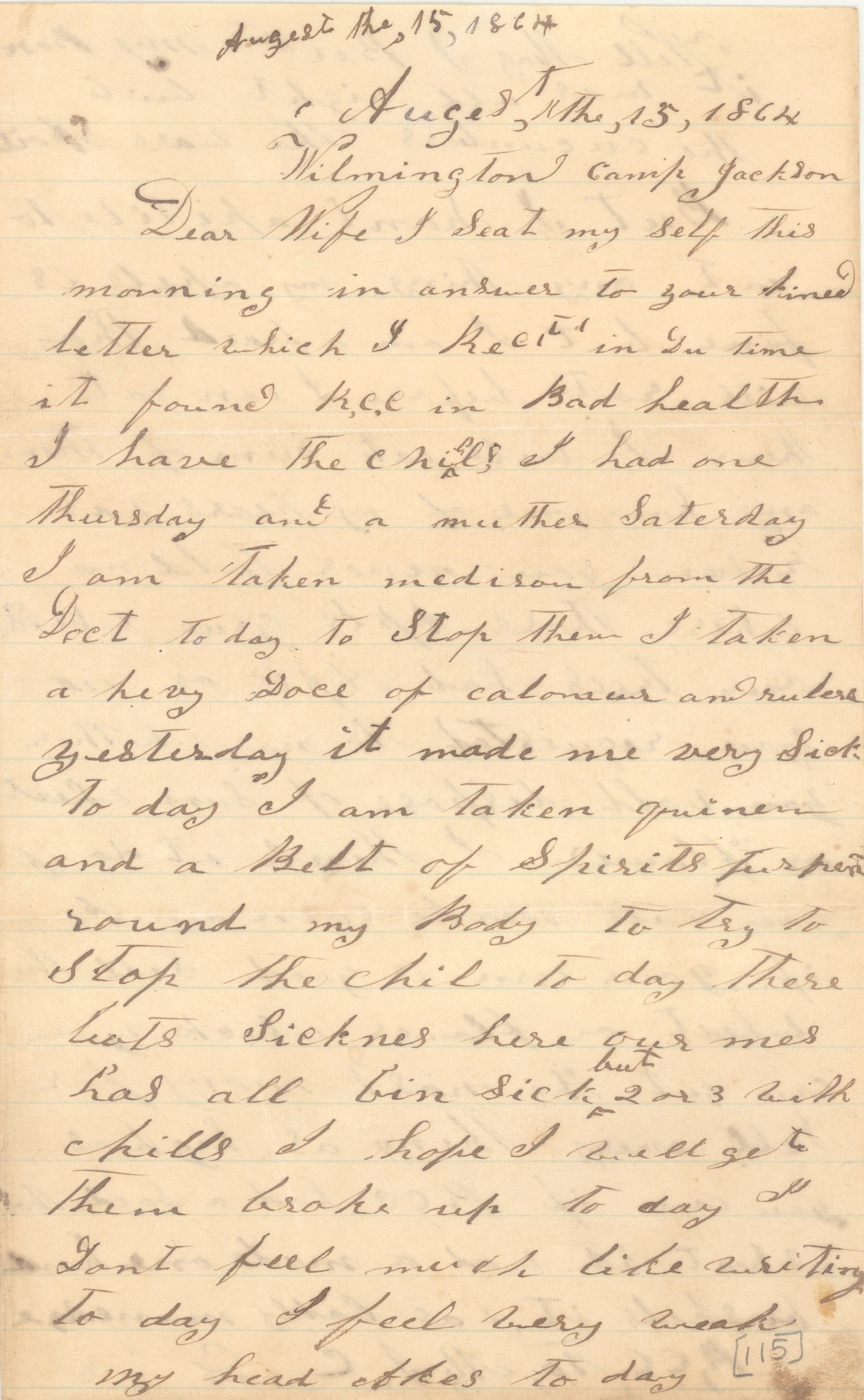 I Seat my Self this morning in answer to your kined letter which I Rec'v in Du time it found R.C.C in Bad health I have the chills I had one Thursday and a muther Saterday I am taken medison from the Doct to day to Stop them I taken a hevy doce of calonseur and rulers yesterday it made me very Sick to day I am taken quinen[note] and a Belt of Spirits of turpen round my Body to try to Stop the chil to day there lots Sicknes here our mes has all bin sick but 2 or 3 with chills I hope I will get them broke up to day I Dont feel much like writing to day I feel very weak my head Akes to day