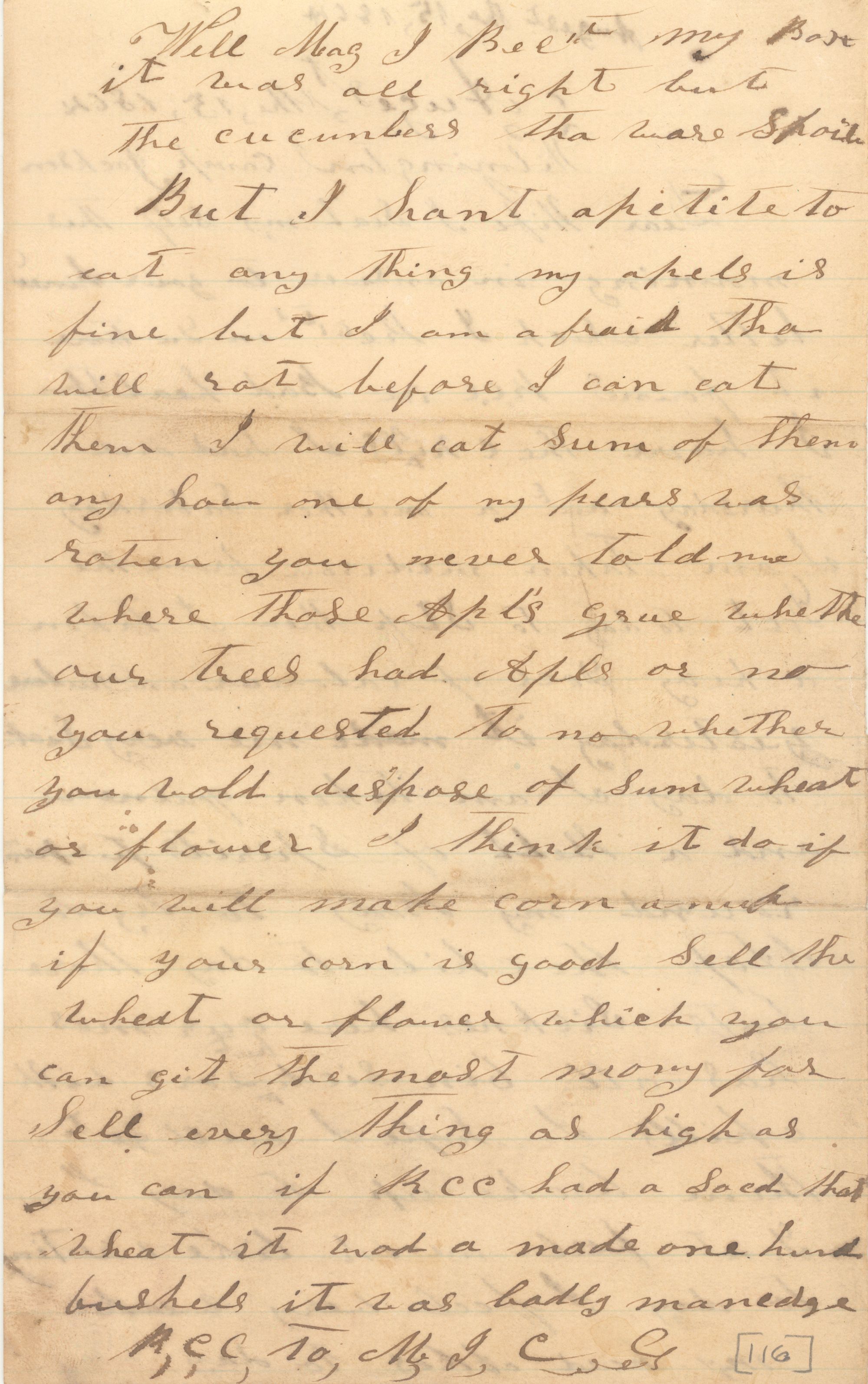 Well Mag I Recd my Box it was all right but the cucunbers tha were Spoild But I hant apetite to eat any thing my apels is fine but I am afraid tha will rot before I can eat them I will eat sum of them any how one of my pears was roten you never told me where those Apl's grue whether our trees had Apls or no you requested to no whether you wold despose of sum wheat or flower I think it do it you will make corn anuf if your corn is good Sell the wheat or flower which you can git the most mony for Sell every thing as high as you can if R C C had a soed that wheat it wod a made one hund bushels it was badly manedge