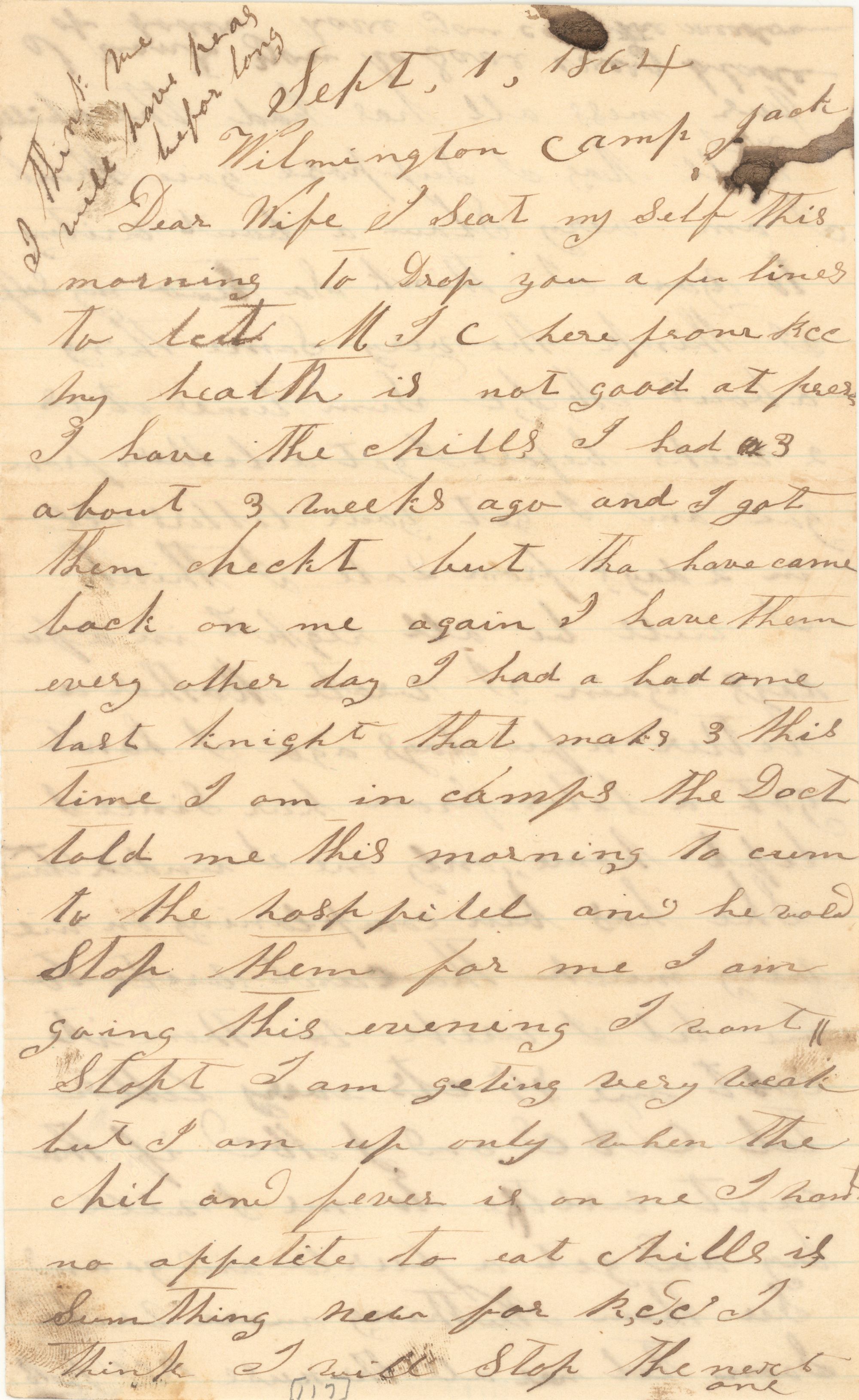 I Seat my Self this morning to Drop you a fu lines to let MIC here from R.C.C. my health is not good at presen I have the chills I had 3 about 3 weeks ago and I got them checkt but tha have came back on me again I have them every other day I had a had one last knight that maks 3 this time I am in camps the Doct told me this morning to cum to the hosppitel and he wold Stop them for me I am going this evening I want,, Stopt I am geting very weak but I am up only when the chil and fever is on me I hant no appetite to eat chills is Sumthing new for R.C.C. I think I will stop the next one