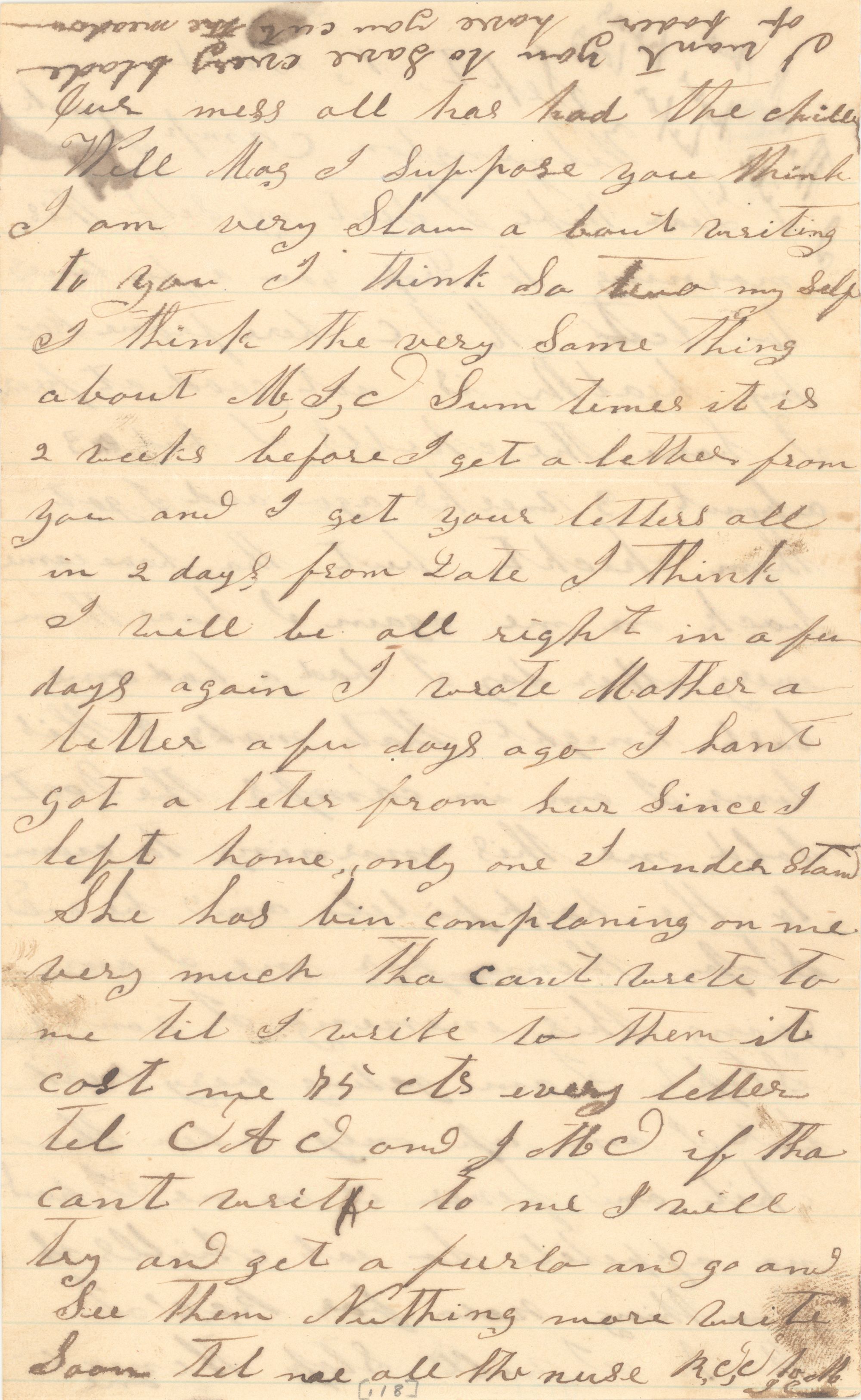 Our mess all has had the chills Well Mag I Suppose you think I am very slow a bout writing to you I think so two my Self I think the very same thing about M.I.C. Sum times it is 2 weeks before I get a letter from you and I get your letters all in 2 days from date I think I will be all right in a fu days again I wrote Mother a letter a fu days ago I hant got a letter from hur Since I left home,, only one I under stand She has bin complaning on me very much tha cant write to me til I write to them it cost me 15 cts every letter tel C.A.C. and J.M.C. if tha cant write to me I will try and get a fur low and go and see them
