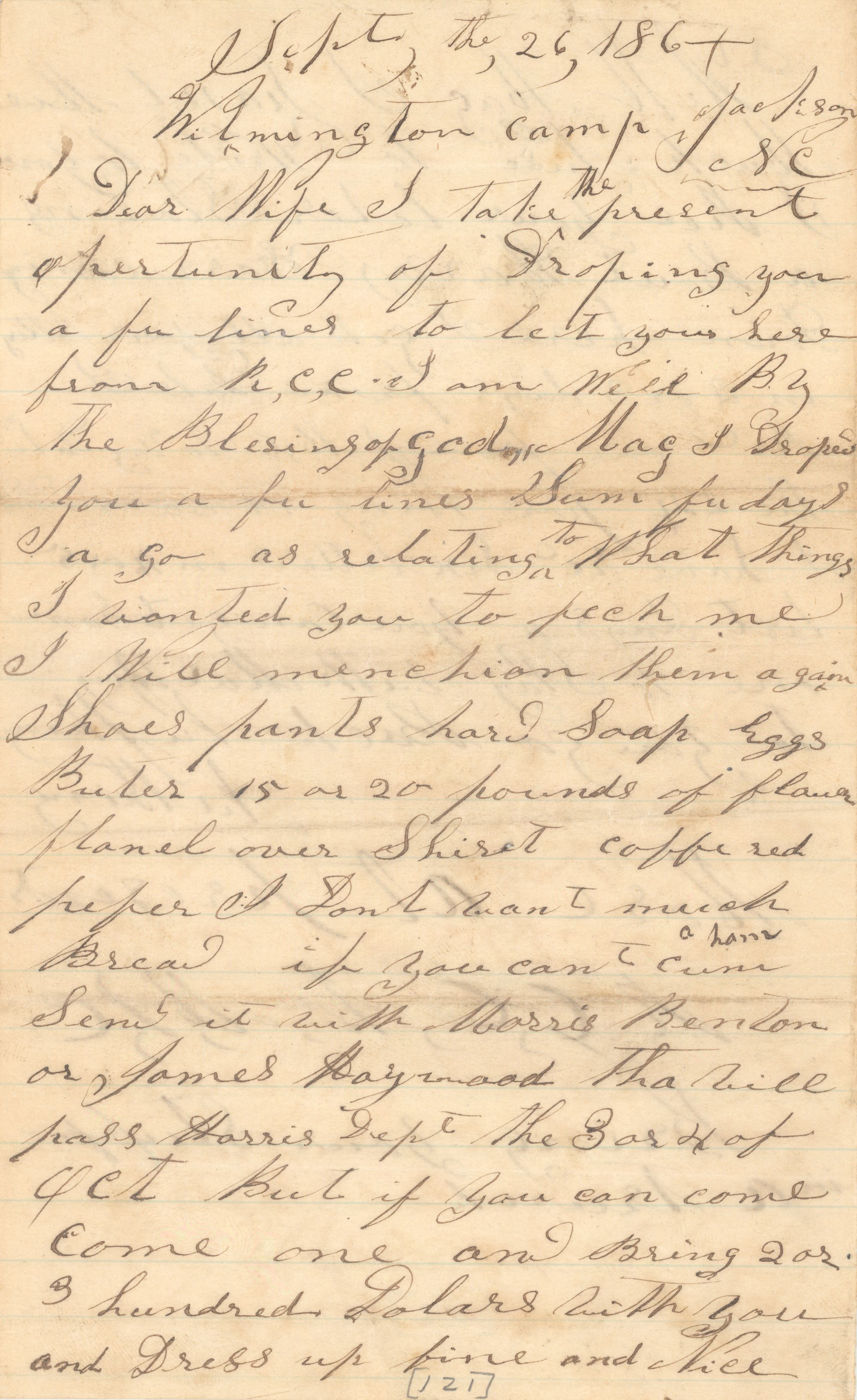 I take the present opertunity of Droping you a fu lines to let you here from R.C.C I am well By the Blesing of god,, Mag I droped you a fu lines Sum fu days a go as relating to What things I wanted you to fech me I Will menction them again Shoes pants hard Soap eggs buter 15 or 20 pounds of flour flanel over Shirt coffe red peper I dont want much bread if you cant (note: between lines on paper - "a ham") cum send it with Morris Benton or James Haywood tha will pass Harris Dept the 3 or 4 of Oct but if you can come come one and Bring 2 or 3 hundred Dolars with you and Dress up fine and Nice